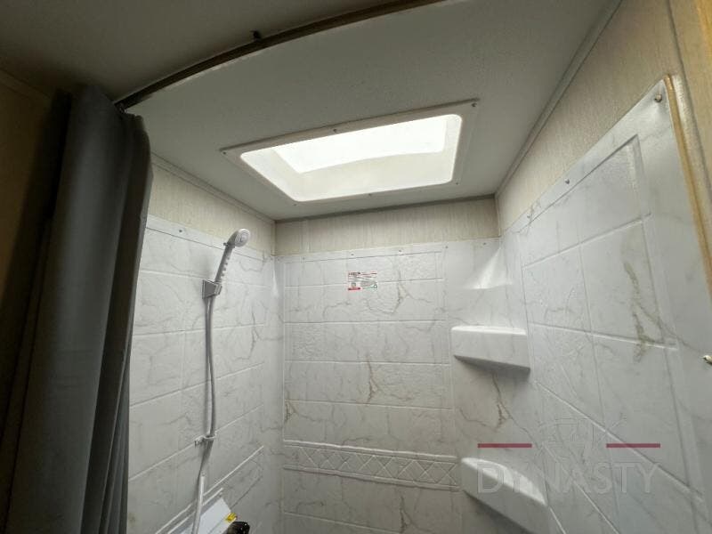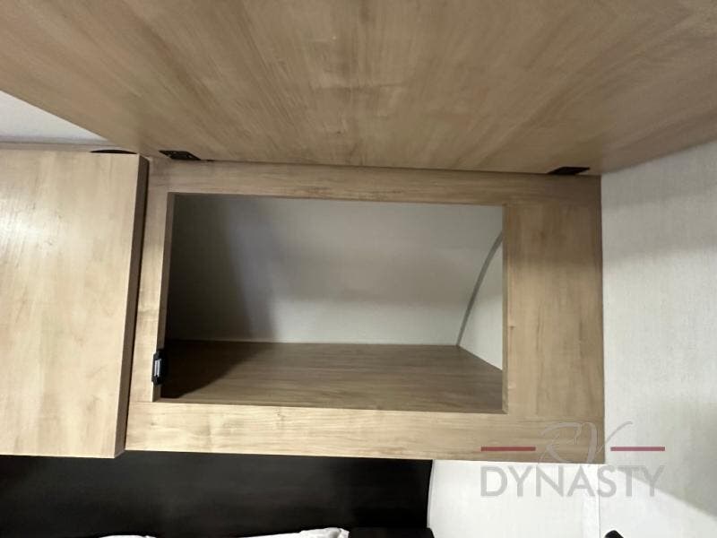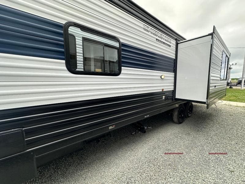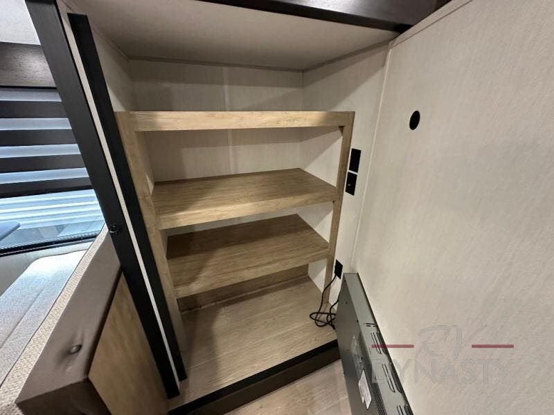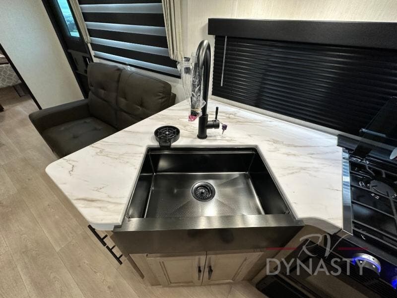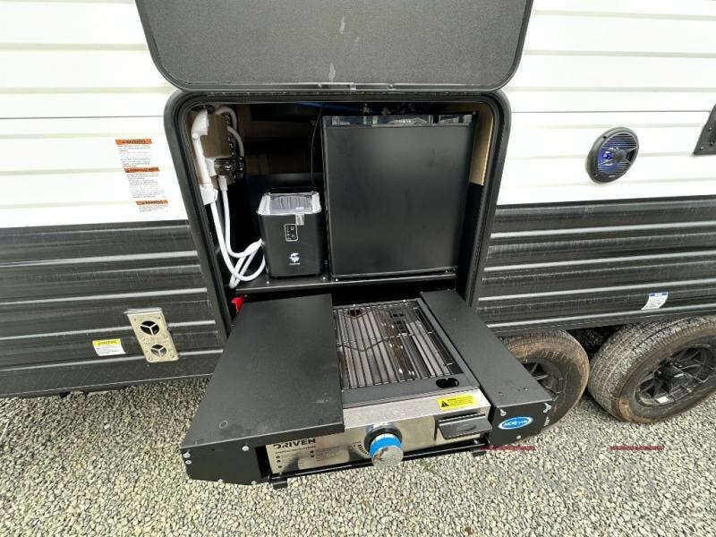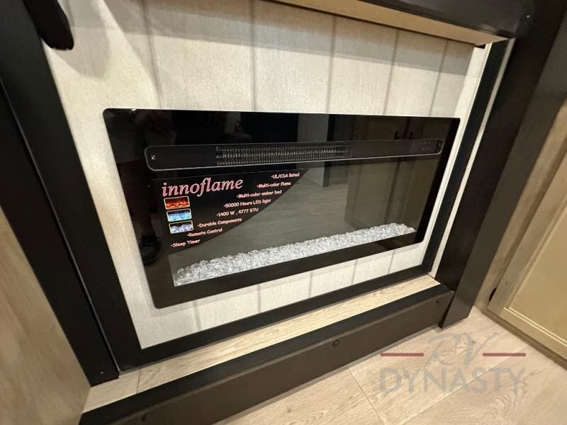 You'll love every minute spent in this single slide out travel trailer, whether you're cooking dinner on the outside kitchen or in the rear kitchen, relaxing on the sofa across from the fireplace, or sleeping on the RV king bed in the front master bedroom! There are hidden shelves behind the fireplace for convenient storage, and the booth dinette within the slide provides a place to dine together. The walk-thru bath is spacious, and includes a tub/shower, toilet, and sink with counter space.