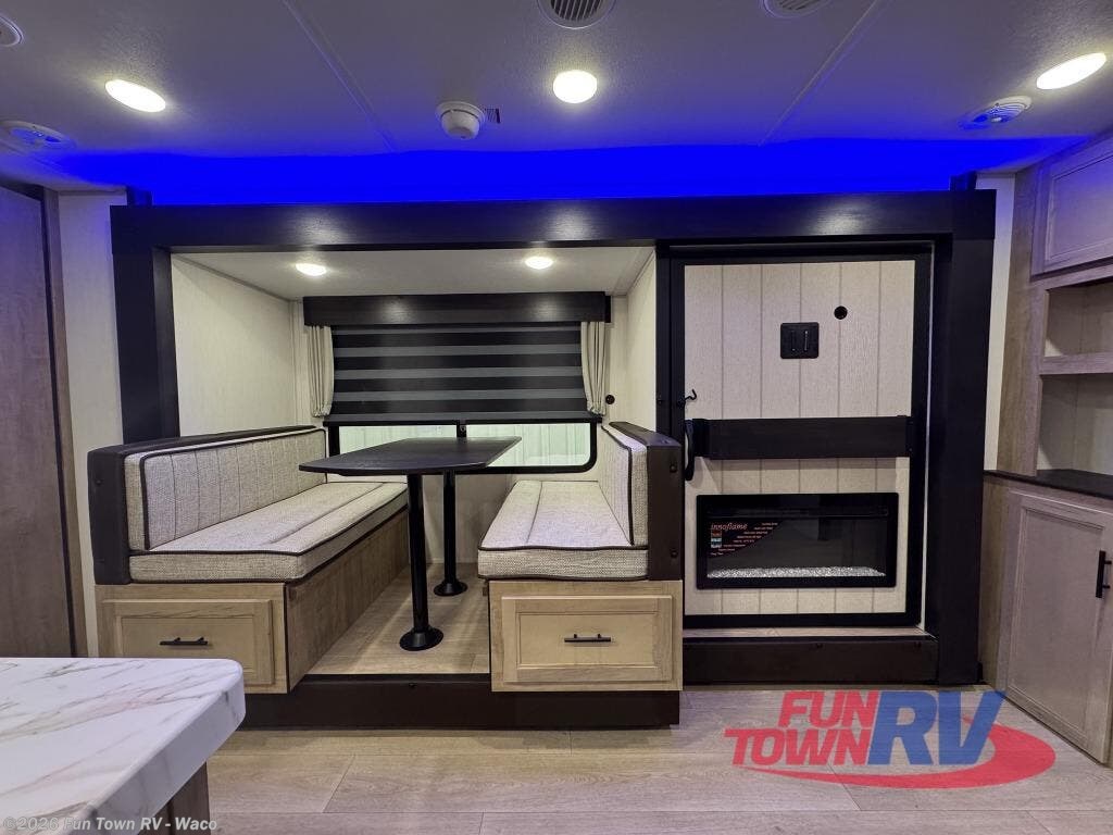 You'll love every minute spent in this single slide out travel trailer, whether you're cooking dinner on the outside kitchen or in the rear kitchen, relaxing on the sofa across from the fireplace, or sleeping on the RV king bed in the front master bedroom! There is a hidden pantry behind the fireplace for convenient storage, and the booth dinette within the slide provides a place to dine together. The walk-thru bath is spacious, and includes a tub/shower, toilet, and sink with counter space.
