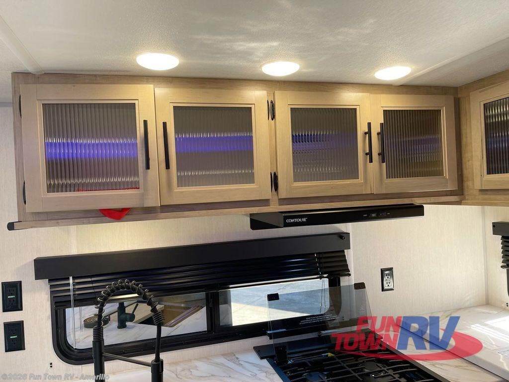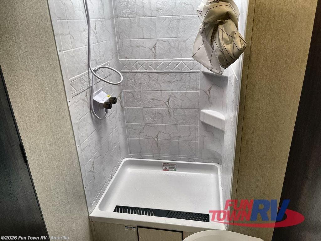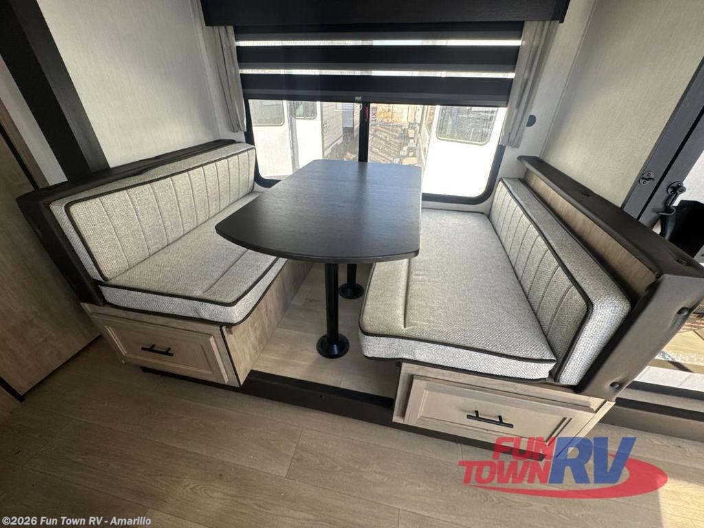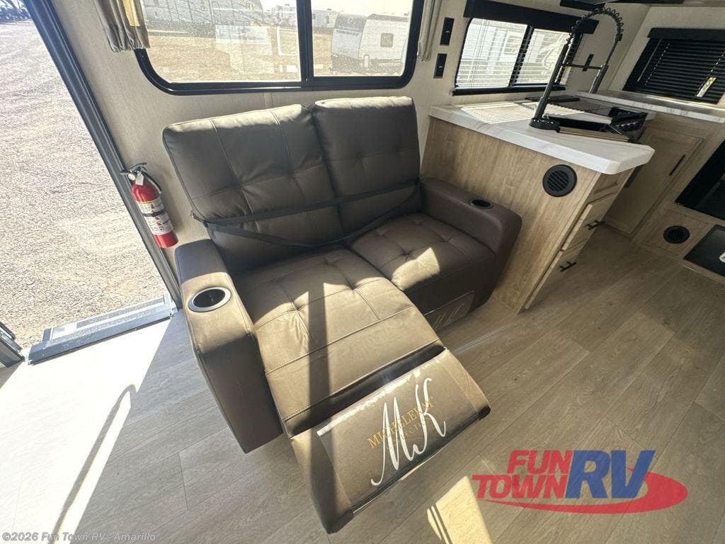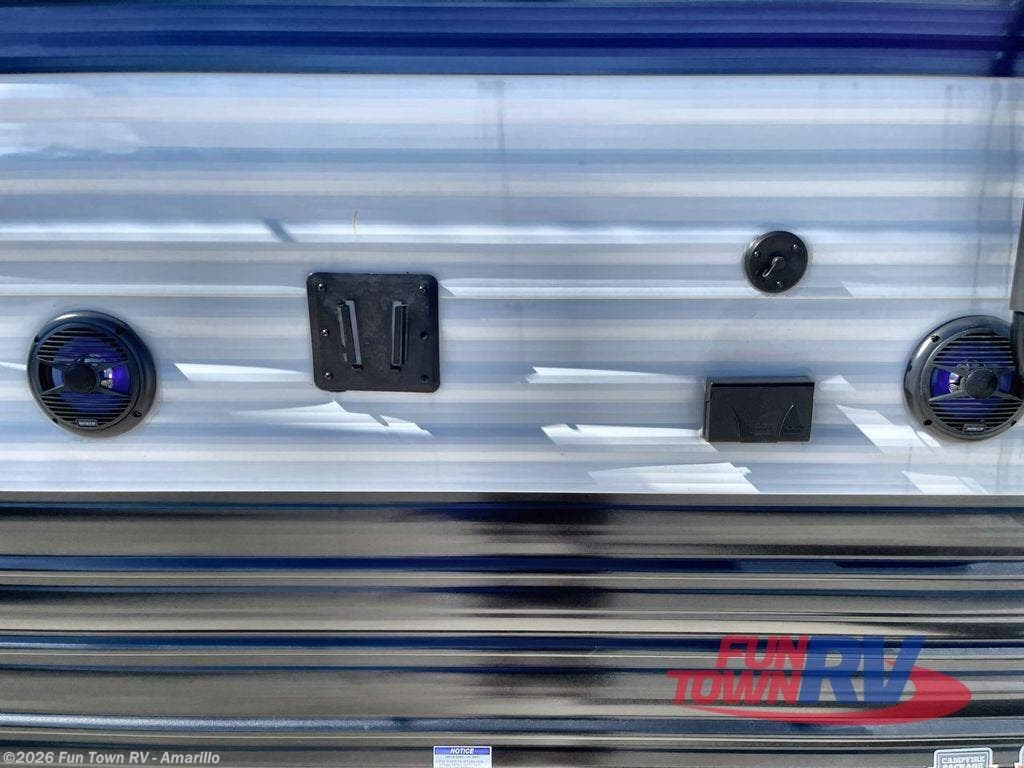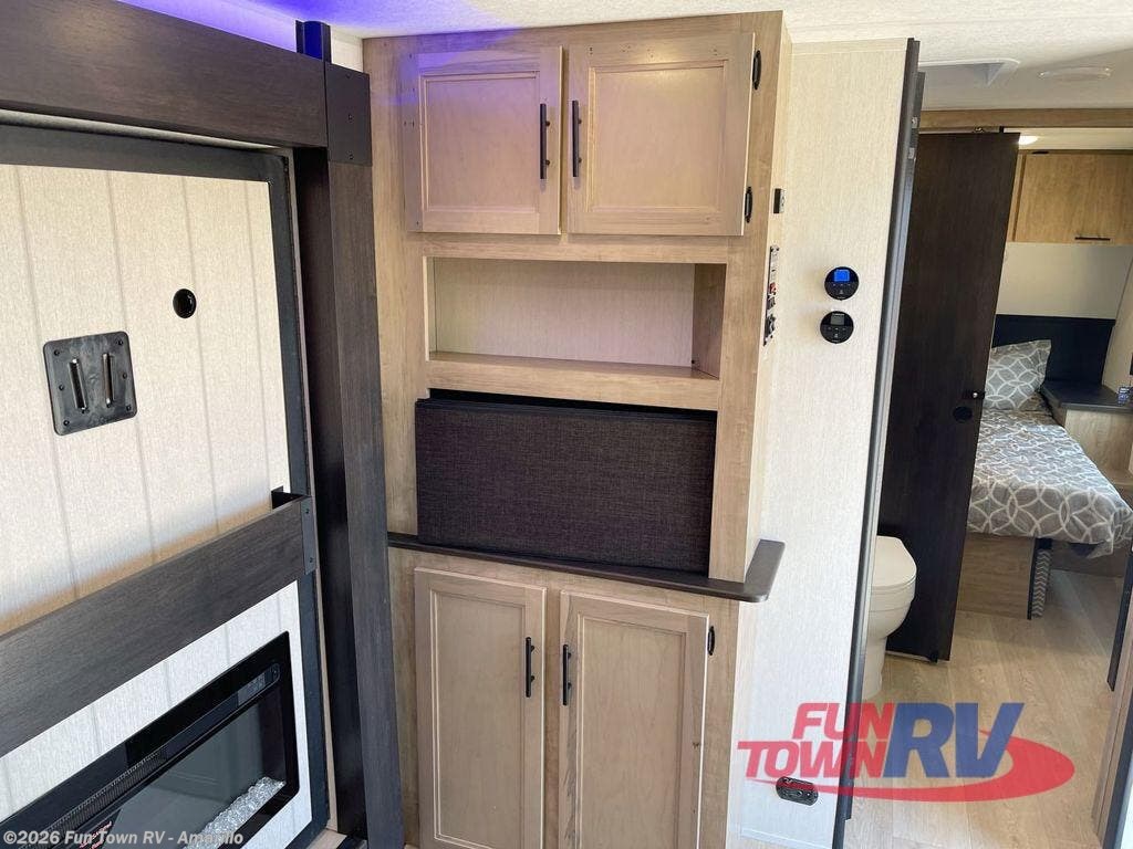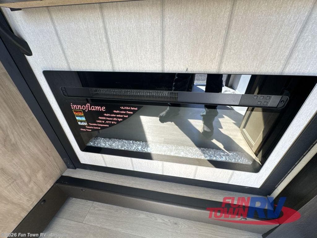 You'll love every minute spent in this single slide out travel trailer, whether you're cooking dinner on the outside kitchen or in the rear kitchen, relaxing on the sofa across from the fireplace, or sleeping on the RV king bed in the front master bedroom! There is a hidden pantry behind the fireplace for convenient storage, and the booth dinette within the slide provides a place to dine together. The walk-thru bath is spacious, and includes a tub/shower, toilet, and sink with counter space.