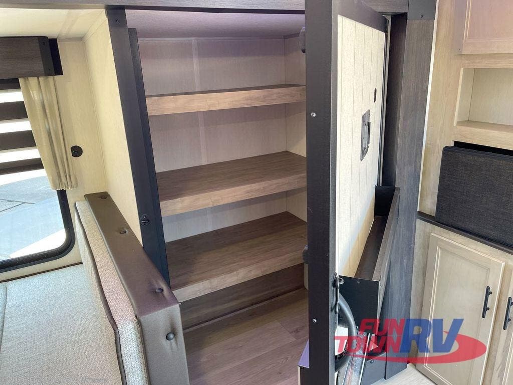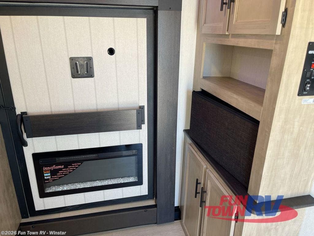 You'll love every minute spent in this single slide out travel trailer, whether you're cooking dinner on the outside kitchen or in the rear kitchen, relaxing on the sofa across from the fireplace, or sleeping on the RV king bed in the front master bedroom! There is a hidden pantry behind the fireplace for convenient storage, and the booth dinette within the slide provides a place to dine together. The walk-thru bath is spacious, and includes a tub/shower, toilet, and sink with counter space.