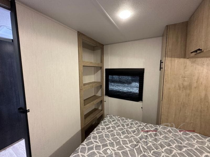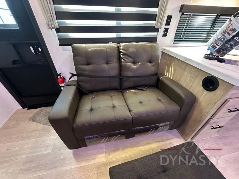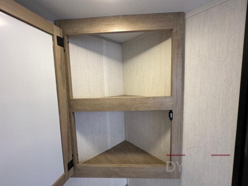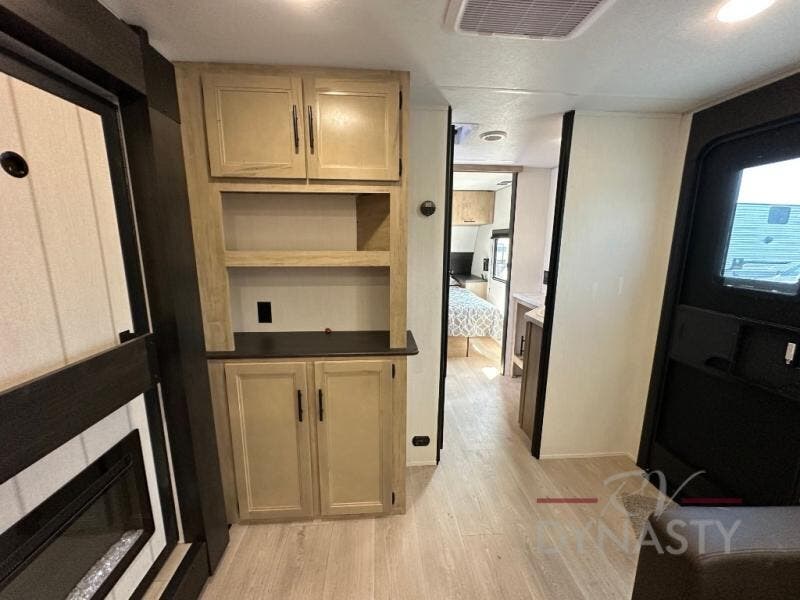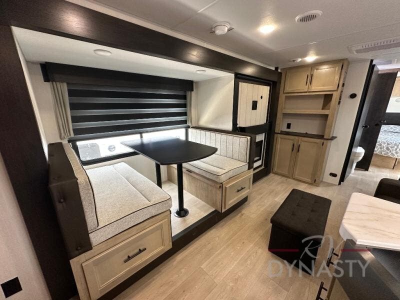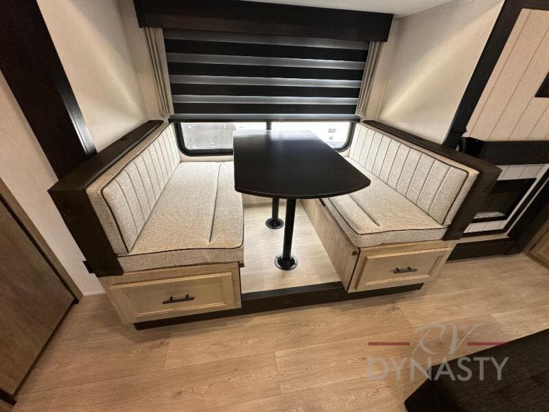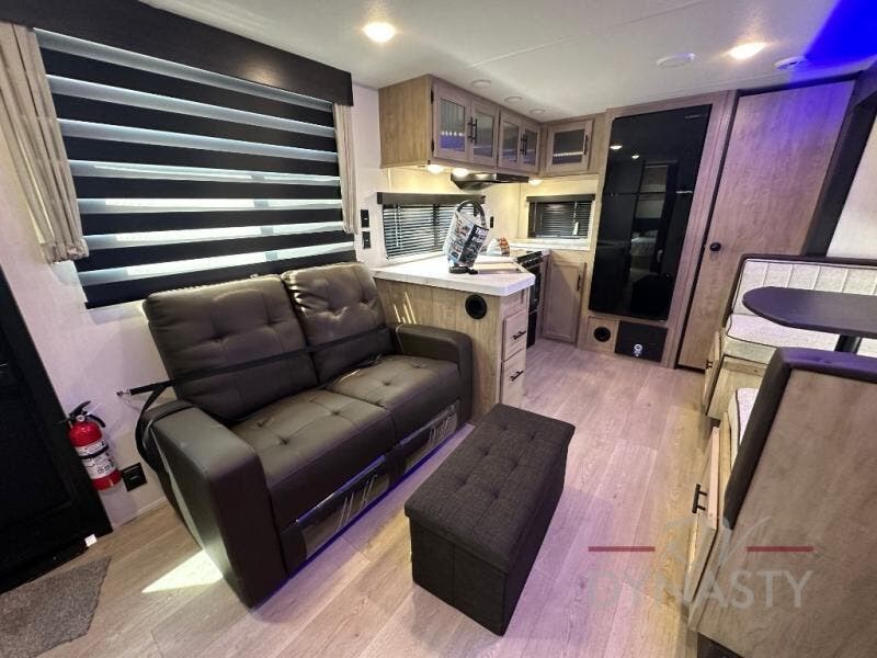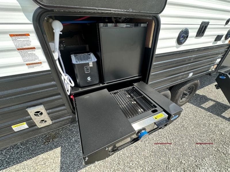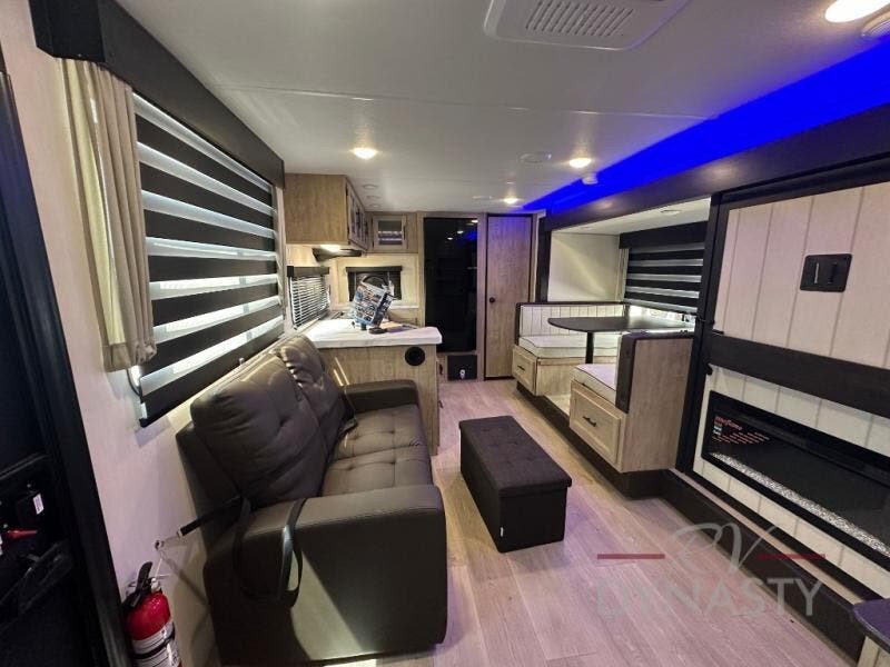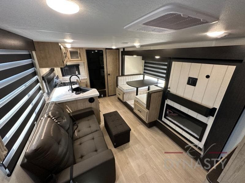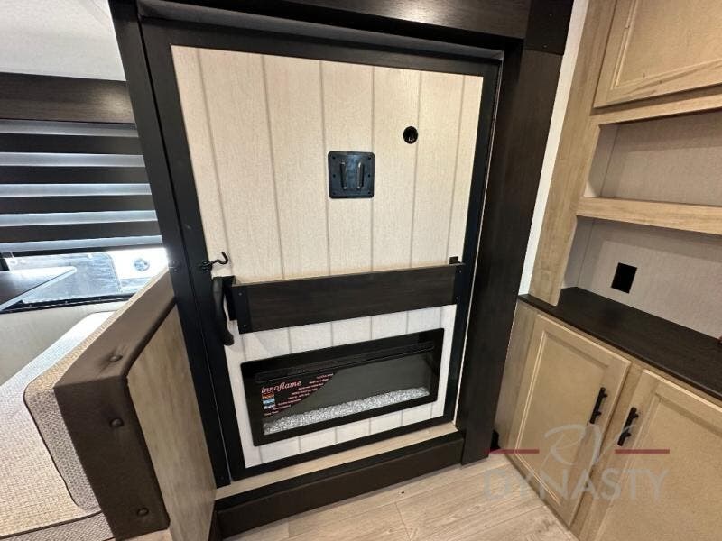 You'll love every minute spent in this single slide out travel trailer, whether you're cooking dinner on the outside kitchen or in the rear kitchen, relaxing on the sofa across from the fireplace, or sleeping on the RV king bed in the front master bedroom! There are hidden shelves behind the fireplace for convenient storage, and the booth dinette within the slide provides a place to dine together. The walk-thru bath is spacious, and includes a tub/shower, toilet, and sink with counter space.