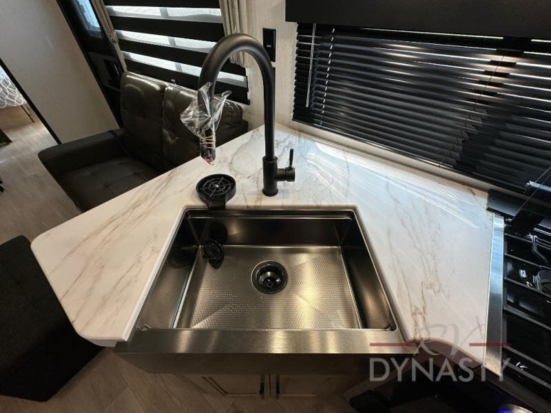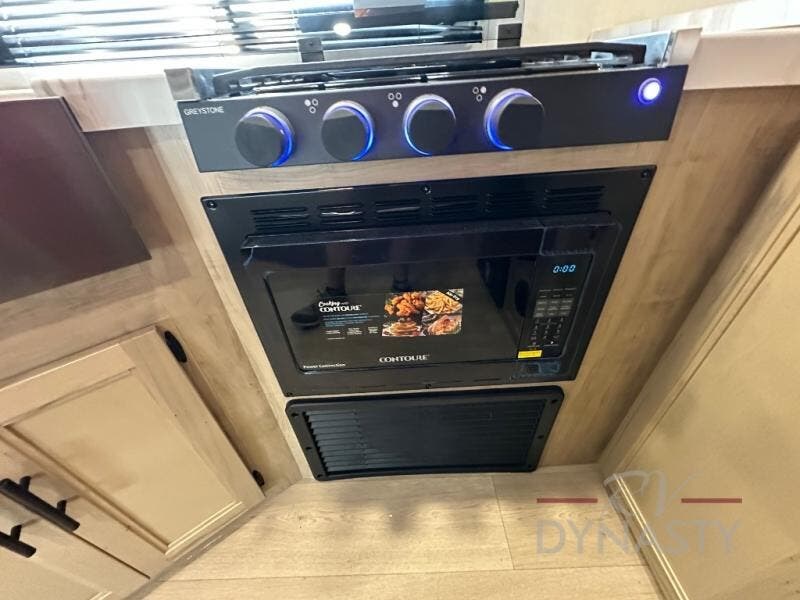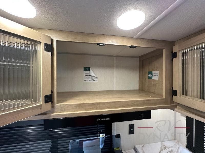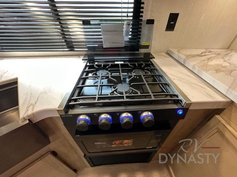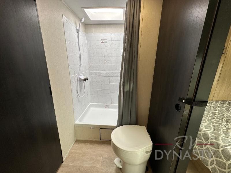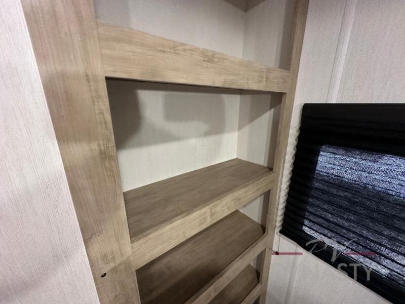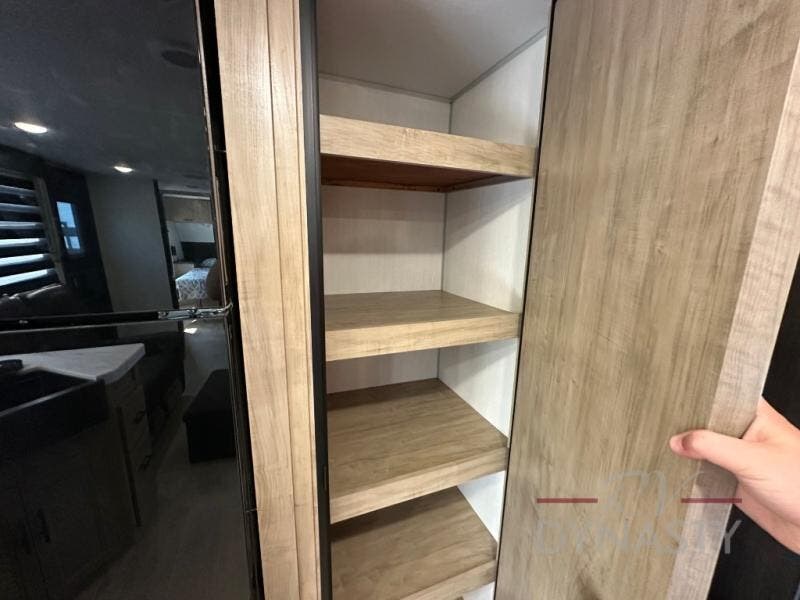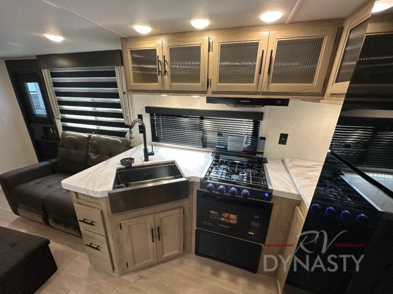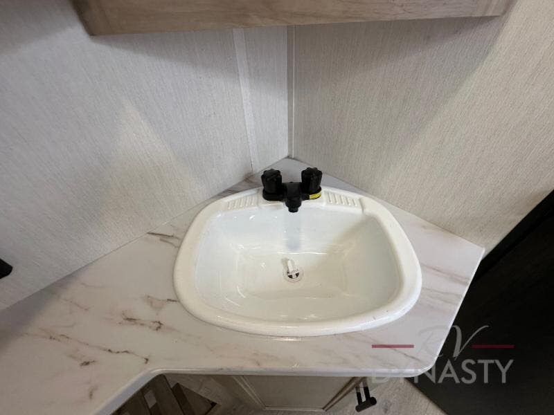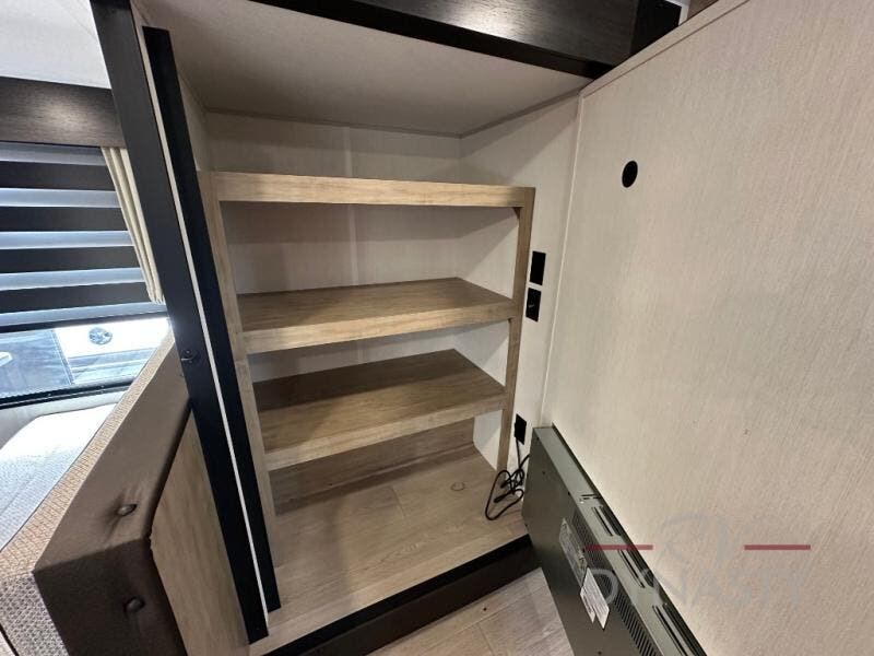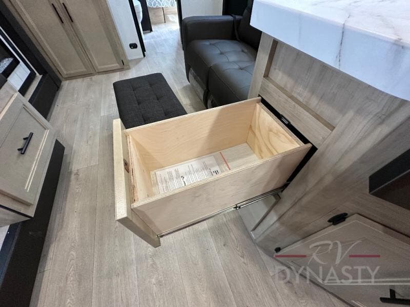 You'll love every minute spent in this single slide out travel trailer, whether you're cooking dinner on the outside kitchen or in the rear kitchen, relaxing on the sofa across from the fireplace, or sleeping on the RV king bed in the front master bedroom! There are hidden shelves behind the fireplace for convenient storage, and the booth dinette within the slide provides a place to dine together. The walk-thru bath is spacious, and includes a tub/shower, toilet, and sink with counter space.