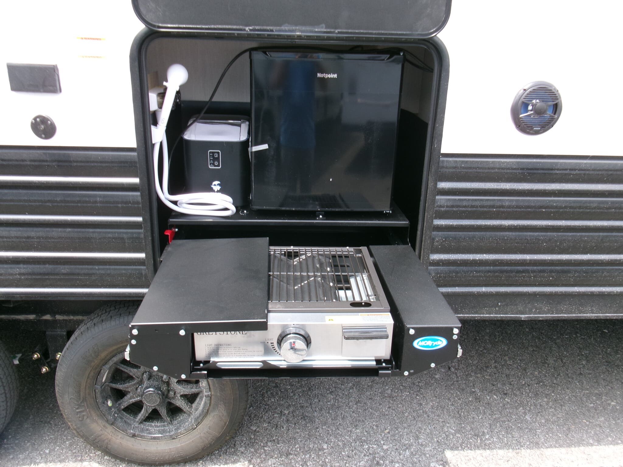Awning, Backup Monitor, External Shower, Leveling Jacks, Outside Kitchen, Skylight, Slideout, Spare Tire Kit -