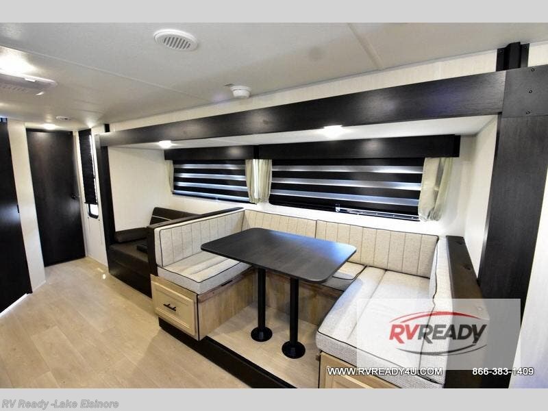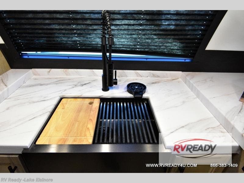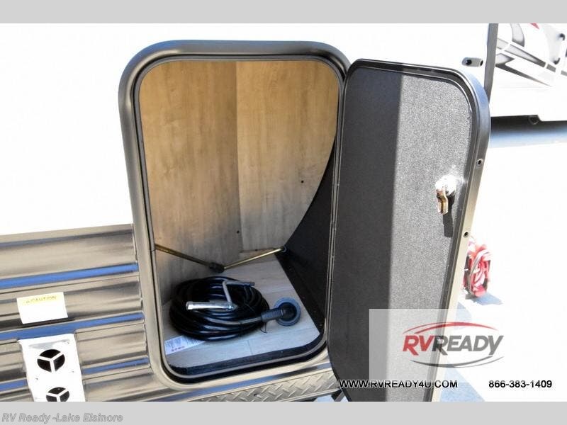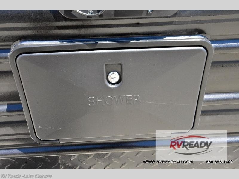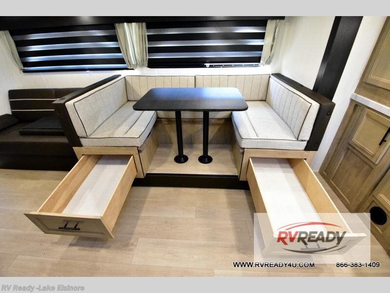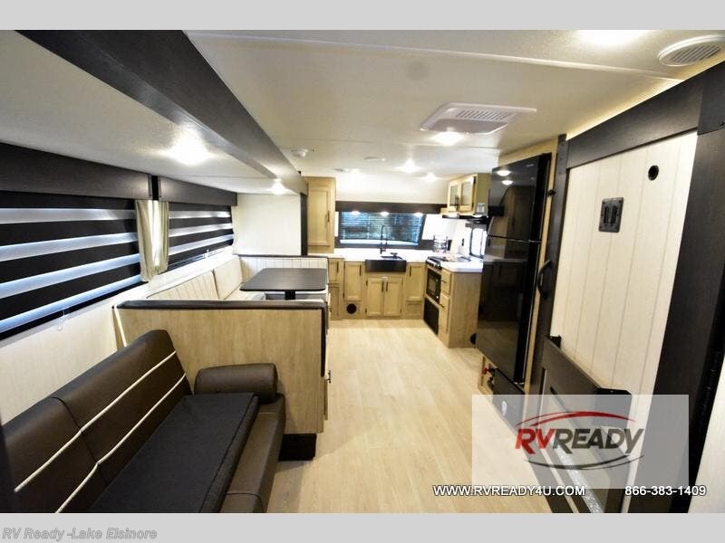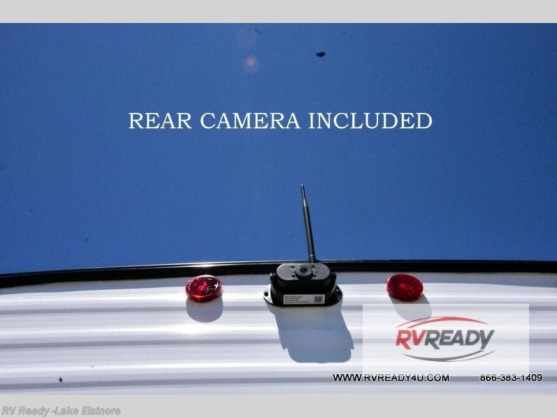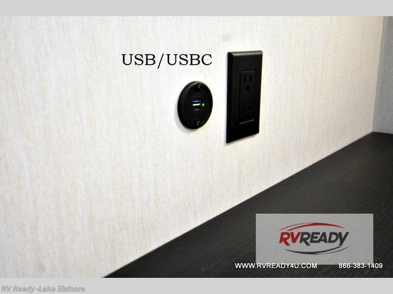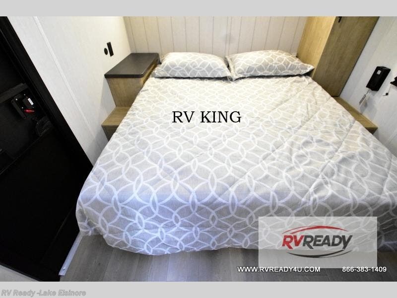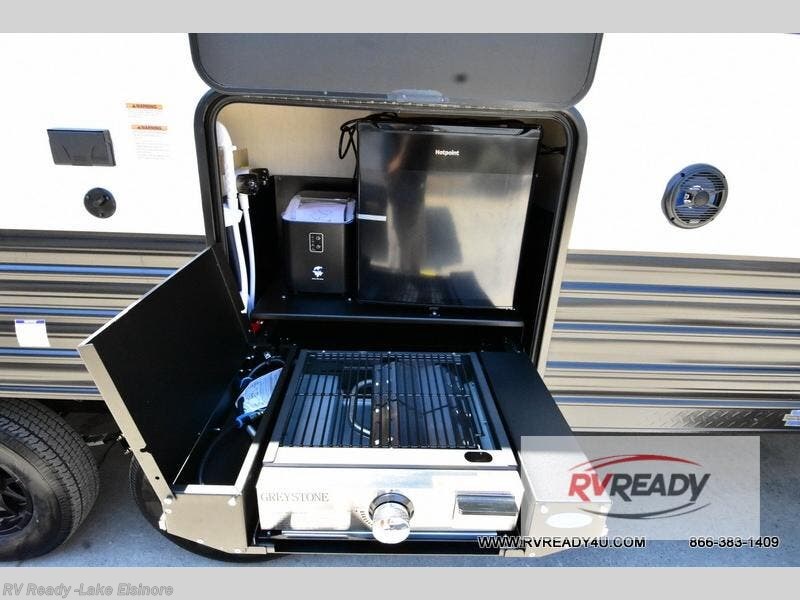 Since this travel trailer features dual entry doors, you can enter in through the rear master bedroom or the front kitchen; how convenient! The kitchen includes ample counter space and all the appliances to prep meals, along with a pantry up front and a hidden pantry behind the fireplace. Your crew can get comfortable on the sofa or play a game around the U-shaped dinette, although you may just find yourselves outdoors since there is an outside kitchen and a power awning with LED lights. The dual entry bath will let you enter in through the main living area, plus it has a private entrance into the bedroom. Here, you'll find an RV king bed, a wardrobe for your things, and USB ports to keep your electronics charged!