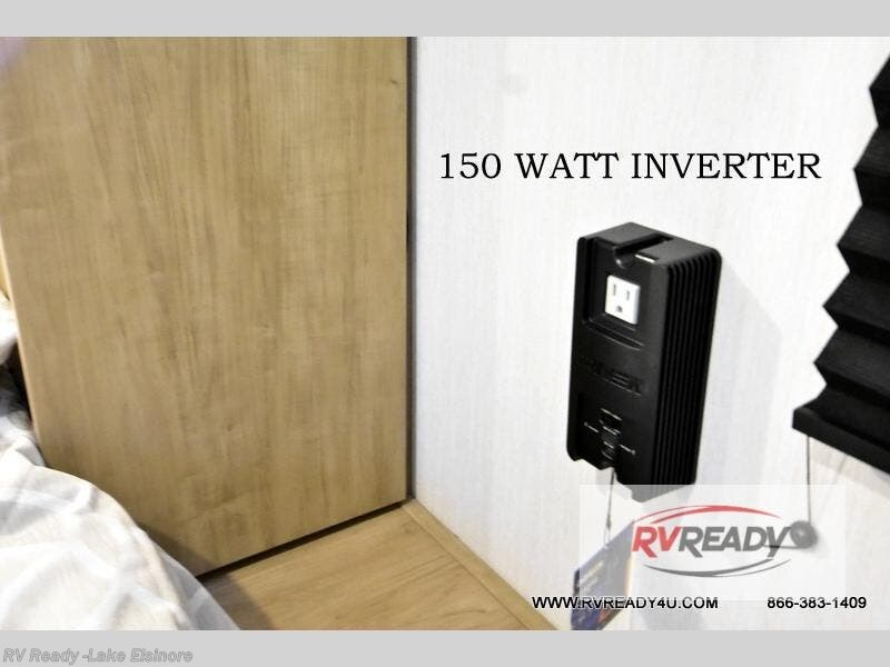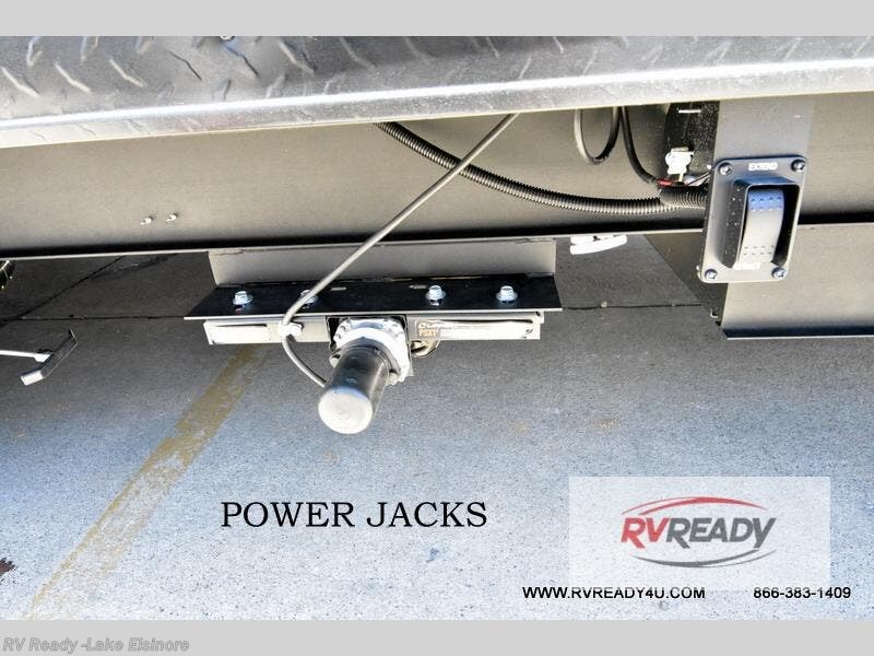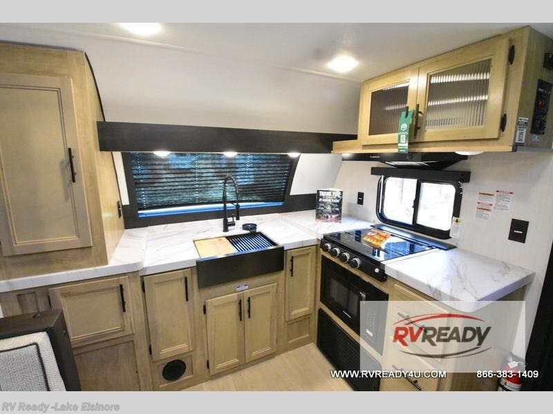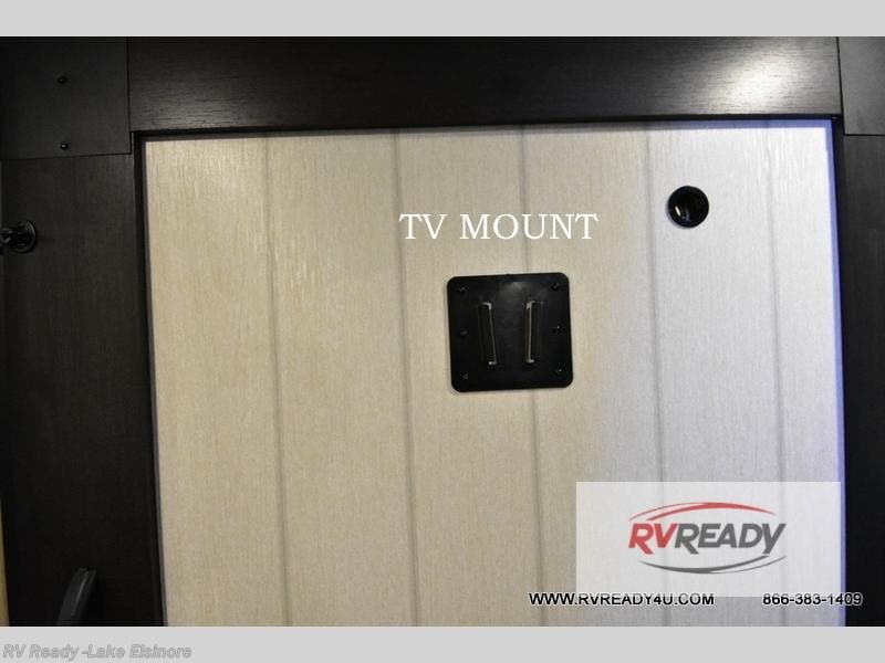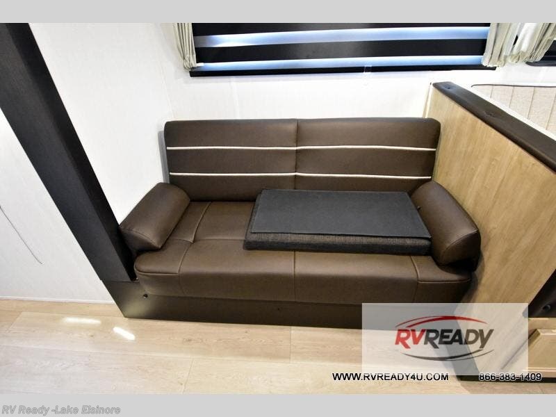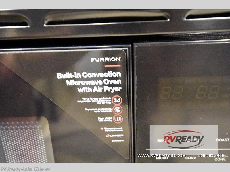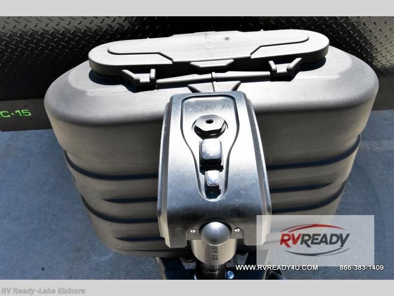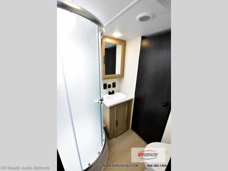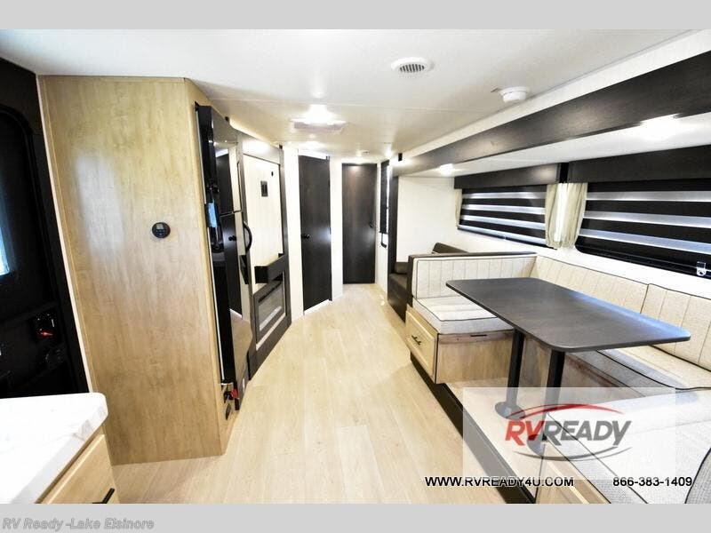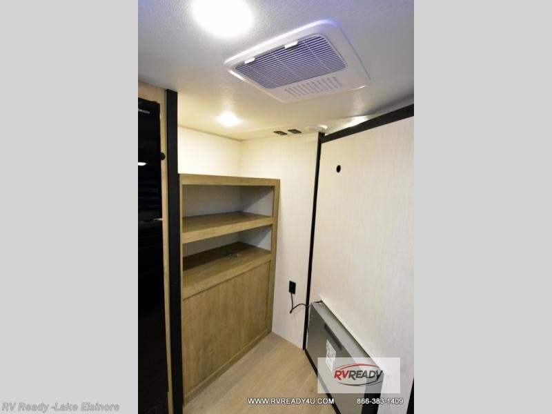 Since this travel trailer features dual entry doors, you can enter in through the rear master bedroom or the front kitchen; how convenient! The kitchen includes ample counter space and all the appliances to prep meals, along with a pantry up front and a hidden pantry behind the fireplace. Your crew can get comfortable on the sofa or play a game around the U-shaped dinette, although you may just find yourselves outdoors since there is an outside kitchen and a power awning with LED lights. The dual entry bath will let you enter in through the main living area, plus it has a private entrance into the bedroom. Here, you'll find an RV king bed, a wardrobe for your things, and USB ports to keep your electronics charged!