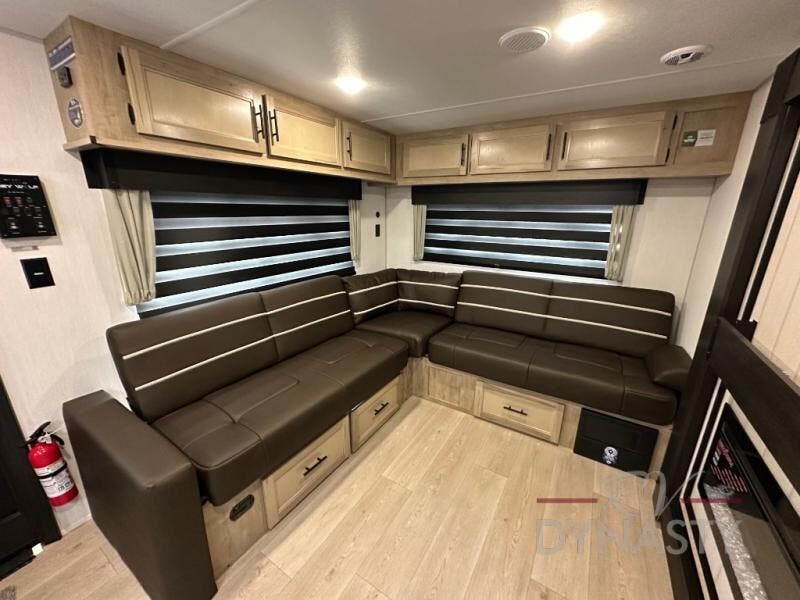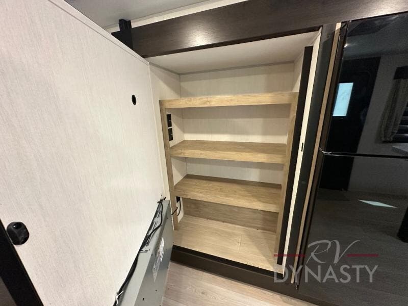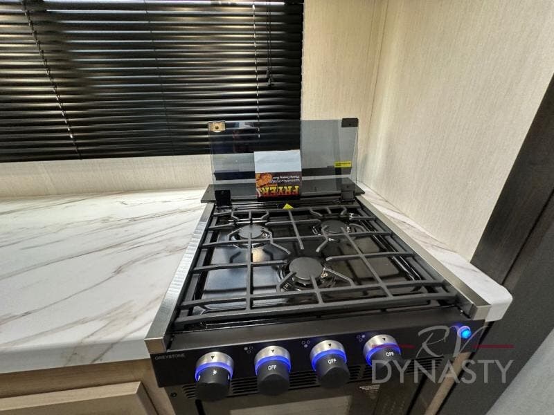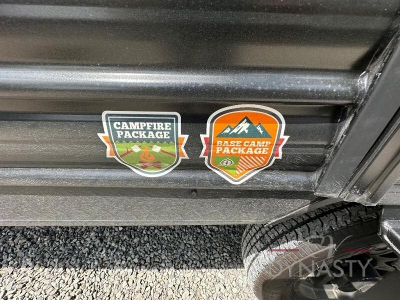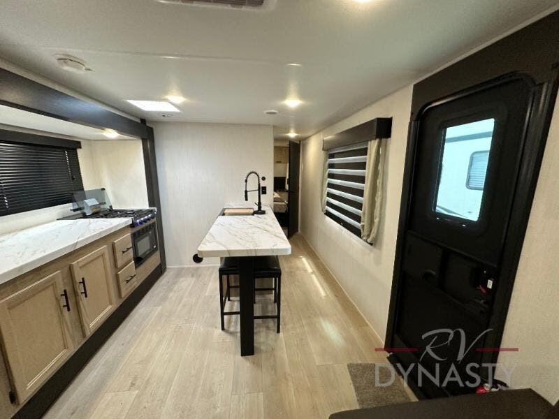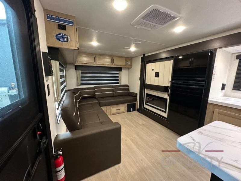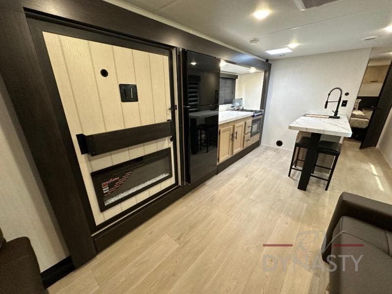This travel trailer will feel just like home with its RV king bed in the front bedroom plus the full bath with a tub/shower, and there is a spacious living area thanks to the large slide out. Here, you'll find the air fryer and counter space, 12V refrigerator, and the fireplace with a hidden pantry behind it. Your crew can relax on the L-shaped sofa, or visit with the chef while they prep meals at the island peninsula. There are even two bar stools here for added convenience. Head outdoors to enjoy the power awning with LED lights in the evening!