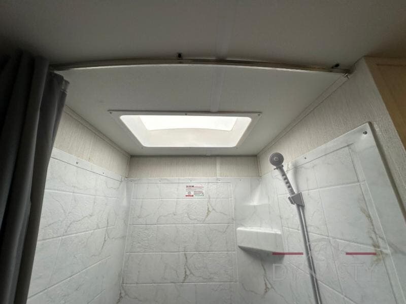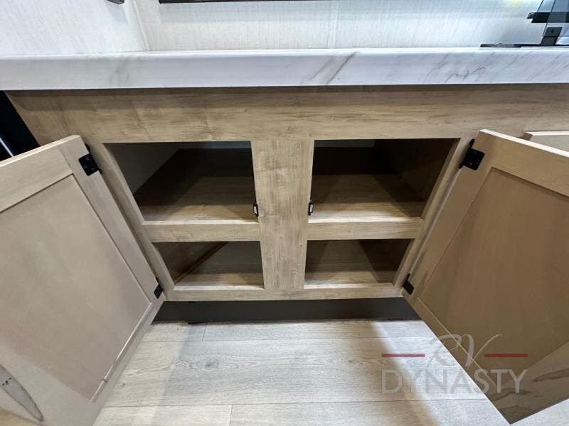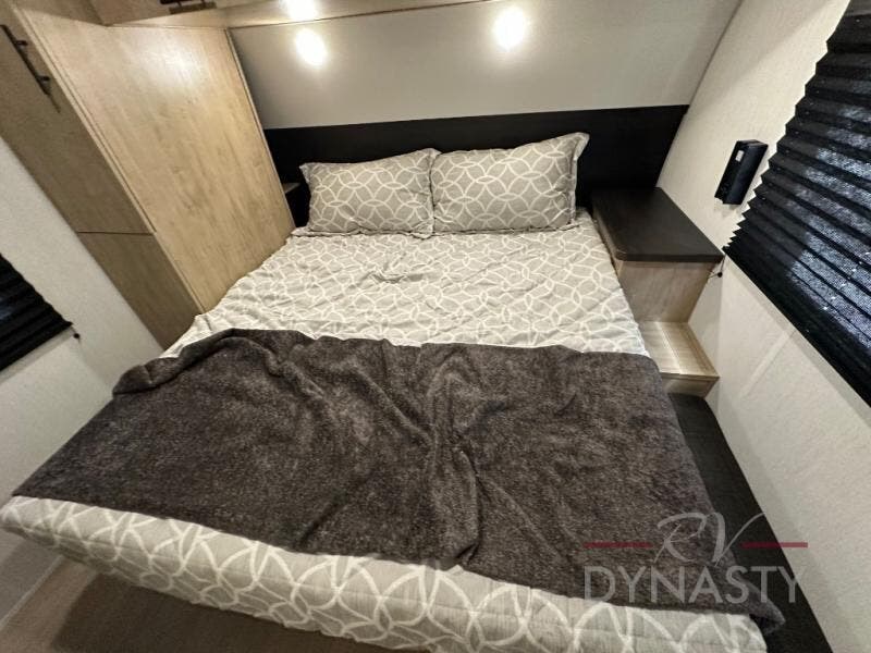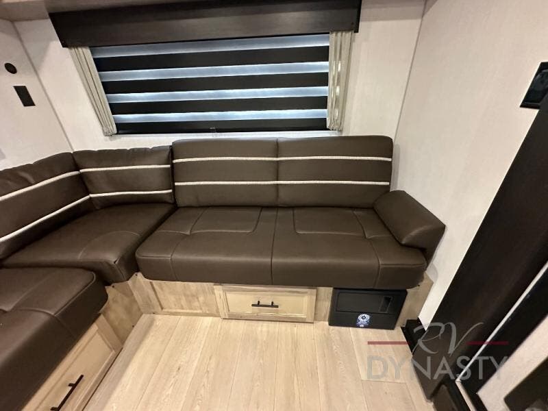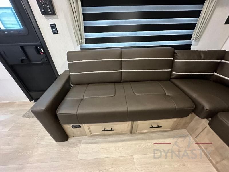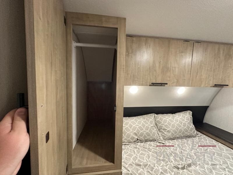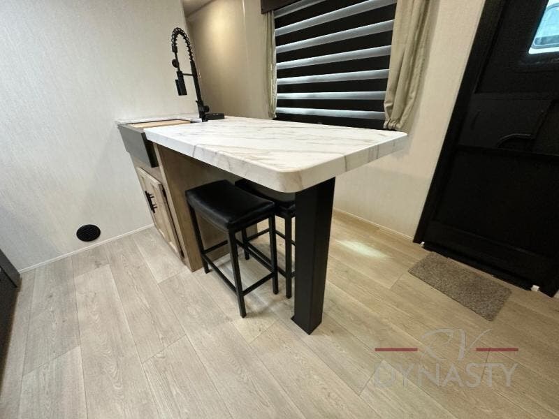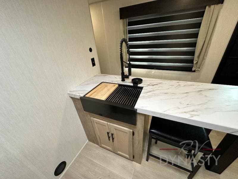 This travel trailer will feel just like home with its RV king bed in the front bedroom plus the full bath with a tub/shower, and there is a spacious living area thanks to the large slide out. Here, you'll find the air fryer and counter space, 12V refrigerator, and the fireplace with a hidden pantry behind it. Your crew can relax on the L-shaped sofa, or visit with the chef while they prep meals at the island peninsula. There are even two bar stools here for added convenience. Head outdoors to enjoy the power awning with LED lights in the evening!