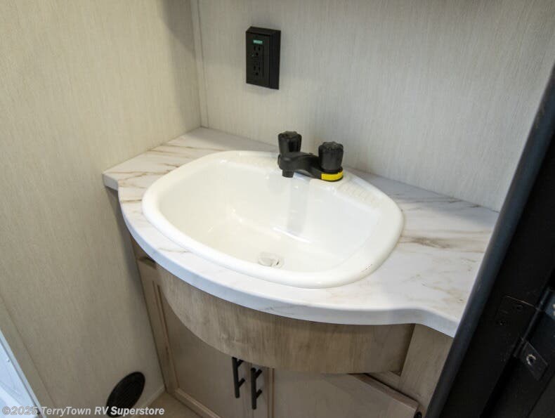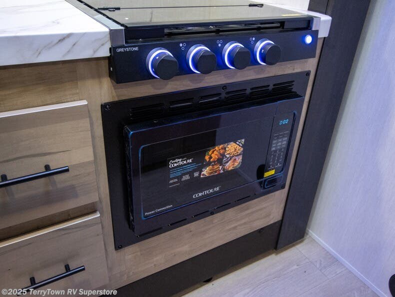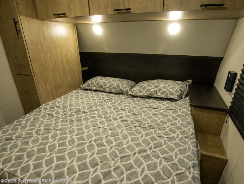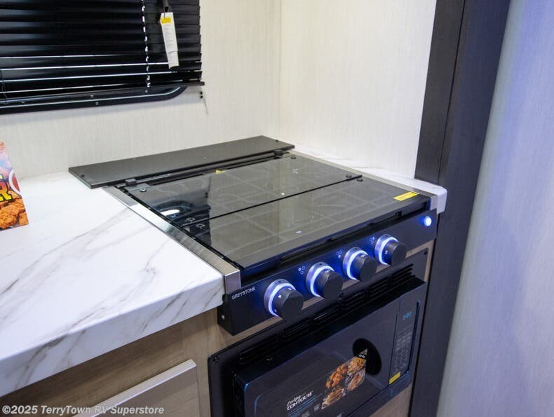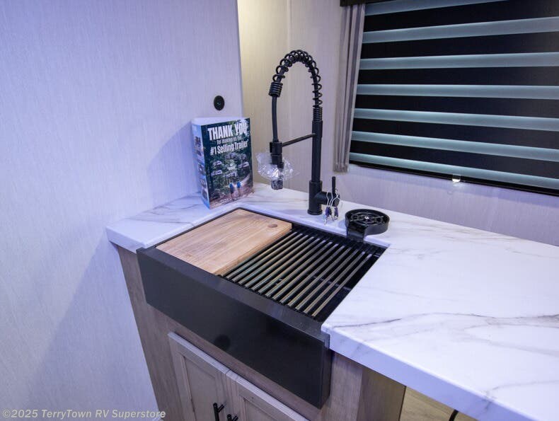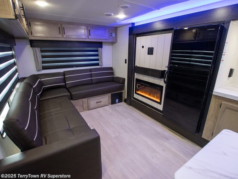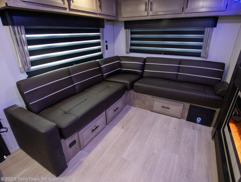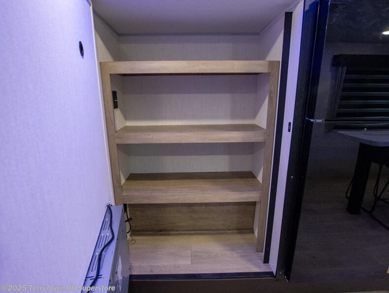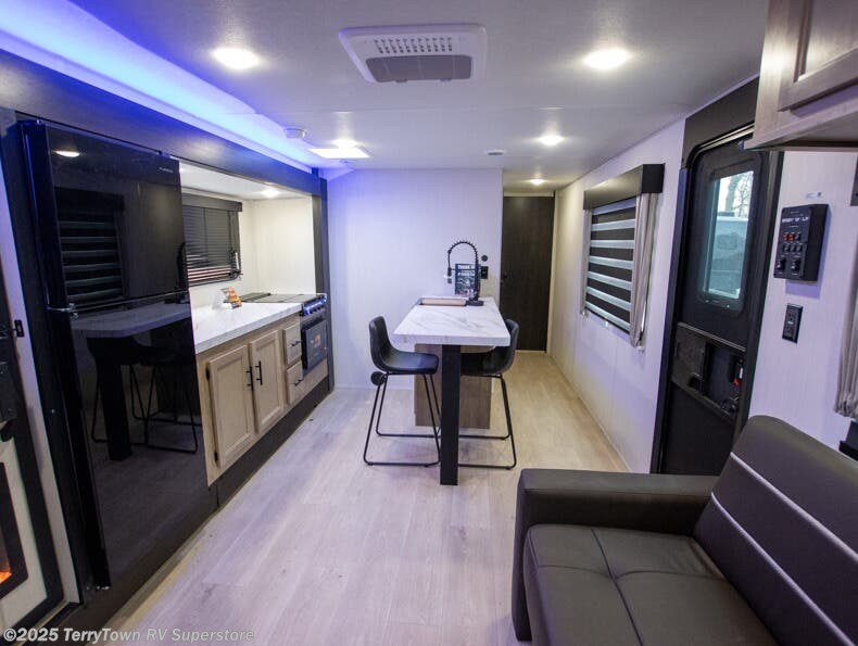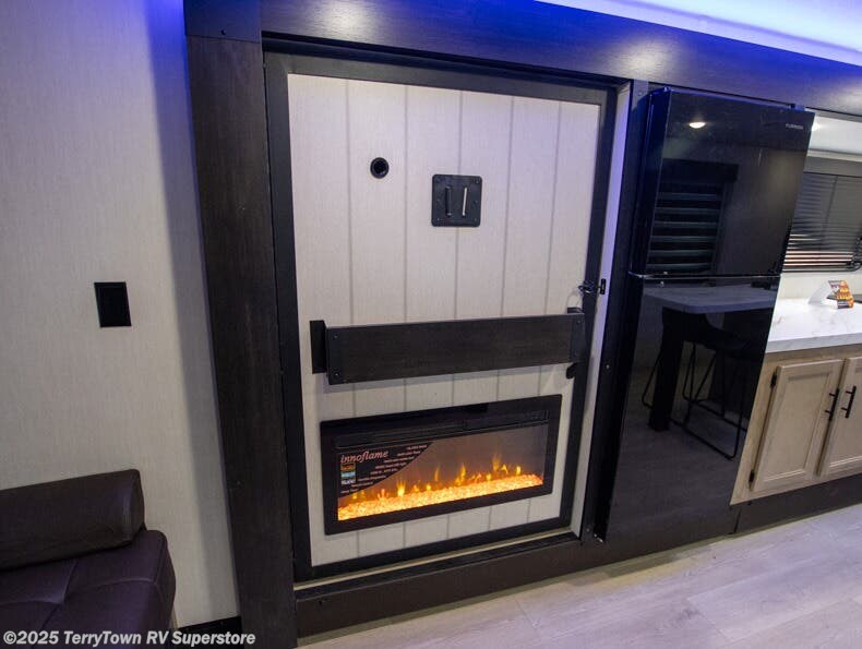 This travel trailer will feel just like home with its RV king bed in the front bedroom plus the full bath with a tub/shower, and there is a spacious living area thanks to the large slide out. Here, you'll find the air fryer and counter space, 12V refrigerator, and the fireplace with a hidden pantry behind it. Your crew can relax on the L-shaped sofa, or visit with the chef while they prep meals at the island peninsula. There are even two bar stools here for added convenience. Head outdoors to enjoy the power awning with LED lights in the evening!