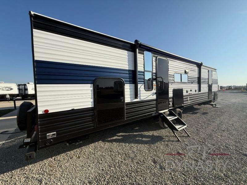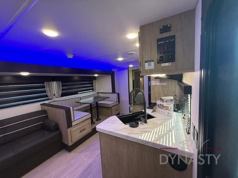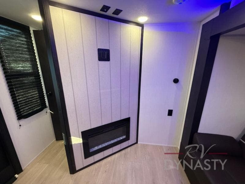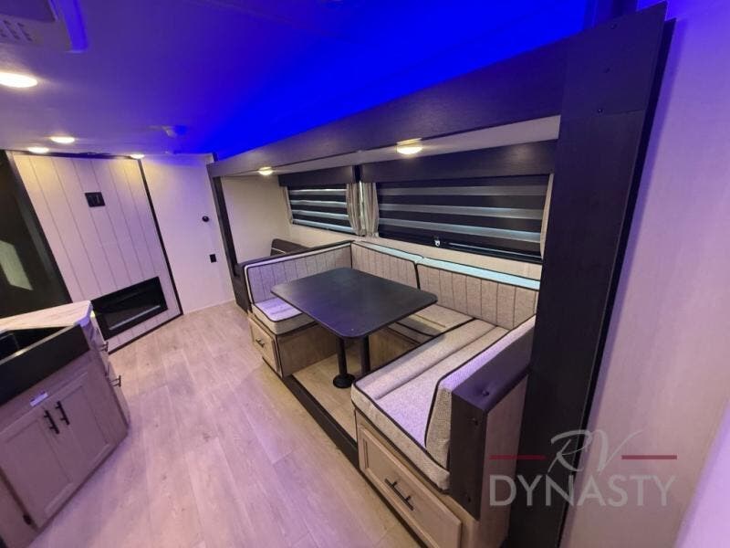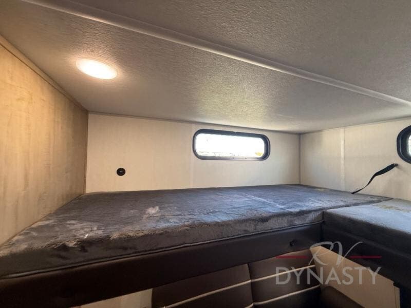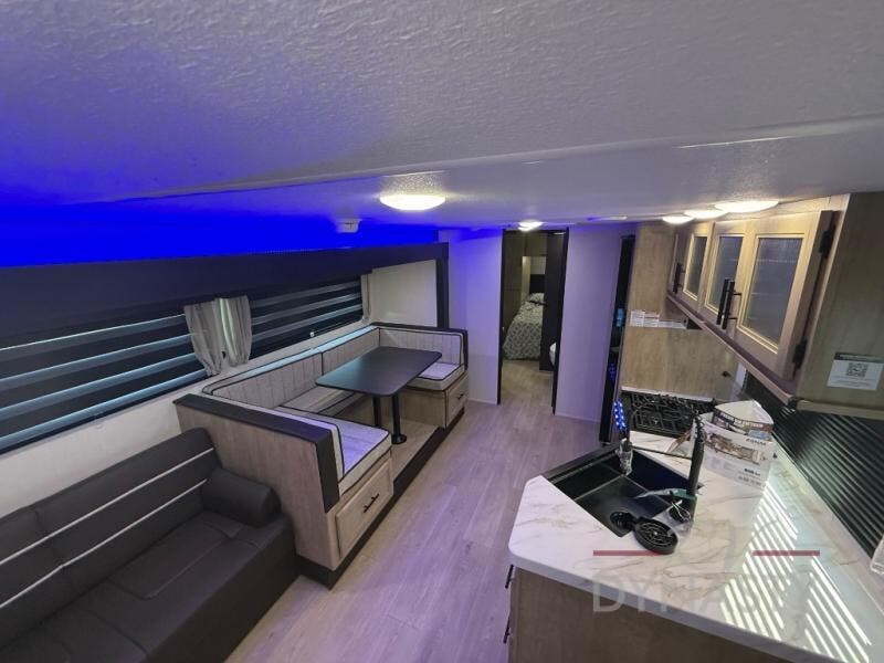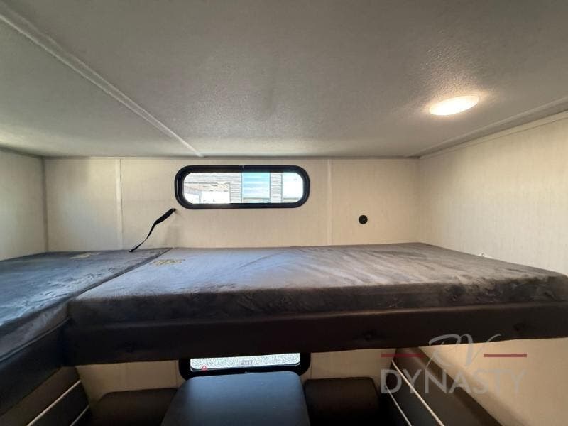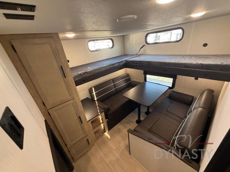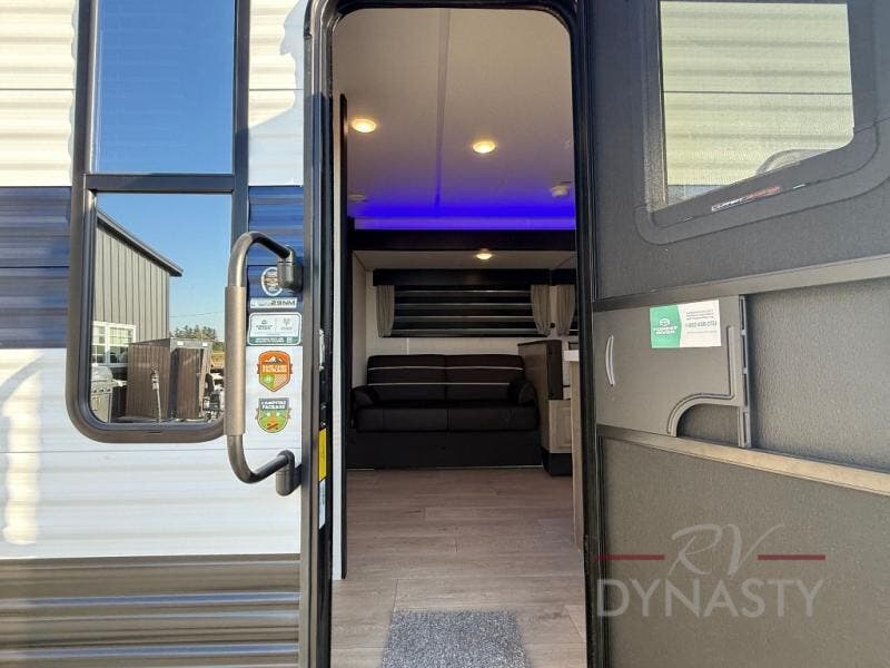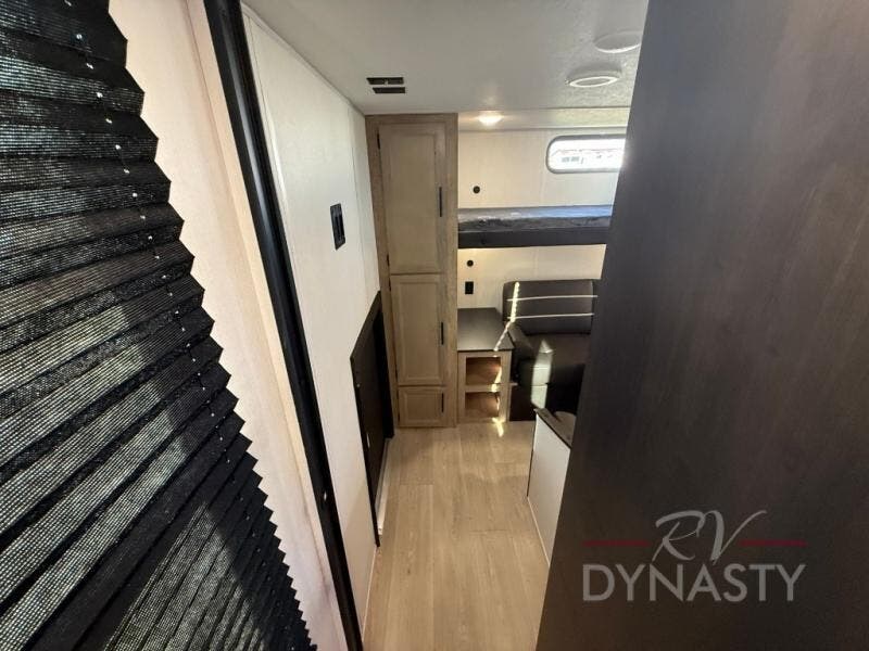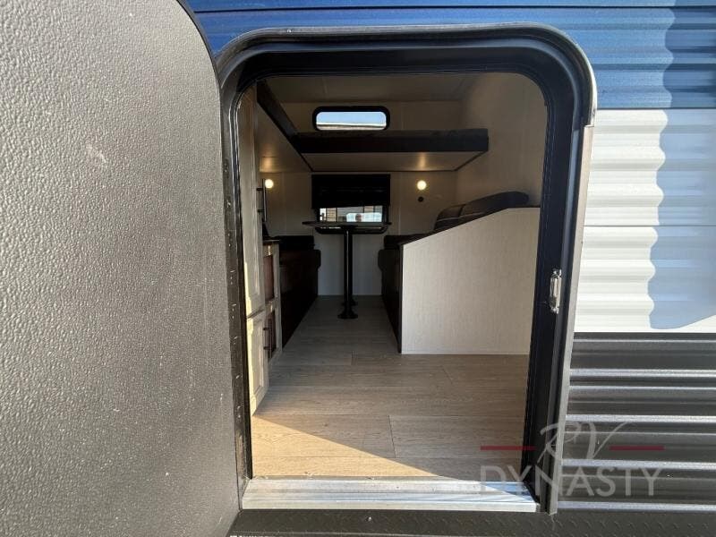 You will love how easy it is to enter/exit this travel trailer with dual entry doors! The rear door leads into the living/kitchen area where you will notice the large U-shaped dinette and the sofa which sit on the slide and create a spacious footprint for moving about, as well as great places to play games and socialize with your friends and family. Plus, there is an entertainment center with a fireplace and a fully equipped kitchen to keep everyone's bellies filled with delicious home cooked meals. At night, there is sleeping space for everyone between the bunks above the sofas with a table in the rear private bunkhouse and the RV king bed in the front private bedroom, plus the furniture can convert into sleeping spaces. The walk-through bathroom leads directly into the bedroom too!