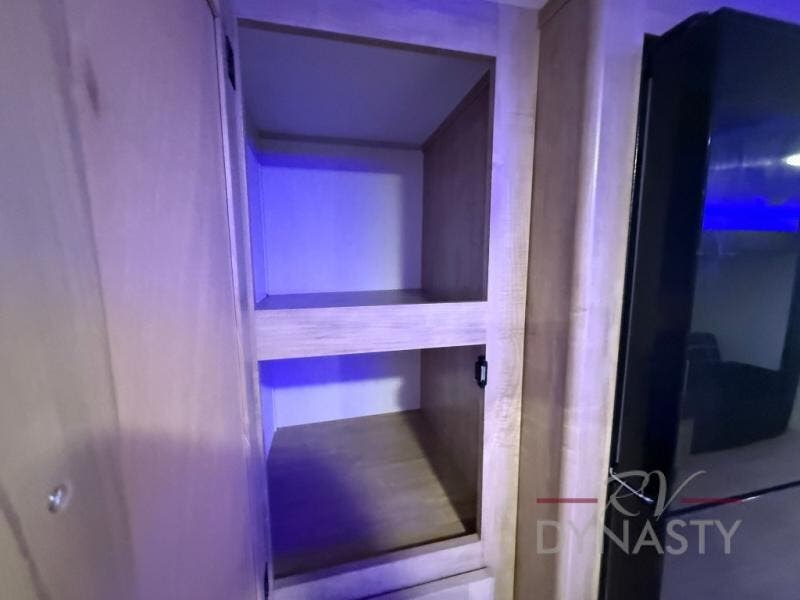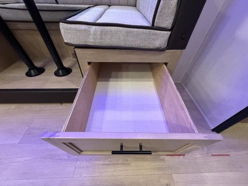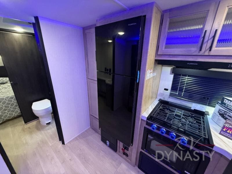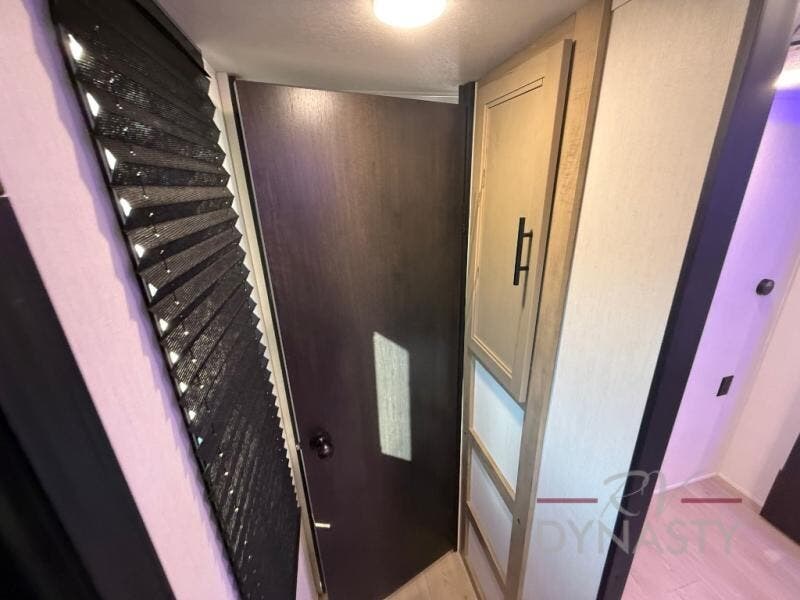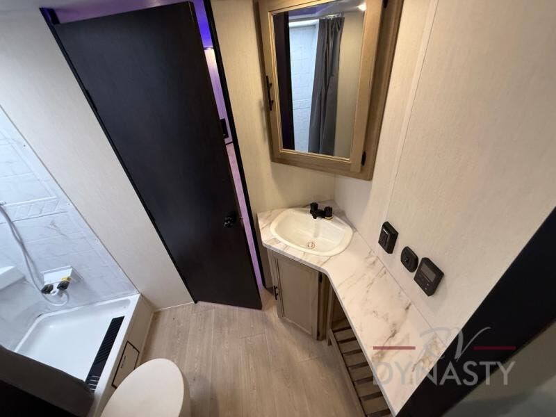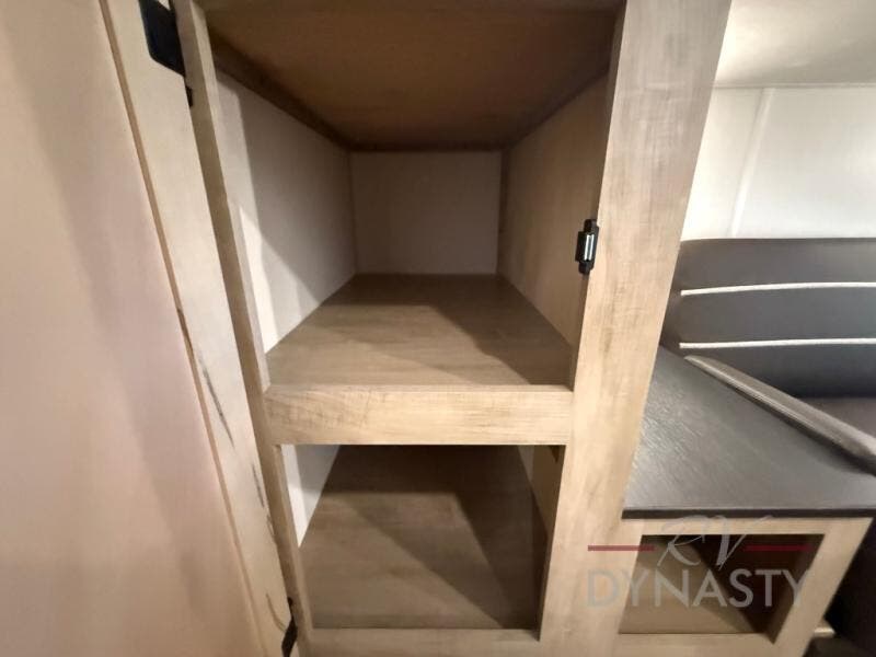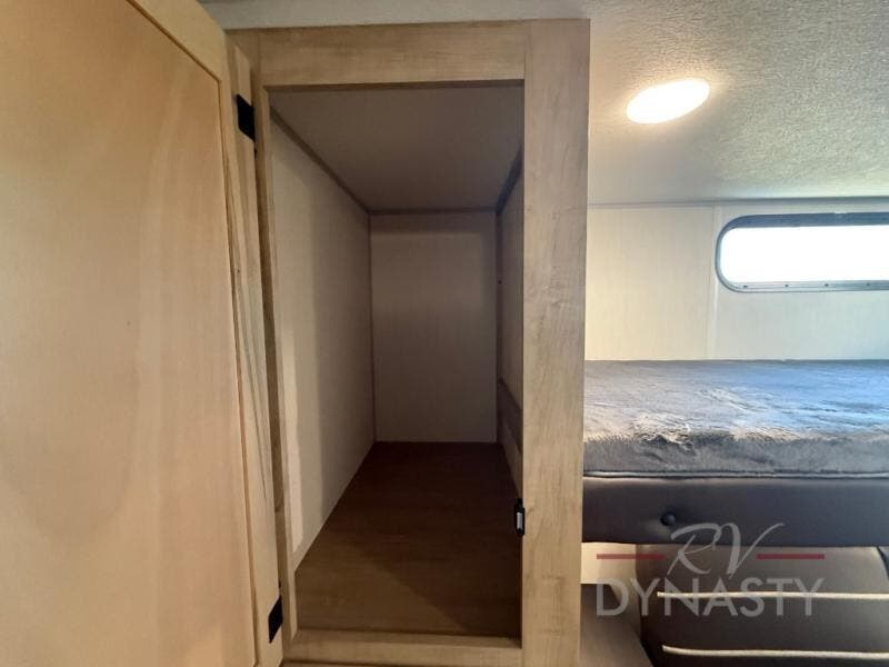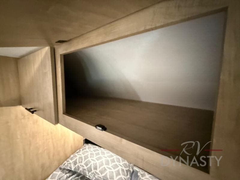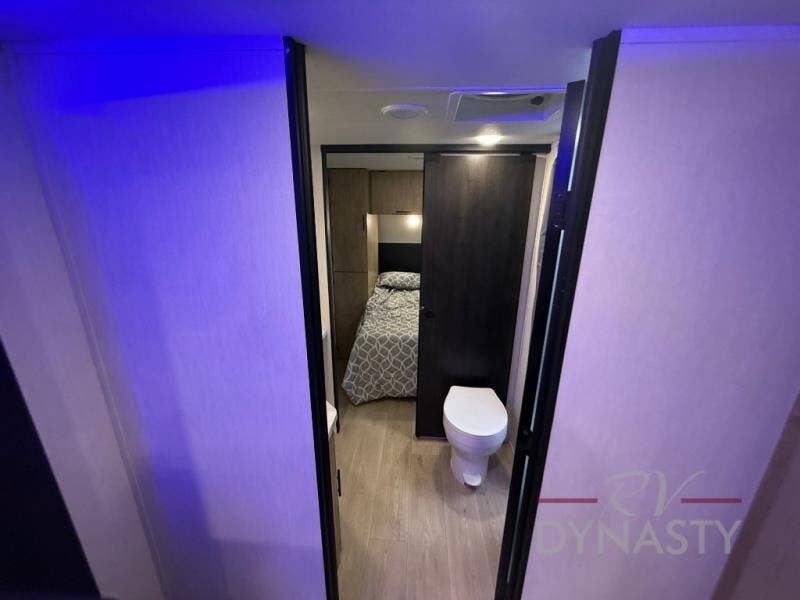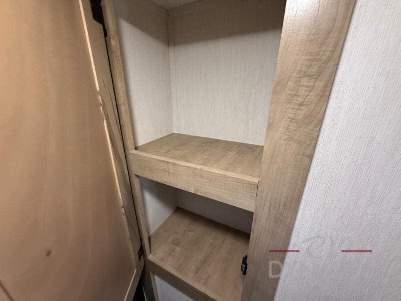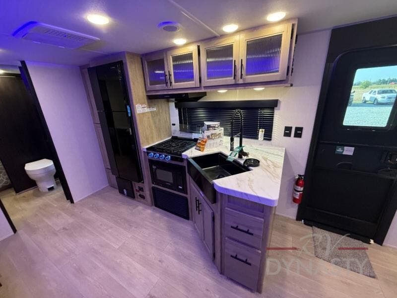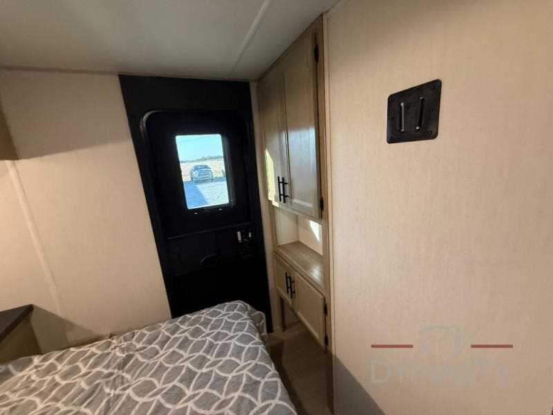 You will love how easy it is to enter/exit this travel trailer with dual entry doors! The rear door leads into the living/kitchen area where you will notice the large U-shaped dinette and the sofa which sit on the slide and create a spacious footprint for moving about, as well as great places to play games and socialize with your friends and family. Plus, there is an entertainment center with a fireplace and a fully equipped kitchen to keep everyone's bellies filled with delicious home cooked meals. At night, there is sleeping space for everyone between the bunks above the sofas with a table in the rear private bunkhouse and the RV king bed in the front private bedroom, plus the furniture can convert into sleeping spaces. The walk-through bathroom leads directly into the bedroom too!
