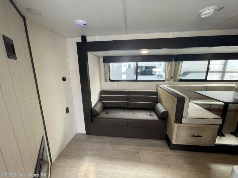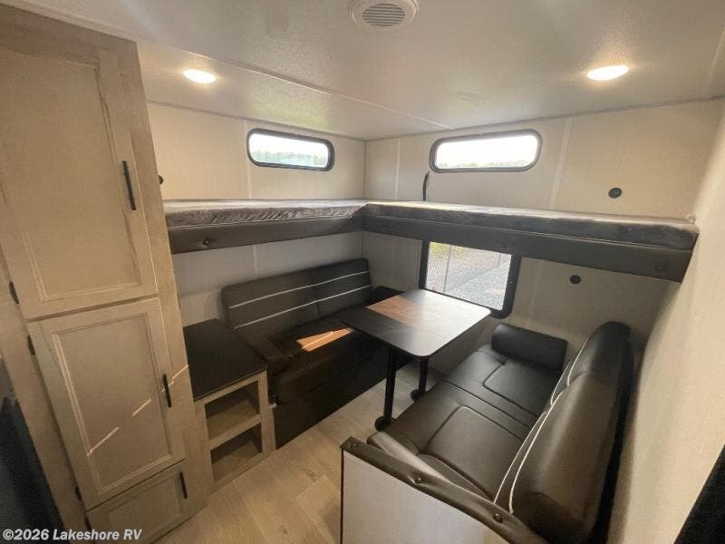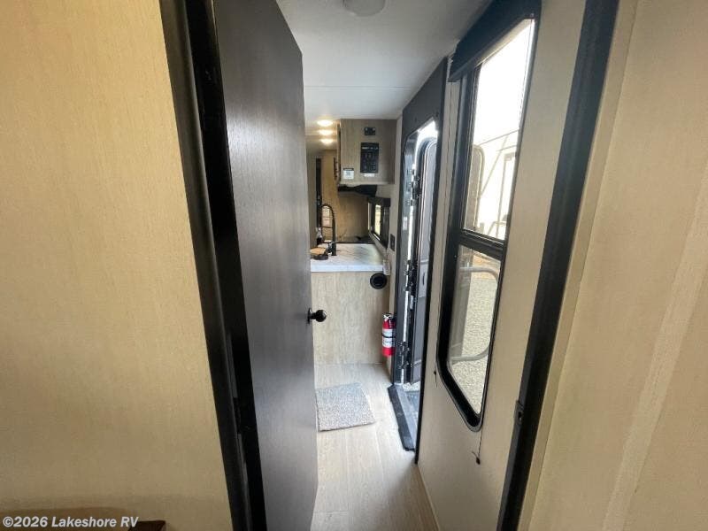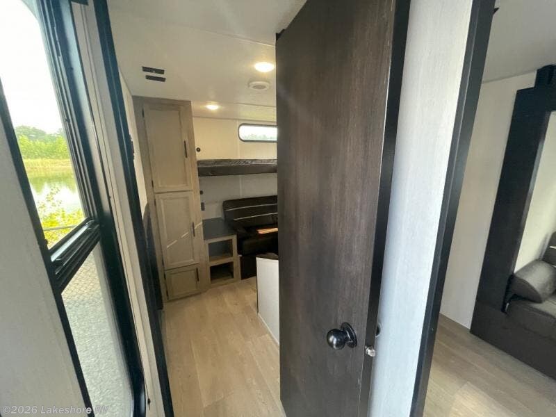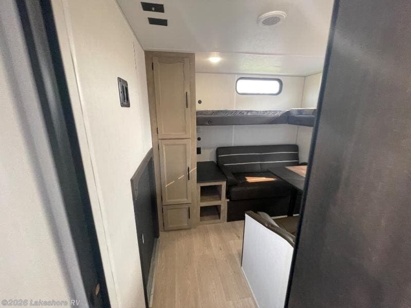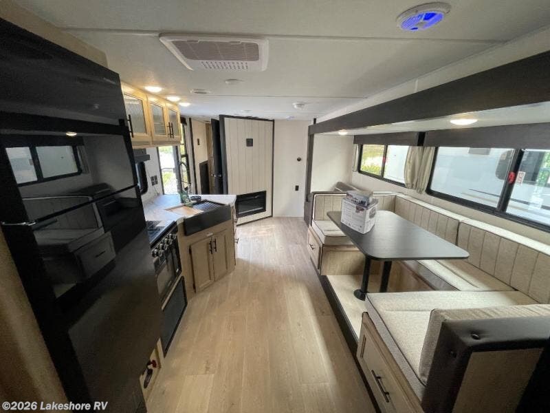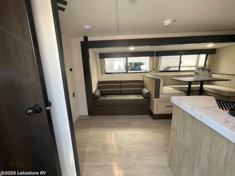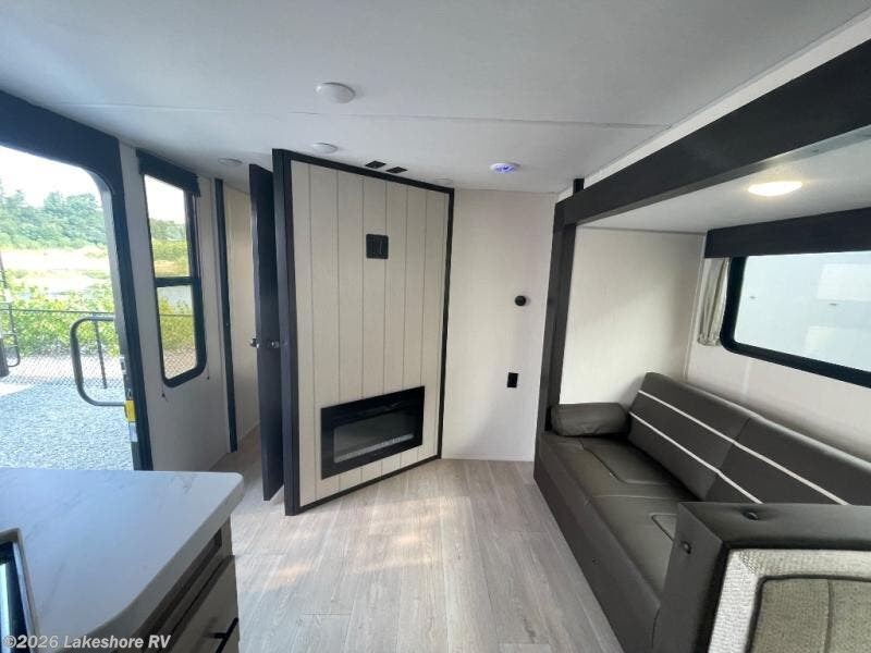 You will love how easy it is to enter/exit this travel trailer with dual entry doors! The rear door leads into the living/kitchen area where you will notice the large U-shaped dinette and the sofa which sit on the slide and create a spacious footprint for moving about, as well as great places to play games and socialize with your friends and family. Plus, there is an entertainment center with a fireplace and a fully equipped kitchen to keep everyone's bellies filled with delicious home cooked meals. At night, there is sleeping space for everyone between the bunks above the sofas with a table in the rear private bunkhouse and the RV king bed in the front private bedroom, plus the furniture can convert into sleeping spaces. The walk-through bathroom leads directly into the bedroom too!