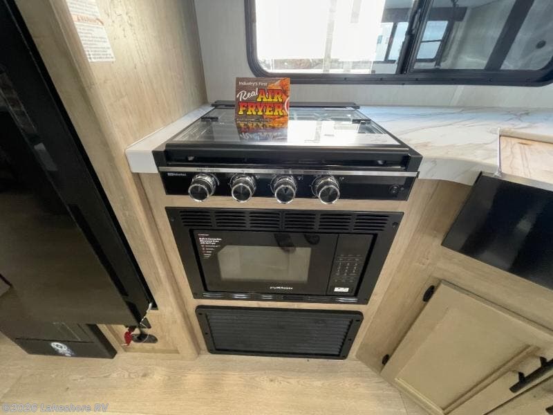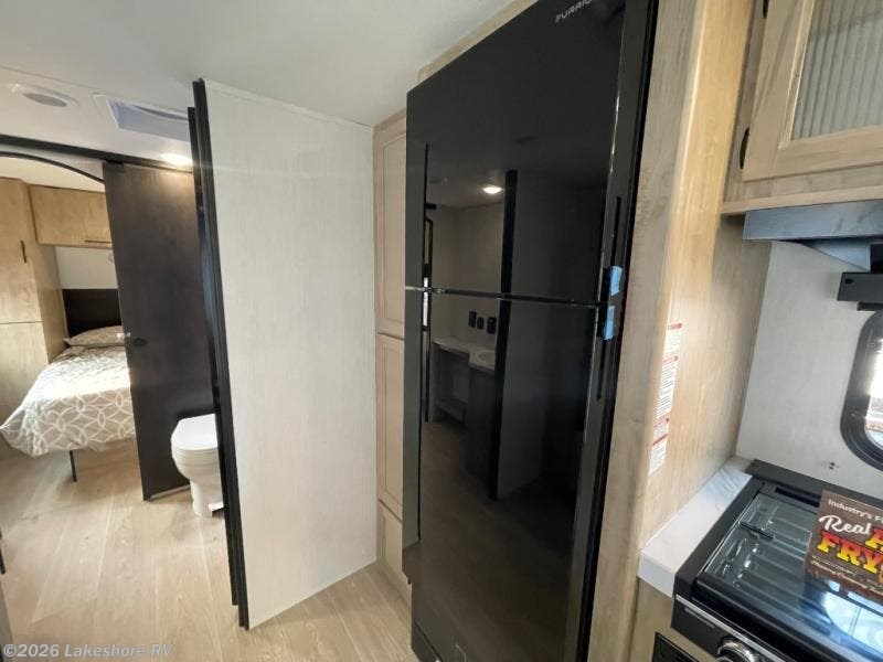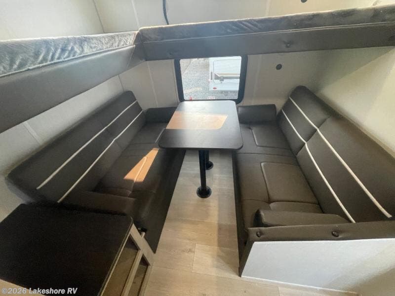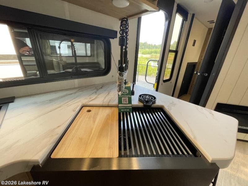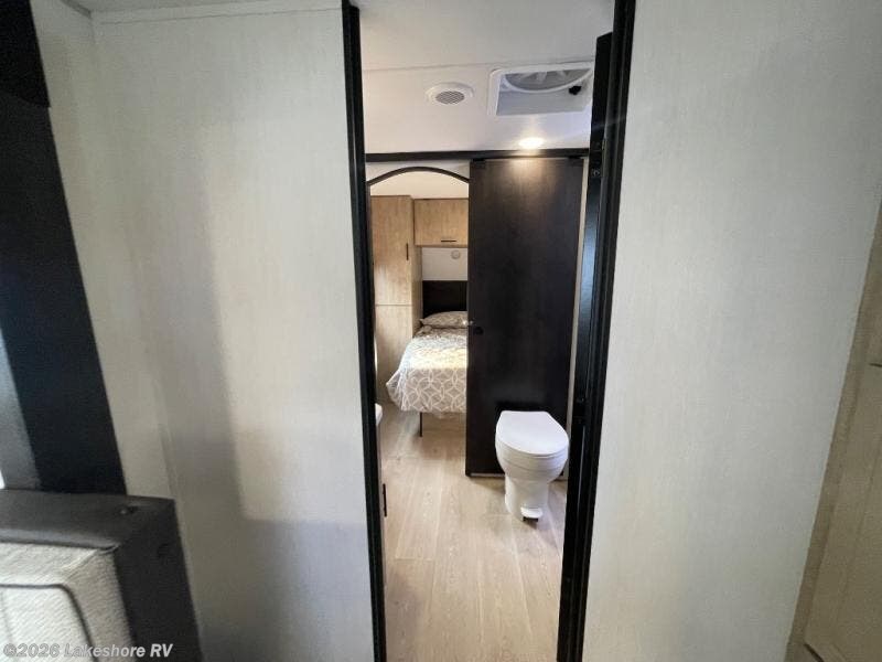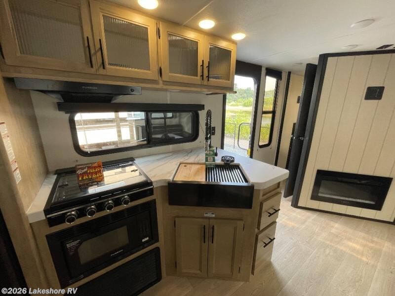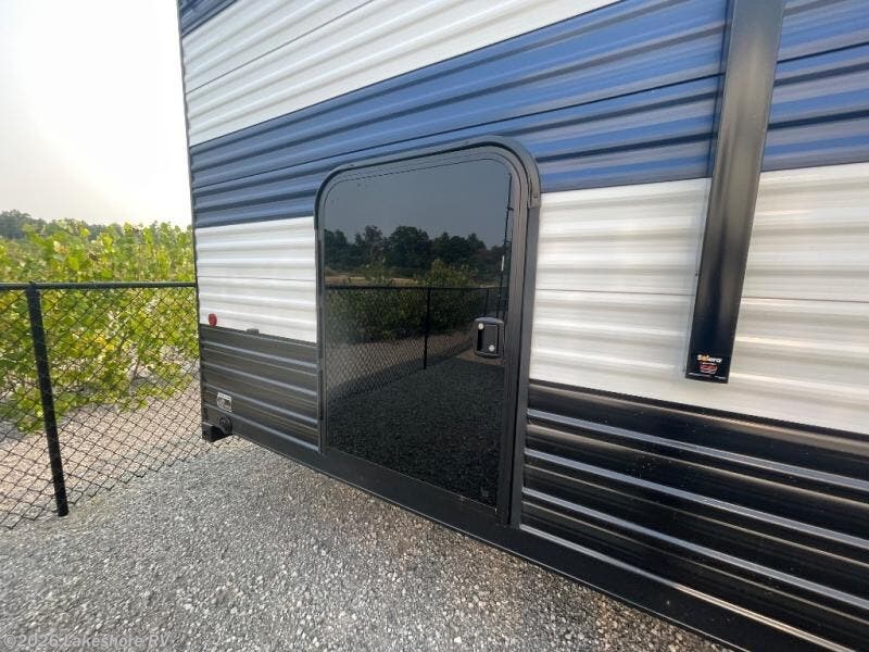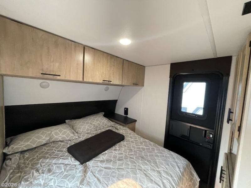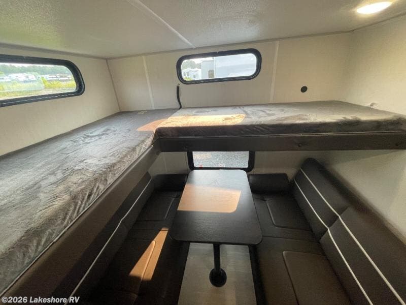 You will love how easy it is to enter/exit this travel trailer with dual entry doors! The rear door leads into the living/kitchen area where you will notice the large U-shaped dinette and the sofa which sit on the slide and create a spacious footprint for moving about, as well as great places to play games and socialize with your friends and family. Plus, there is an entertainment center with a fireplace and a fully equipped kitchen to keep everyone's bellies filled with delicious home cooked meals. At night, there is sleeping space for everyone between the bunks above the sofas with a table in the rear private bunkhouse and the RV king bed in the front private bedroom, plus the furniture can convert into sleeping spaces. The walk-through bathroom leads directly into the bedroom too!