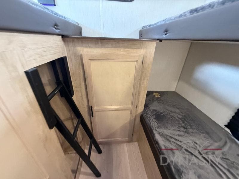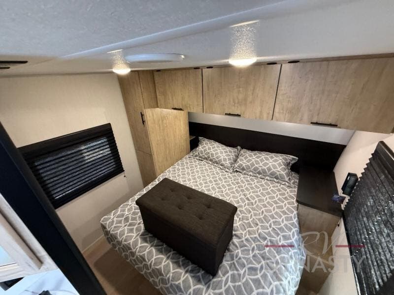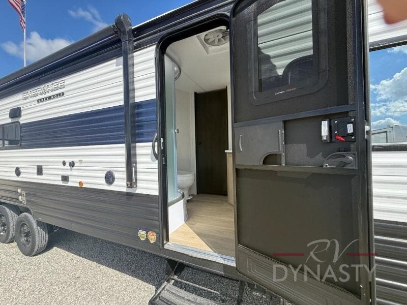 Your larger family will love spending weekends away with this Cherokee Grey Wolf travel trailer as their home away from home. This model offers lots of sleeping space with three bunk beds in the rear private bunkhouse. In the front, there is a master suite with wardrobes and nightstands on either side of the RV king bed, and it even has private access to the dual-entry bath. The two entry doors will make accessing the trailer easy for everyone, and you will appreciate the abundant storage throughout this unit including large overhead cabinets, a spacious pantry, and numerous outside storage compartments for all of your outdoor gear. There's even an outside bar & grill!