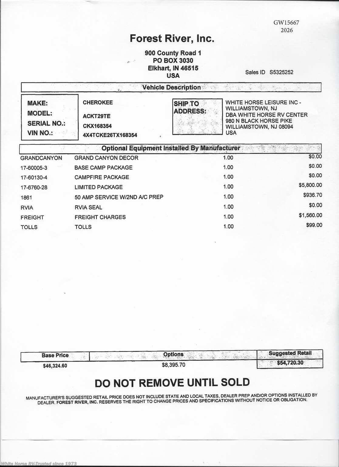 This Forest River Cherokee Grey Wolf 29TE (Stock #GW15667) includes the Base Camp Package, Campfire Package, Limited Package, 50 Amp Service w/ 2nd AC Prep & Interior Décor Grand Canyon. MSRP $54,720.30.