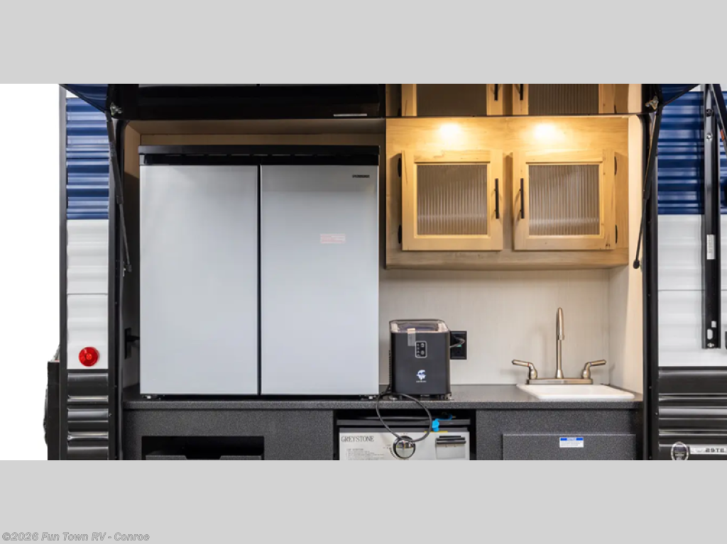 Your larger family will love spending weekends away with this Cherokee Grey Wolf travel trailer as their home away from home. This model offers lots of sleeping space with three bunk beds in the rear private bunkhouse. In the front, there is a master suite with a wardrobe beside RV king bed, and it even has private access to the dual-entry bath. The two entry doors will make accessing the trailer easy for everyone, and you will appreciate the abundant storage throughout this unit including large overhead cabinets, a spacious pantry, and numerous outside storage compartments for all of your outdoor gear. There's even an outside bar & grill!