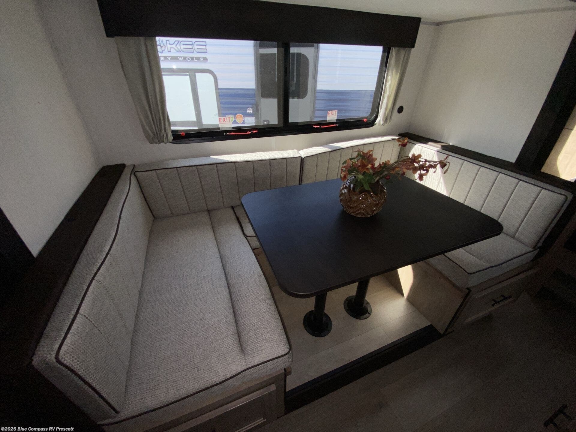 You will love the space provided in this dual entry Cherokee Grey Wolf Black Label travel trailer that has double-size bunks! The rear entry door leads right into the full bath allowing easy access from outside when you need to use the bathroom while you're enjoying the great outdoors. The large U-shaped dinette slide will not only seat everyone comfortably for a meal or a game, but since it also slides out, it opens up the interior even more to give you plenty of space for foot traffic. For all of your outdoor gear, you will find the outside storage compartments handy for stowing away your things when not in use. While the kids enjoy their bunk beds, you will enjoy a good night's rest on the RV king bed with wardrobes on either side up in the front private bedroom!