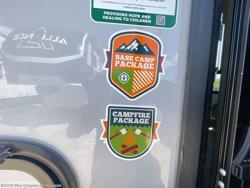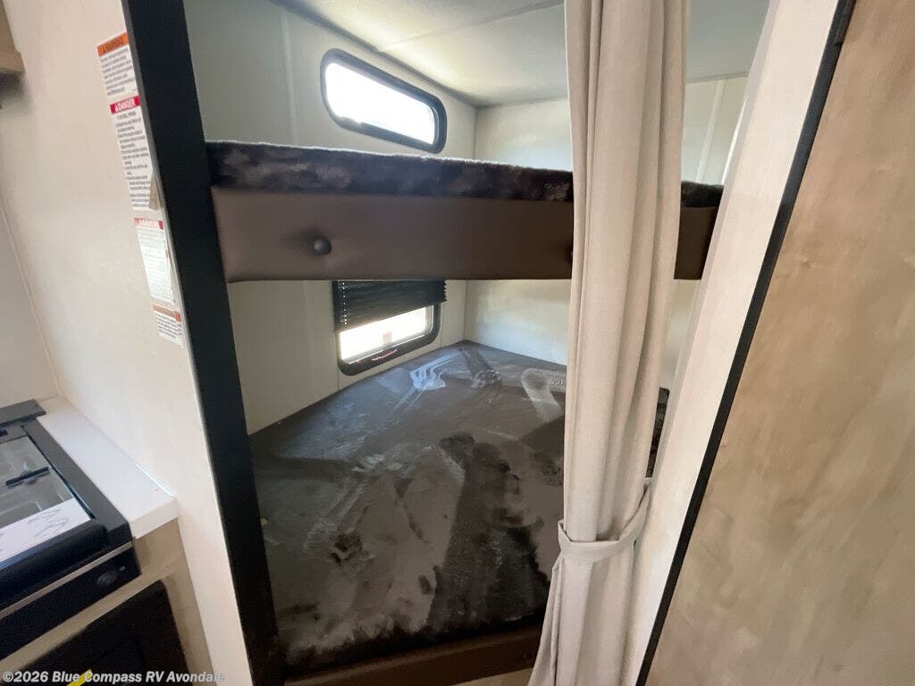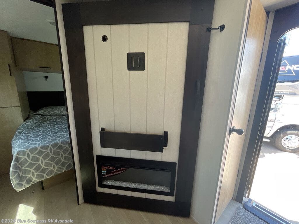 Enjoy time at the campground in this spacious travel trailer with a front private bedroom and double-size bunks for guests! The full interior kitchen and outside kitchen will let you make meals each day, and everyone can dine around the U-shaped dinette or under the 15' awning outside! This unit also includes ample storage space, including hidden shelves behind the fireplace and outside storage!