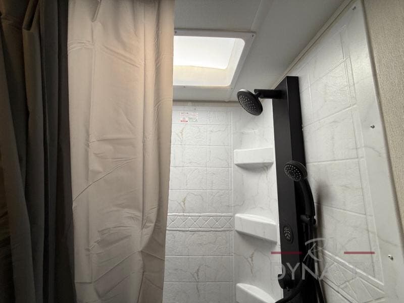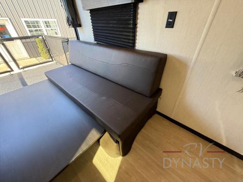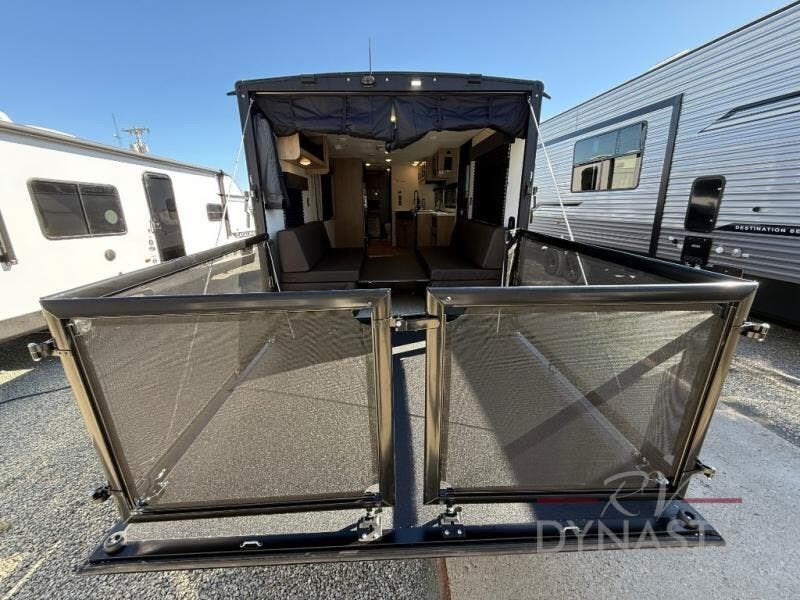 This dual entry toy hauler will allow you to enter in through the main living area or the front master bedroom for convenience! There is a walk-through bath that will be easily accessible for everyone, and there is plenty of storage space for personal belongings. Head to the full kitchen to prepare a home cooked meal, or head outdoors to enjoy the outside kitchen. There is also an outside TV mount if you brought a TV along, and a 15' power awning to provide shade. You can easily unload your toys using the ramp door, then relax on the fold-down sofas with a removable tale.