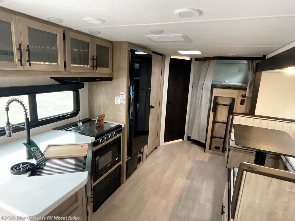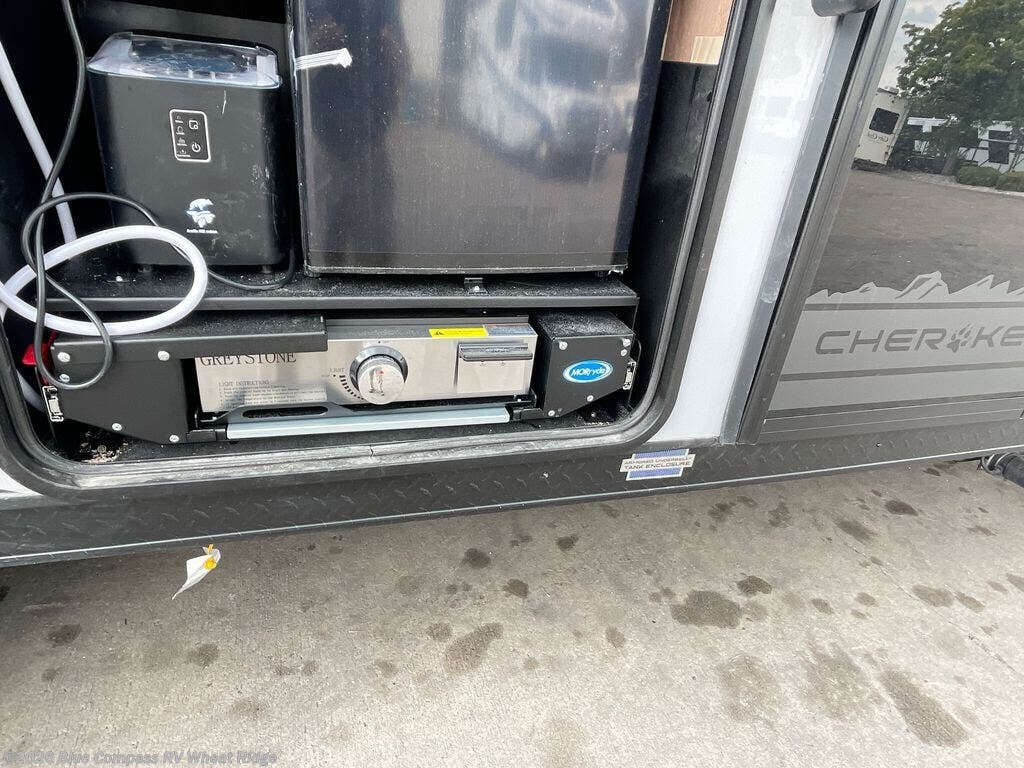 Come on inside this Cherokee Grey Wolf Black Label travel trailer and experience the convenience of a smooth flow of traffic in and out with two entry doors. The rear door leads into a full bath which is great for accessibility when outside and when you need to use the bathroom. Once inside, you will notice the large U-shaped dinette and the sofa which sit on the slide and create a spacious footprint for moving about, as well as great places to play games and socialize with your friends and family. A large pantry provides plenty of storage allowing you to stock up on your favorite snacks and dry goods for your family adventure. At night, there is sleeping space for everyone between the double-size bunks and the RV king bed, plus the furniture.