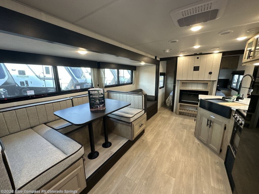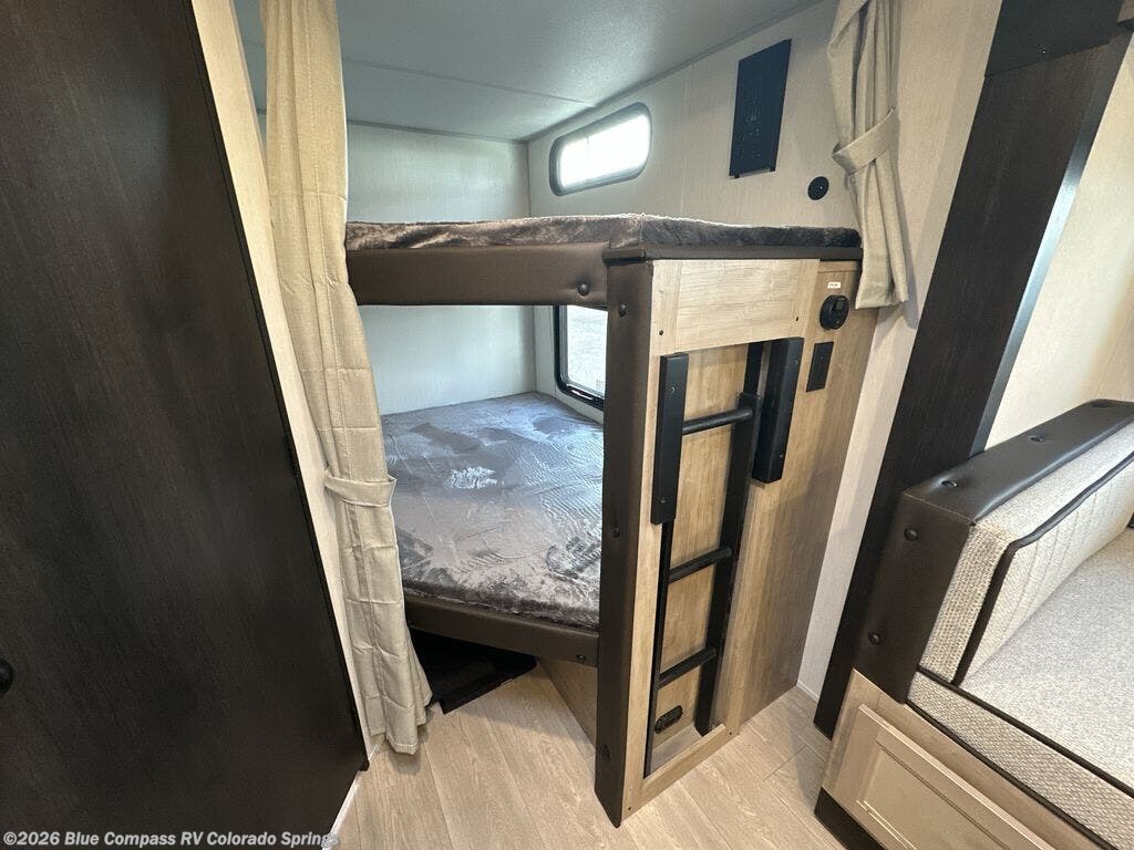 Come on inside this Cherokee Grey Wolf Black Label travel trailer and experience the convenience of a smooth flow of traffic in and out with two entry doors. The rear door leads into a full bath which is great for accessibility when outside and when you need to use the bathroom. Once inside, you will notice the large U-shaped dinette and the sofa which sit on the slide and create a spacious footprint for moving about, as well as great places to play games and socialize with your friends and family. A large pantry provides plenty of storage allowing you to stock up on your favorite snacks and dry goods for your family adventure. At night, there is sleeping space for everyone between the double-size bunks and the RV king bed, plus the furniture.