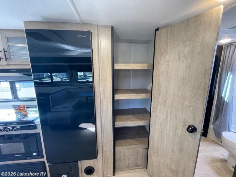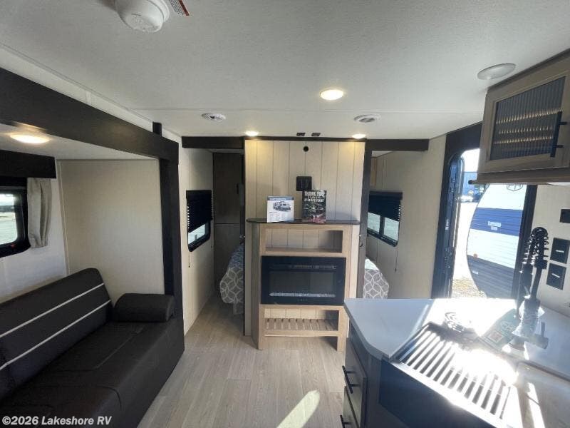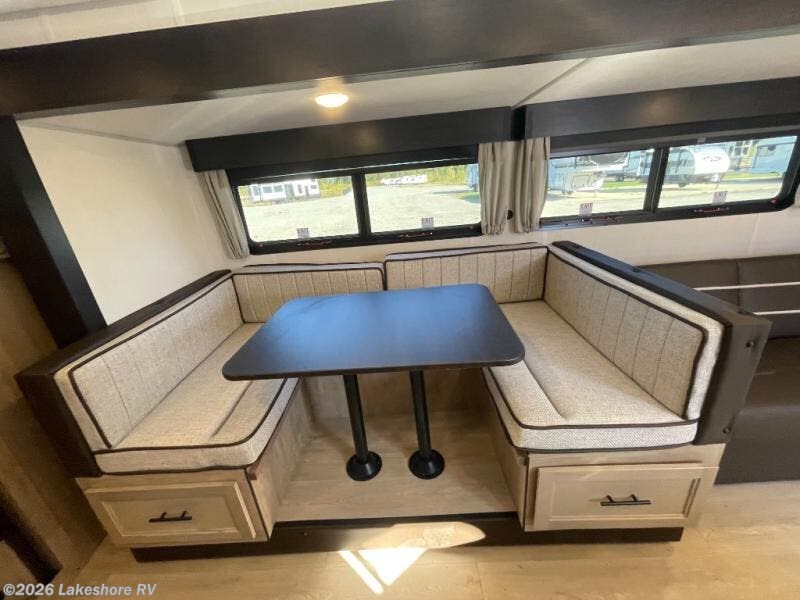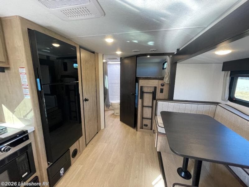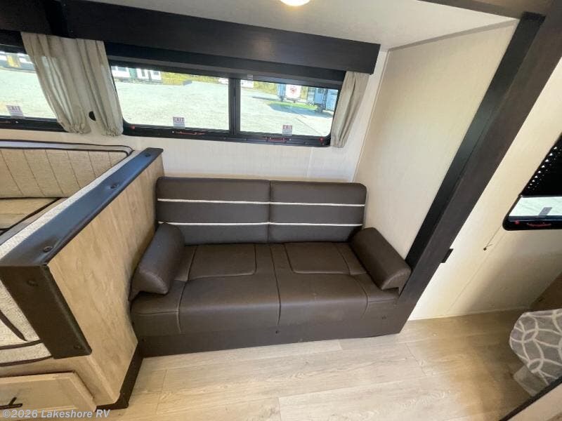 Come on inside this Cherokee Grey Wolf Black Label travel trailer and experience the convenience of a smooth flow of traffic in and out with two entry doors. The rear door leads into a full bath which is great for accessibility when outside and when you need to use the bathroom. Once inside, you will notice the large U-shaped dinette and the sofa which sit on the slide and create a spacious footprint for moving about, as well as great places to play games and socialize with your friends and family. A large pantry provides plenty of storage allowing you to stock up on your favorite snacks and dry goods for your family adventure. At night, there is sleeping space for everyone between the double-size bunks and the RV king bed, plus the furniture.