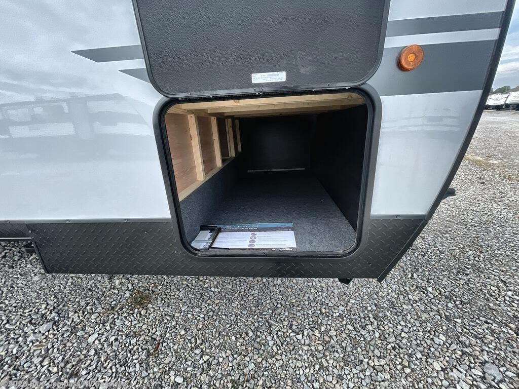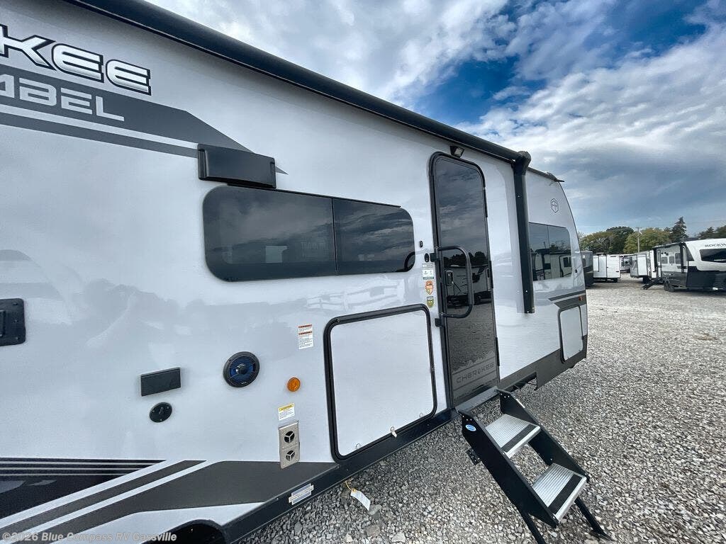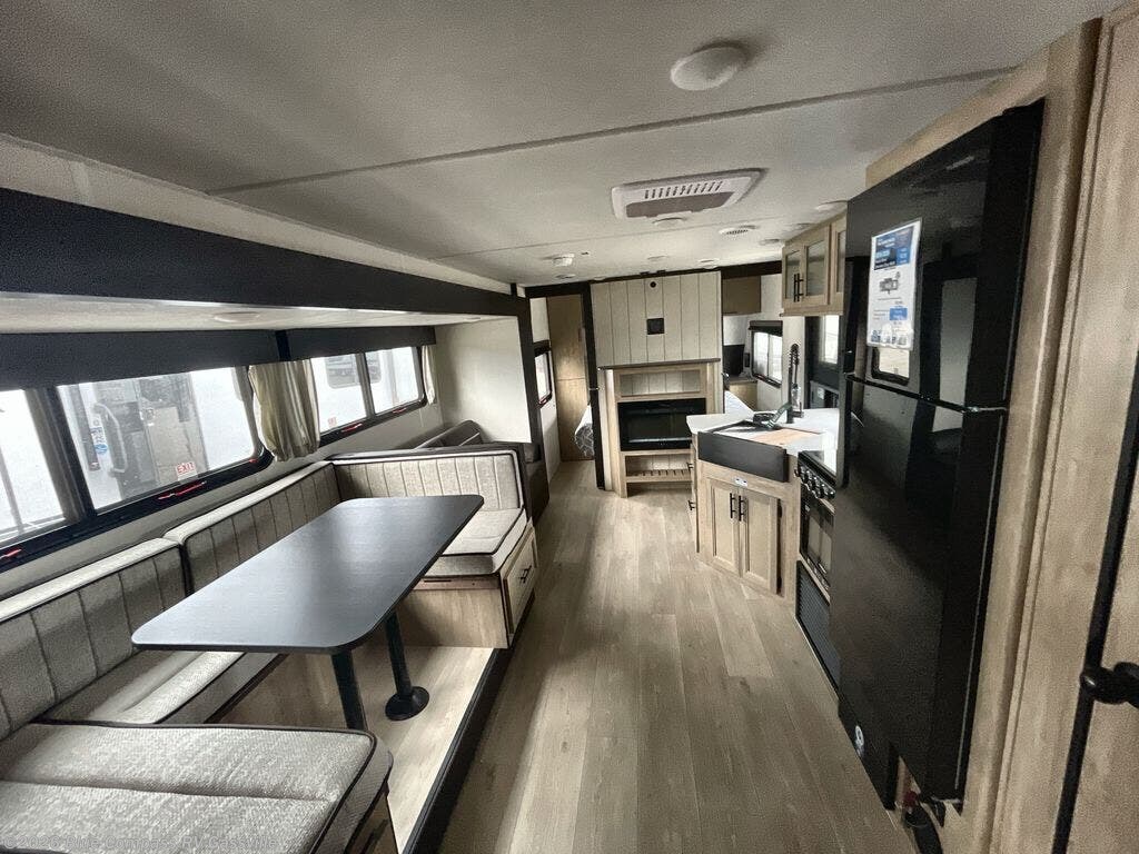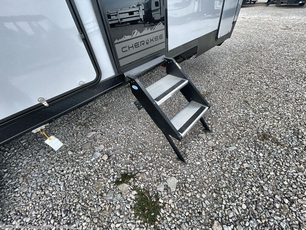 Come on inside this Cherokee Grey Wolf Black Label travel trailer and experience the convenience of a smooth flow of traffic in and out with two entry doors. The rear door leads into a full bath which is great for accessibility when outside and when you need to use the bathroom. Once inside, you will notice the large U-shaped dinette and the sofa which sit on the slide and create a spacious footprint for moving about, as well as great places to play games and socialize with your friends and family. A large pantry provides plenty of storage allowing you to stock up on your favorite snacks and dry goods for your family adventure. At night, there is sleeping space for everyone between the double-size bunks and the RV king bed, plus the furniture.