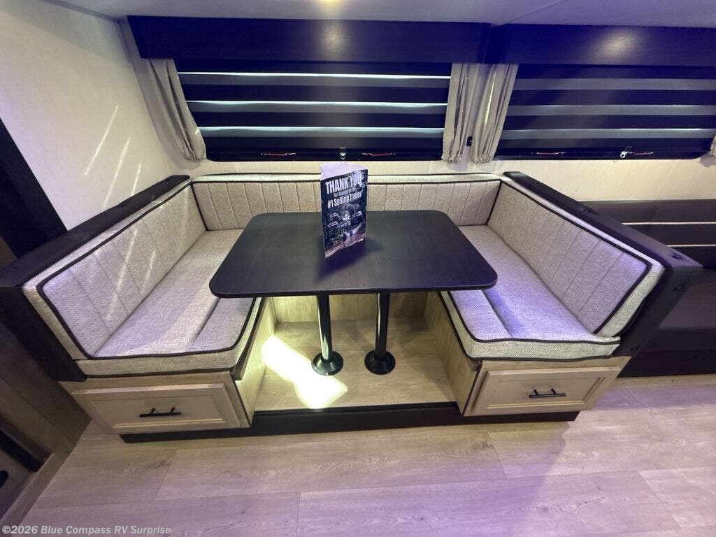 Come on inside this Cherokee Grey Wolf Black Label travel trailer and experience the convenience of a smooth flow of traffic in and out with two entry doors. The rear door leads into a full bath which is great for accessibility when outside and when you need to use the bathroom. Once inside, you will notice the large U-shaped dinette and the sofa which sit on the slide and create a spacious footprint for moving about, as well as great places to play games and socialize with your friends and family. A large pantry provides plenty of storage allowing you to stock up on your favorite snacks and dry goods for your family adventure. At night, there is sleeping space for everyone between the double-size bunks and the RV king bed, plus the furniture.
