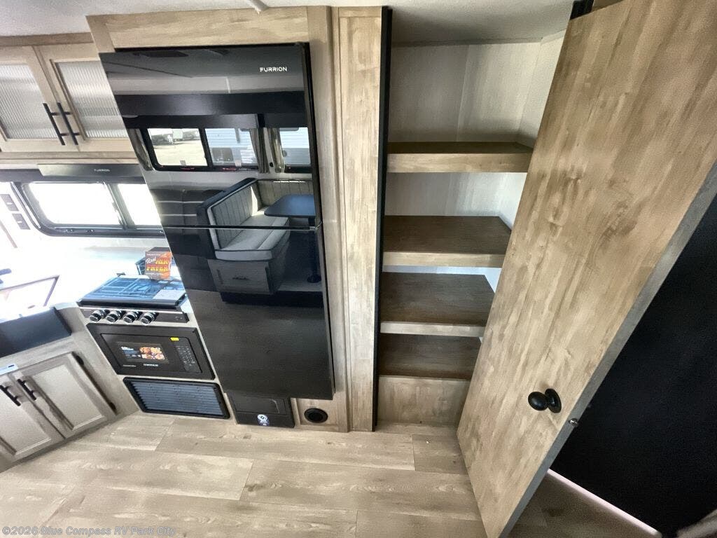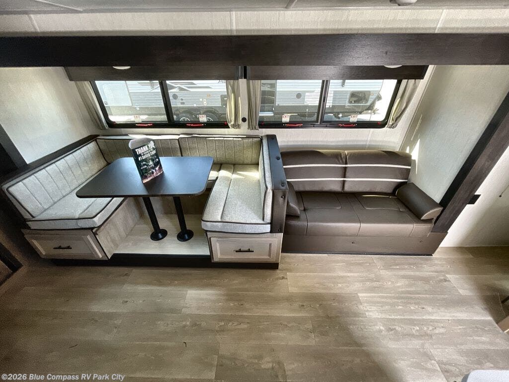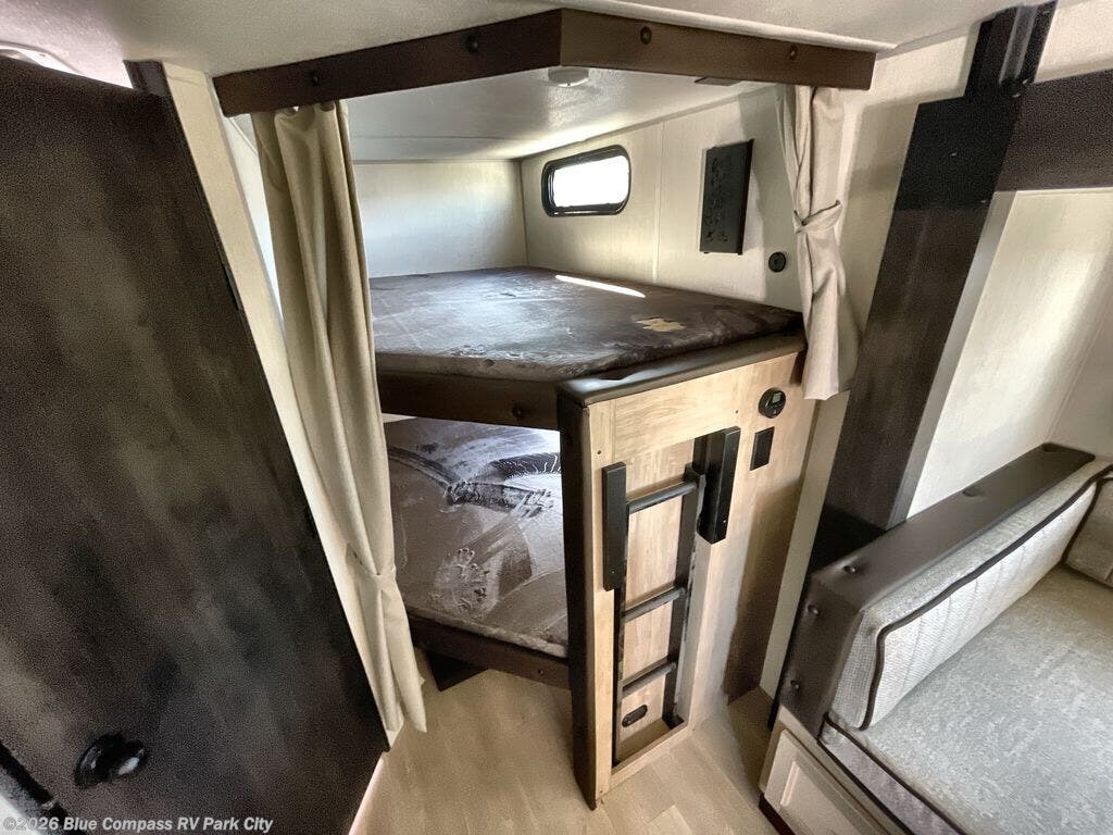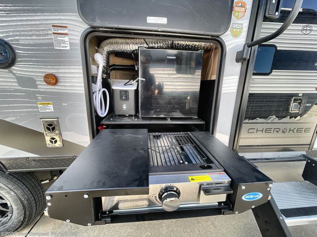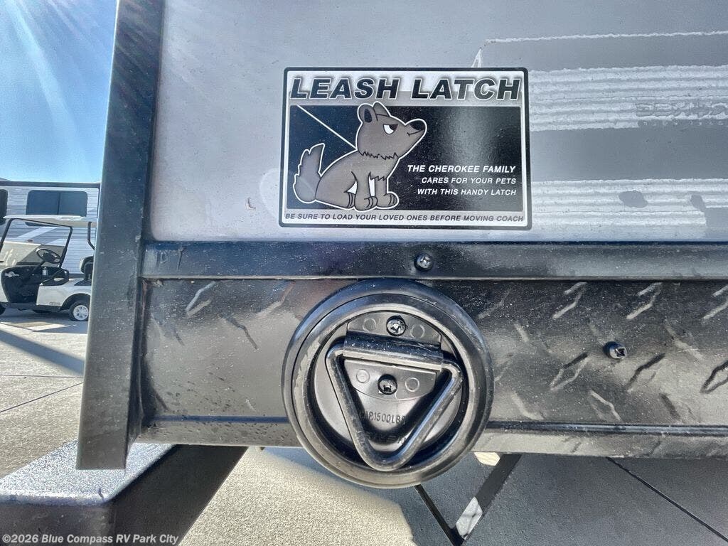 Come on inside this Cherokee Grey Wolf Black Label travel trailer and experience the convenience of a smooth flow of traffic in and out with two entry doors. The rear door leads into a full bath which is great for accessibility when outside and when you need to use the bathroom. Once inside, you will notice the large U-shaped dinette and the sofa which sit on the slide and create a spacious footprint for moving about, as well as great places to play games and socialize with your friends and family. A large pantry provides plenty of storage allowing you to stock up on your favorite snacks and dry goods for your family adventure. At night, there is sleeping space for everyone between the double-size bunks and the RV king bed, plus the furniture.