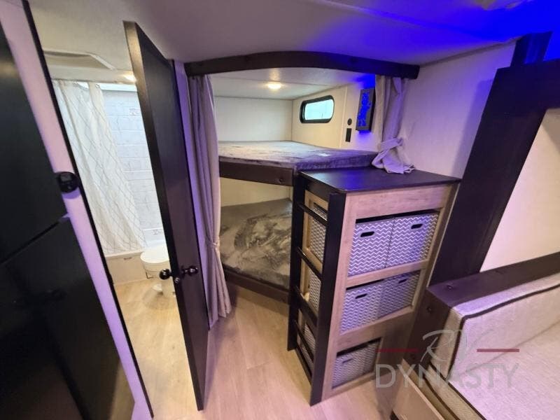 If you've been searching for a travel trailer with a larger sleeping capacity to camp with friends, this is the one! There are double-size bunks in the rear corner, and the full bath with its own exterior entry door is in the other rear corner for easy nighttime use. Up front, an RV king bed in the private bedroom is sure to bring a great night's rest, and you'll find a bedside wardrobe to keep your clothes picked up off of the floor. In the morning, everyone can meet in the main living room that includes a large slide out, U-shaped dinette, sofa, and a fireplace with a hidden pantry behind it for smart storage solutions. An outside kitchen will allow you to get some fresh air as you make dinner, but there's also a full interior kitchen if the weather isn't cooperating. Additional outdoor features include a rear storage rack, an outside TV mount, and a 15' awning for some shade!