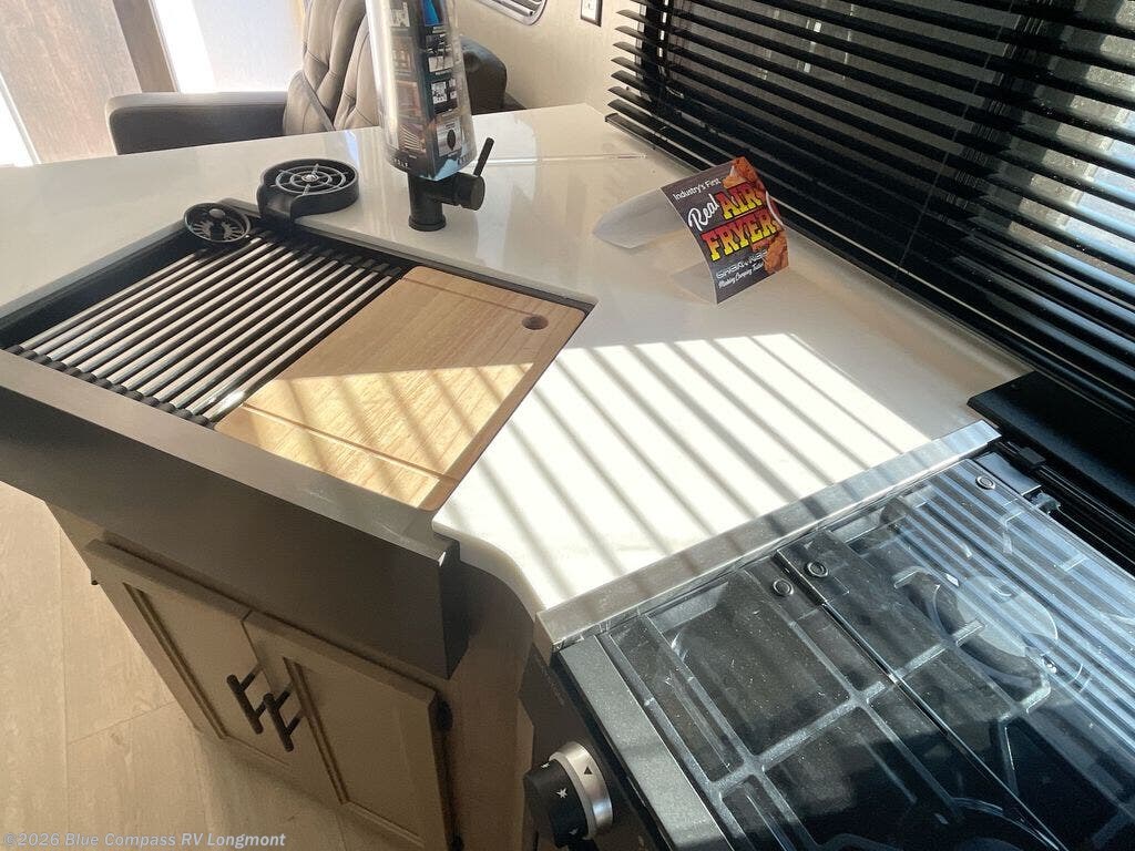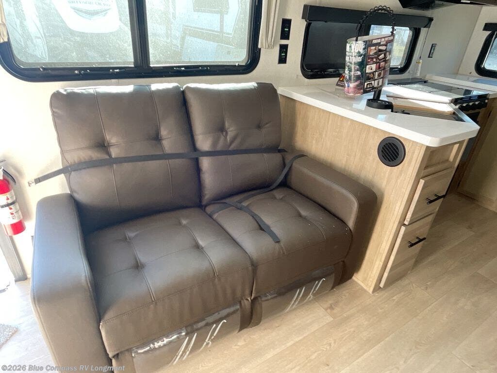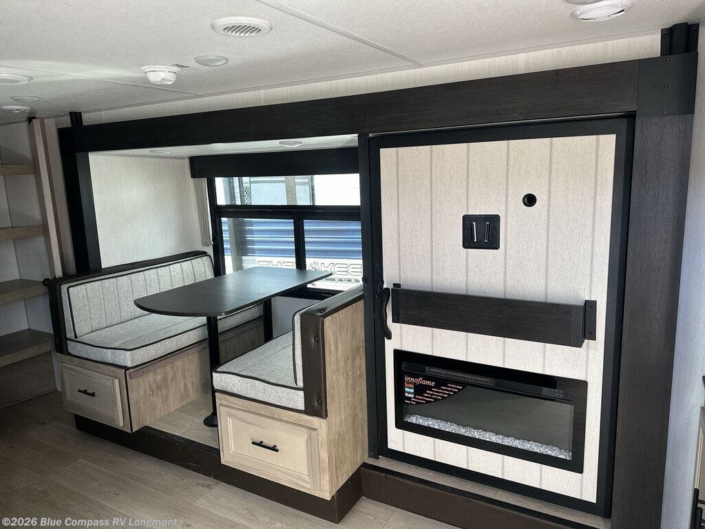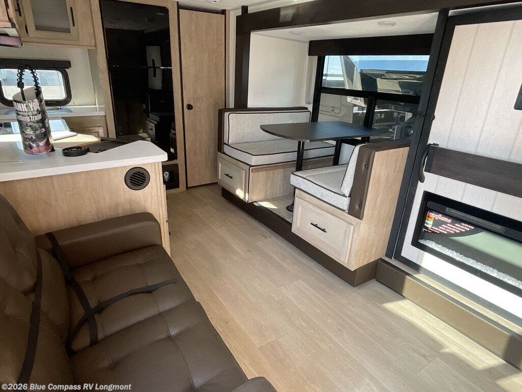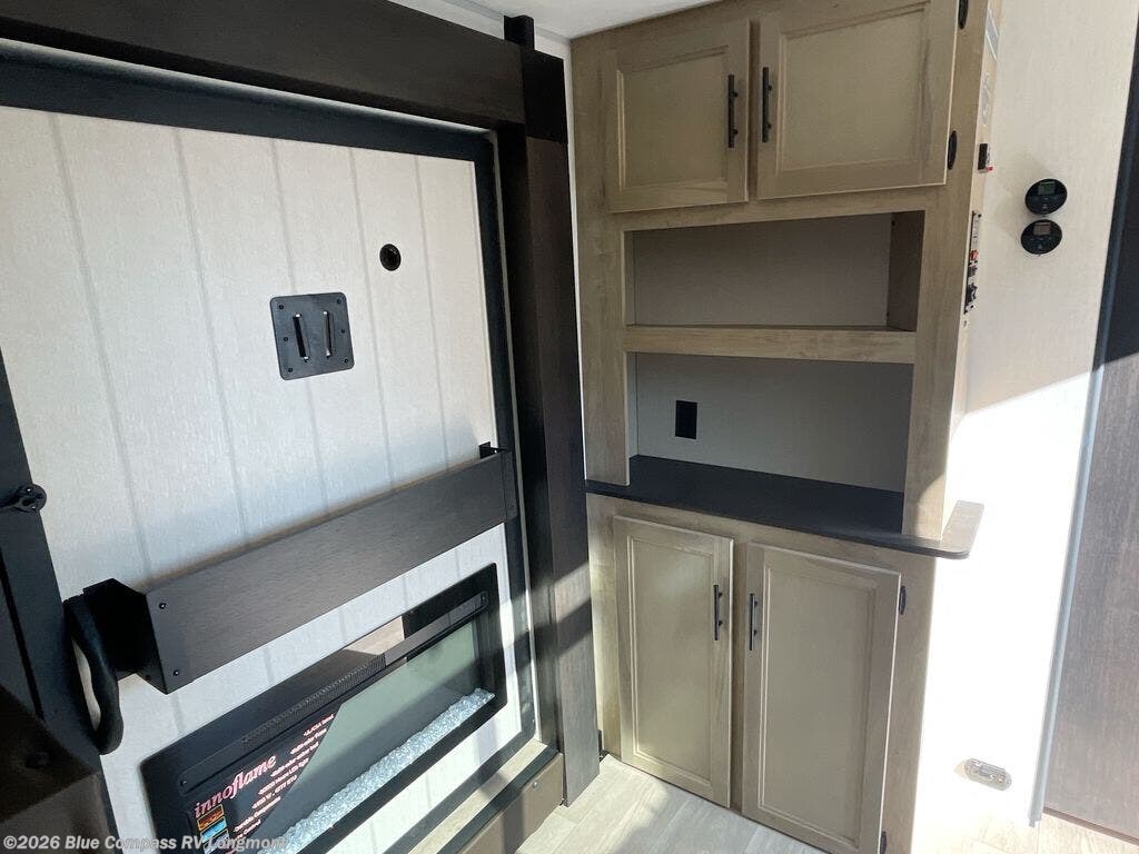 You'll love every minute spent in this single slide out travel trailer, whether you're cooking dinner on the outside kitchen or in the rear kitchen, relaxing on the sofa across from the fireplace, or sleeping on the RV king bed in the front master bedroom! There is a hidden pantry behind the fireplace for convenient storage, and the booth dinette within the slide provides a place to dine together. The walk-thru bath is spacious, and includes a tub/shower, toilet, and sink with counter space.