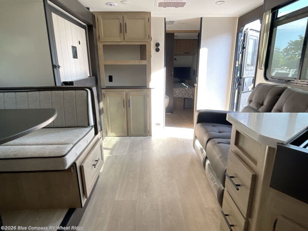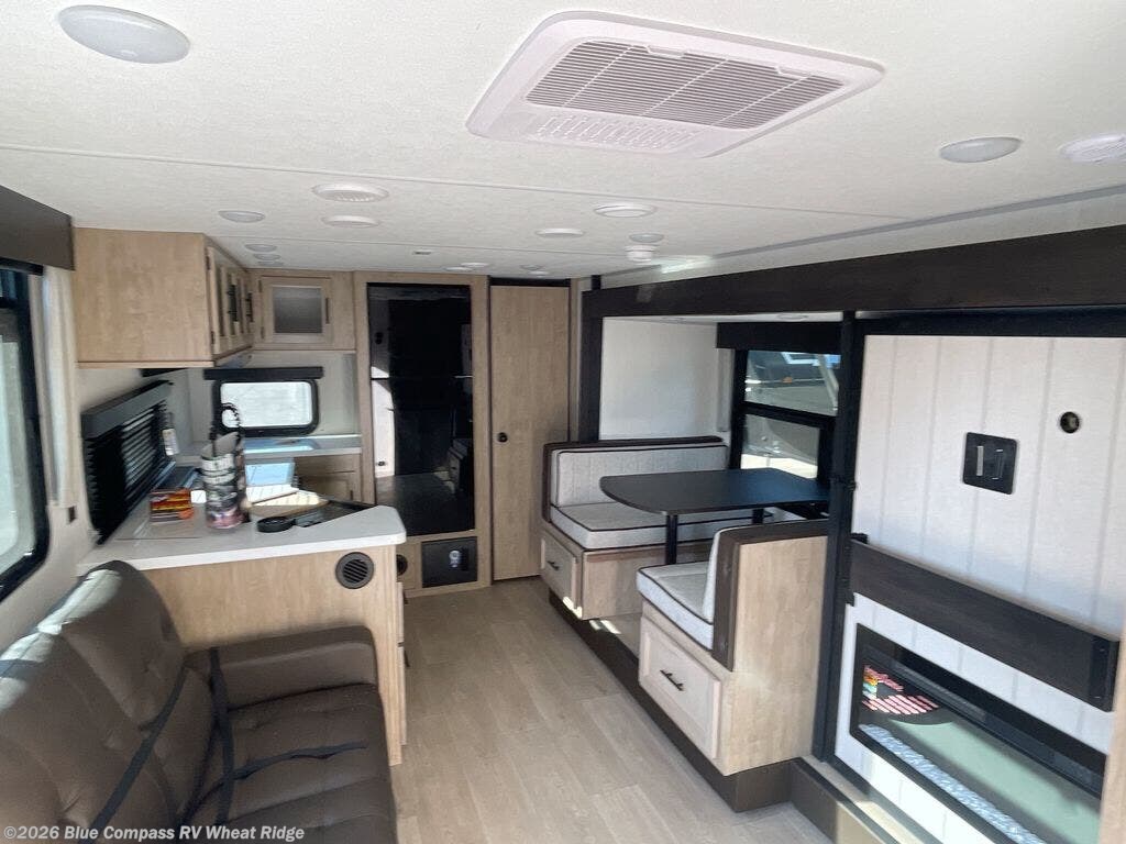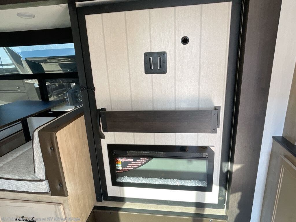 You'll love every minute spent in this single slide out travel trailer, whether you're cooking dinner on the outside kitchen or in the rear kitchen, relaxing on the sofa across from the fireplace, or sleeping on the RV king bed in the front master bedroom! There is a hidden pantry behind the fireplace for convenient storage, and the booth dinette within the slide provides a place to dine together. The walk-thru bath is spacious, and includes a tub/shower, toilet, and sink with counter space.
