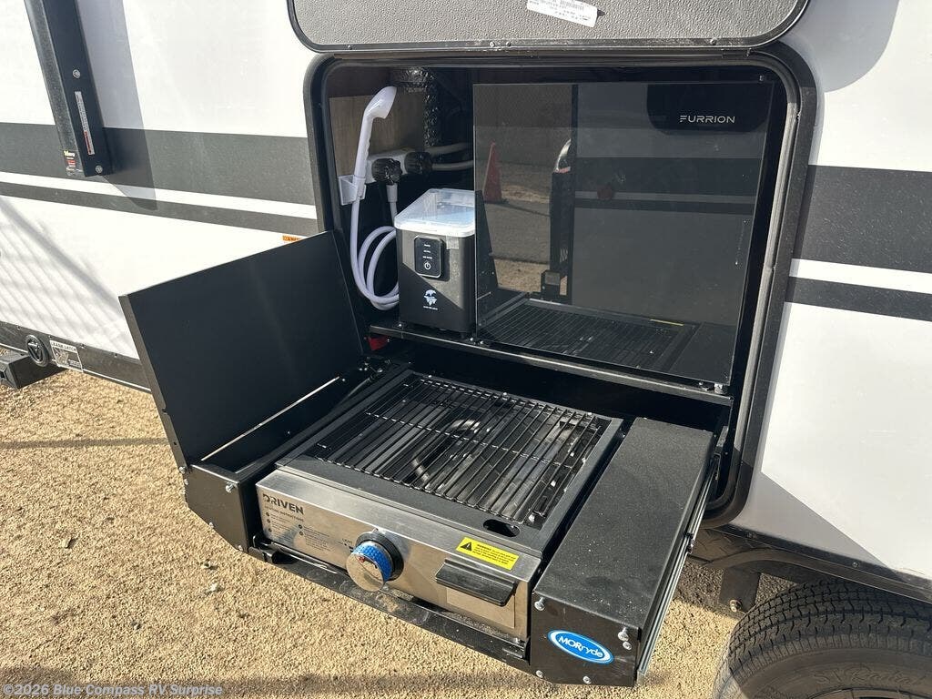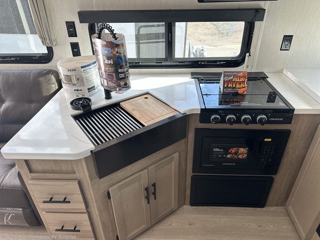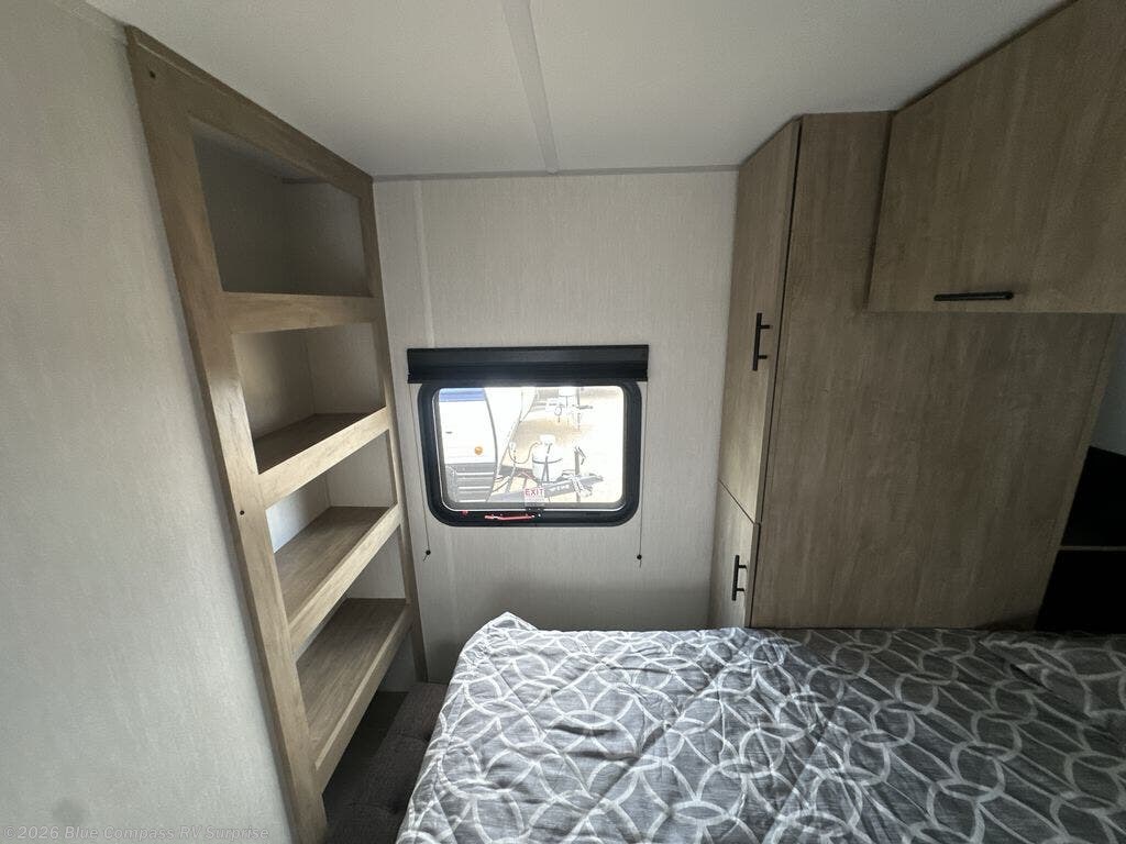 You'll love every minute spent in this single slide out travel trailer, whether you're cooking dinner on the outside kitchen or in the rear kitchen, relaxing on the sofa across from the fireplace, or sleeping on the RV king bed in the front master bedroom! There is a hidden pantry behind the fireplace for convenient storage, and the booth dinette within the slide provides a place to dine together. The walk-thru bath is spacious, and includes a tub/shower, toilet, and sink with counter space.