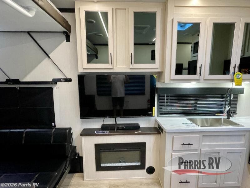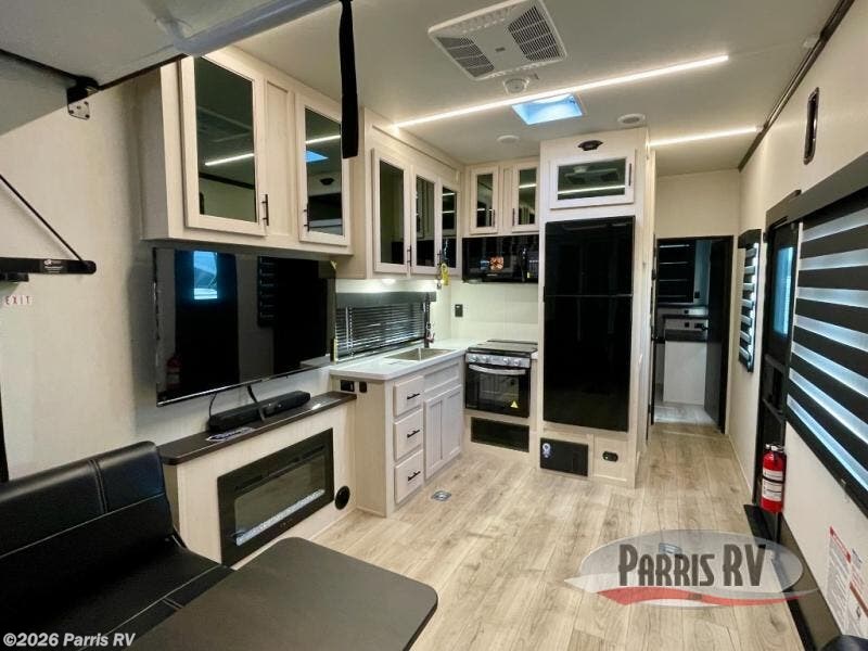 Head for the trails with this toy hauler in tow! Once your toys are unloaded from the 14' 1" garage, you can relax on the dual flip-up sofas with a queen bed above. There are also optional dual lounge chairs across from the entertainment center with a cozy fireplace! The chef of your crew can make meals inside on the three-burner cooktop, or head outdoors to utilize the outside kitchen. When you're ready to call it a night, retreat to the front private bedroom for a great night's rest on the trailer king bed slide out. There is also a large dresser here to keep your things organized.