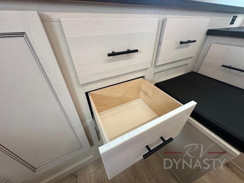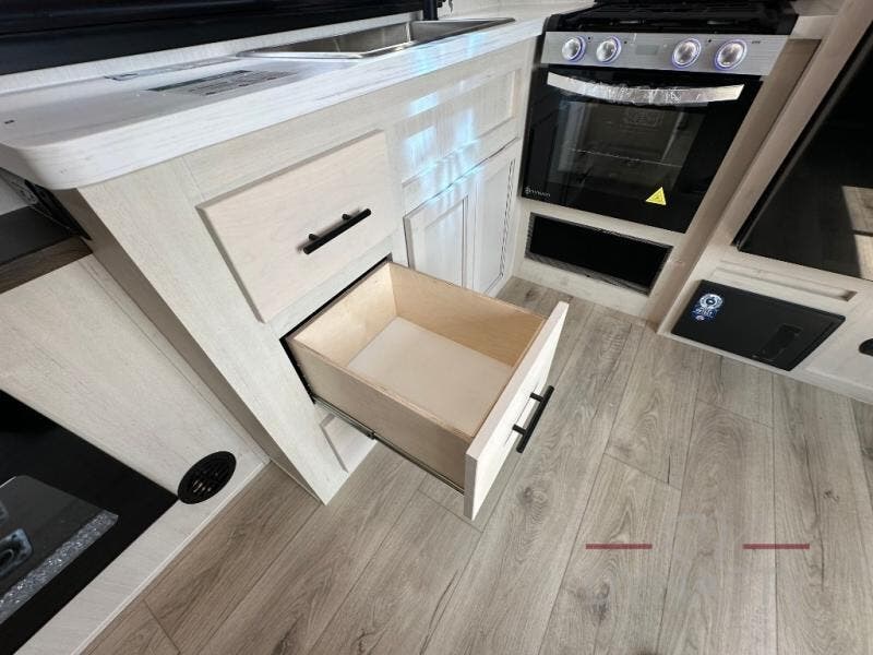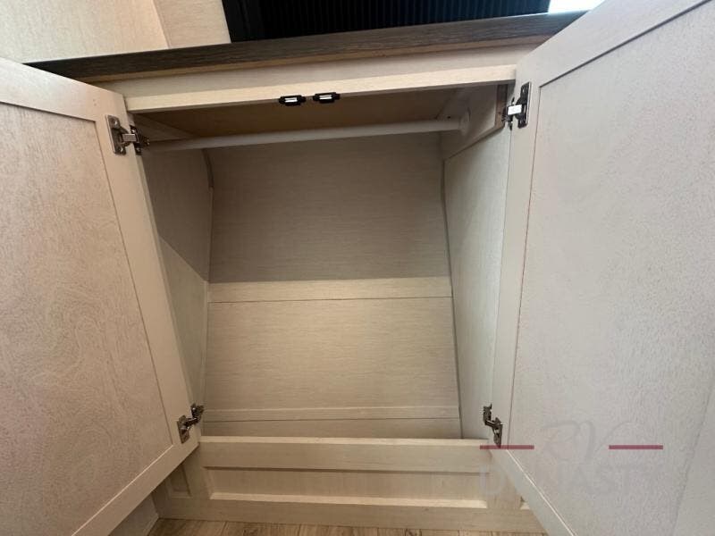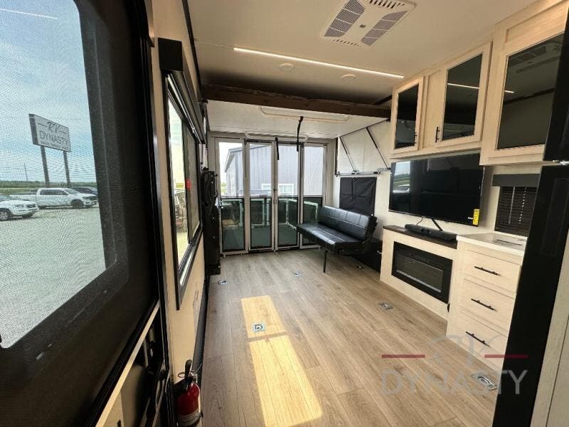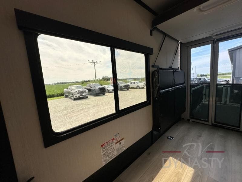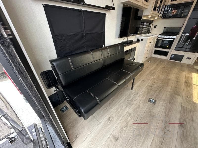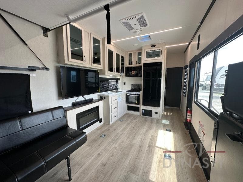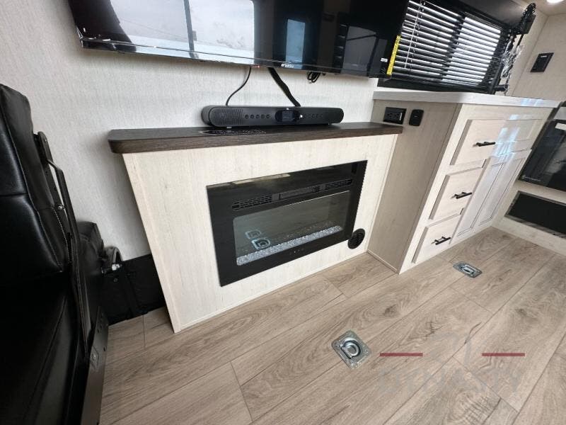 Head for the trails with this toy hauler in tow! Once your toys are unloaded from the 14' 1" garage, you can relax on the dual flip-up sofas with a queen bed above. There are also optional dual lounge chairs across from the entertainment center with a cozy fireplace! The chef of your crew can make meals inside on the three-burner cooktop, or head outdoors to utilize the outside kitchen. When you're ready to call it a night, retreat to the front private bedroom for a great night's rest on the trailer king bed slide out. There is also a large dresser here to keep your things organized.