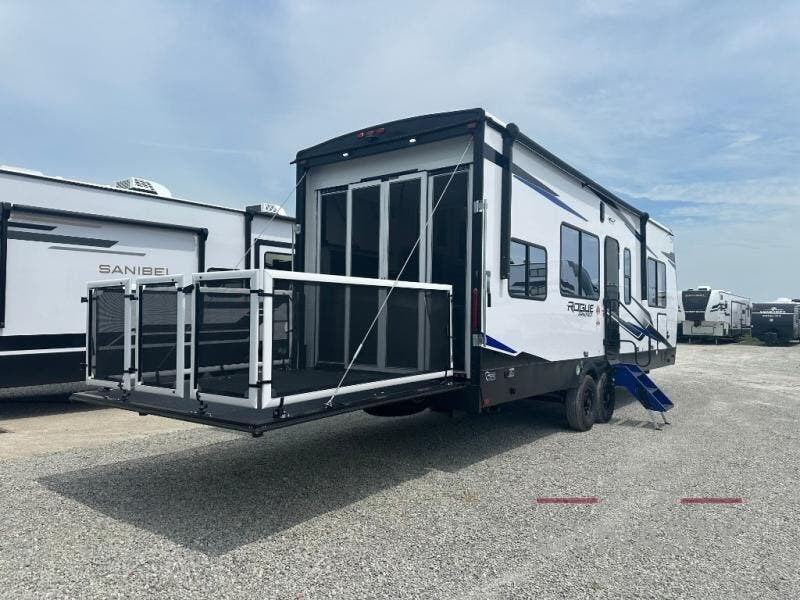 Every one of these Forest River Cherokee Rogue Armored travel trailer toy haulers come with the features you want most at an affordable price tag! The DuraPoxy gas/oil resistant floor has 5,000 lb. tie downs to ensure your toys will arrive safely without damaging the flooring, plus the 3,000 lb. rated ramp door makes it easy to load them. A 15,000 BTU A/C will keep you cool even on the hottest summer days, and there are heated enclosed holding tanks with 12V heat pads on every tank for added protection. Each model includes a fuel station with a digital readout, a ramp door patio system, a tire pressure monitoring system, and many more stand-out features. Inside, you'll find zebra shades in the living room, multiple USB charging stations, a multi-functional kitchen sink, glass shower doors, and many more comforts!