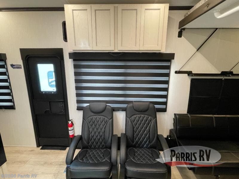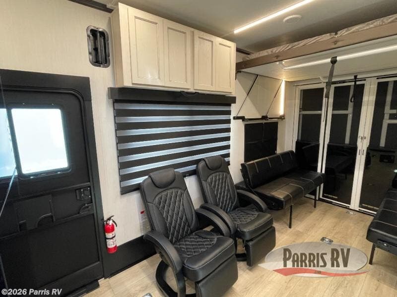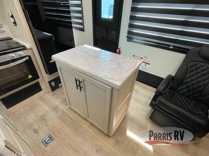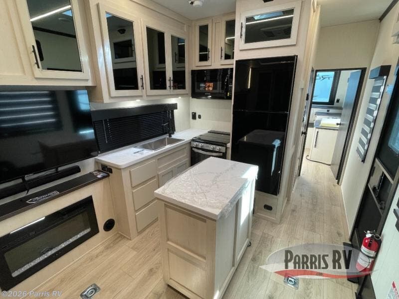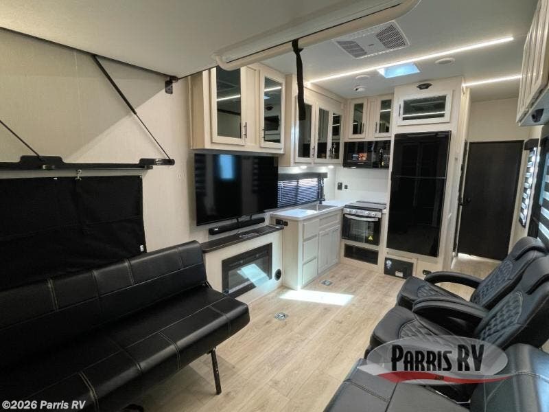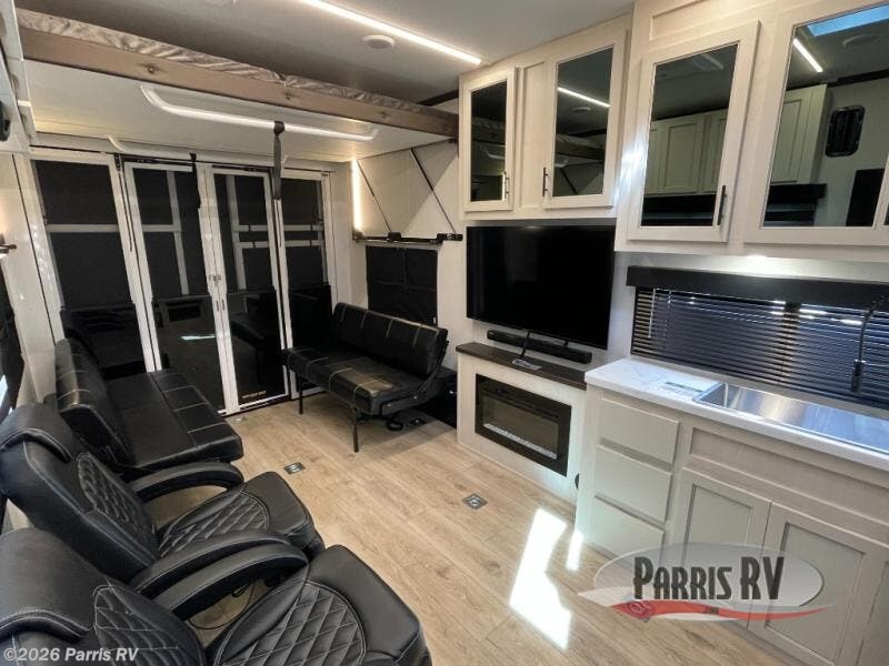 Head for the trails with this toy hauler in tow! Once your toys are unloaded from the 14' 1" garage, you can relax on the dual flip-up sofas with a queen bed above. There are also optional dual lounge chairs across from the entertainment center with a cozy fireplace! The chef of your crew can make meals inside on the three-burner cooktop, or head outdoors to utilize the outside kitchen. When you're ready to call it a night, retreat to the front private bedroom for a great night's rest on the trailer king bed slide out. There is also a large dresser here to keep your things organized.