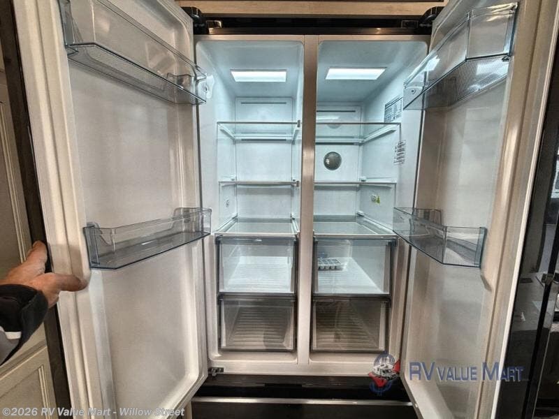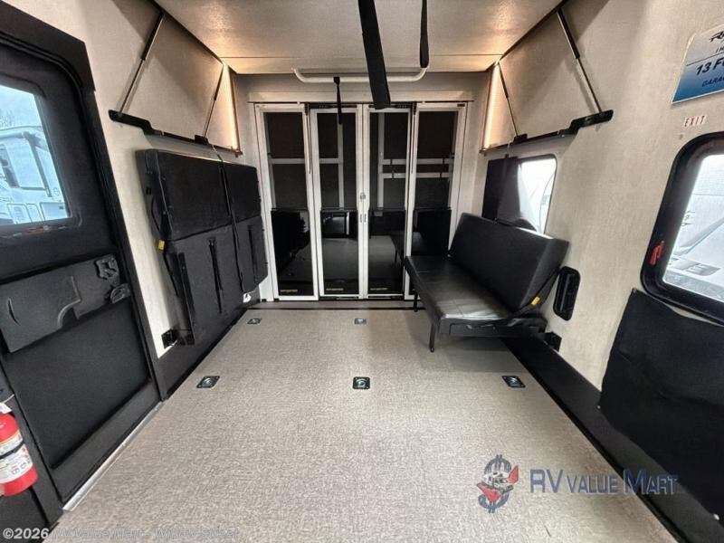 There is ample space in this triple slide out toy hauler for toys, gear, friends and more! The front private bedroom has a king bed slide to lay your head on at night, a front wall wardrobe, a dresser to keep your clothes looking nice, plus an entrance into the bathroom. The kitchen has a counter peninsula to prepare your meals, and a 12V glass residential-style refrigerator to store any leftovers. The garage area has a loft, opposing flip-up sofas with a table in between and a raised queen bed above them, as well as a second entry door. And the half bath/utility bath is an extra bonus when camping with friends!