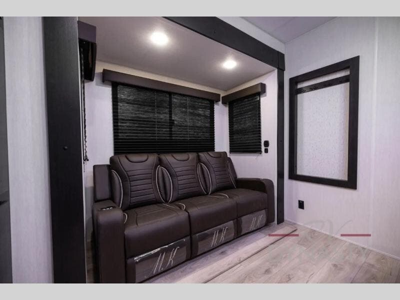 This dual entry toy hauler is perfect for weekends at the lake. The separate garage features two flip-up sofas plus a free-standing table and a quick set rear bed system for more sleeping space. There is also a TV mount here if you want to add a television and gear storage to keep your items organized. A sofa slide out in the main living area will provide comfortable seating space, and the full kitchen will let you create yummy meals. You'll love the dual entry bath that will create a front master bedroom, complete with a king bed and dual wardrobes for your clothes!