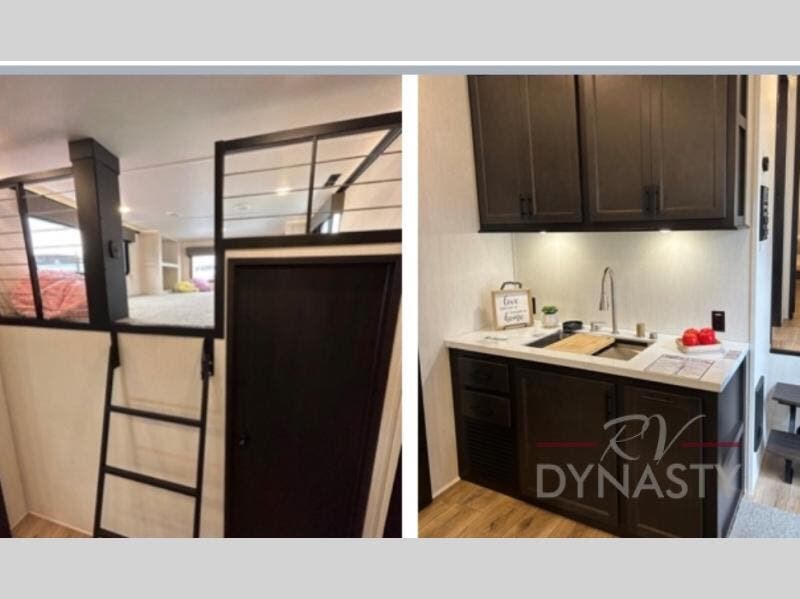 Are you looking for a fifth wheel where you can bring along your neighbor friends? You can do just that since there are two bedrooms in this unit, one of which includes a master bath with its own exterior entry door! The front bedroom is right next to the second full bath for convenience, and includes a camper king bed slide, a dresser, and front wardrobe. The rear master bedroom has a queen bed slide out across from a second slide for more floor space, and there is a loft above this room for more sleeping or storage space. Everyone can meet in the middle kitchen and living room since there are recliners, a ceiling fan, and kitchen island with four chairs. There is also storage below the island for kitchen necessities, and the hidden pantry behind the TV will be perfect for snacks, board games and more!