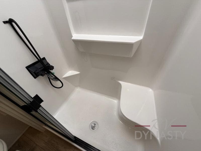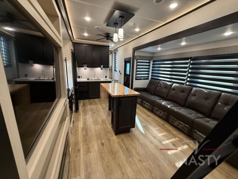 Are you looking for a fifth wheel where you can bring along your neighbor friends? You can do just that since there are two bedrooms in this unit, one of which includes a master bath with its own exterior entry door! The front bedroom is right next to the second full bath for convenience, and includes a camper king bed slide, a dresser, and front wardrobe. The rear master bedroom has a queen bed slide out across from a second slide for more floor space, and there is a loft above this room for more sleeping or storage space. Everyone can meet in the middle kitchen and living room since there are recliners, a ceiling fan, and kitchen island with four chairs. There is also storage below the island for kitchen necessities, and the hidden pantry behind the TV will be perfect for snacks, board games and more!