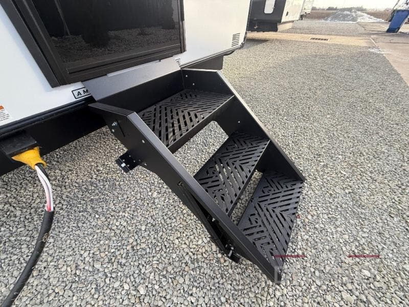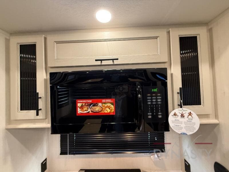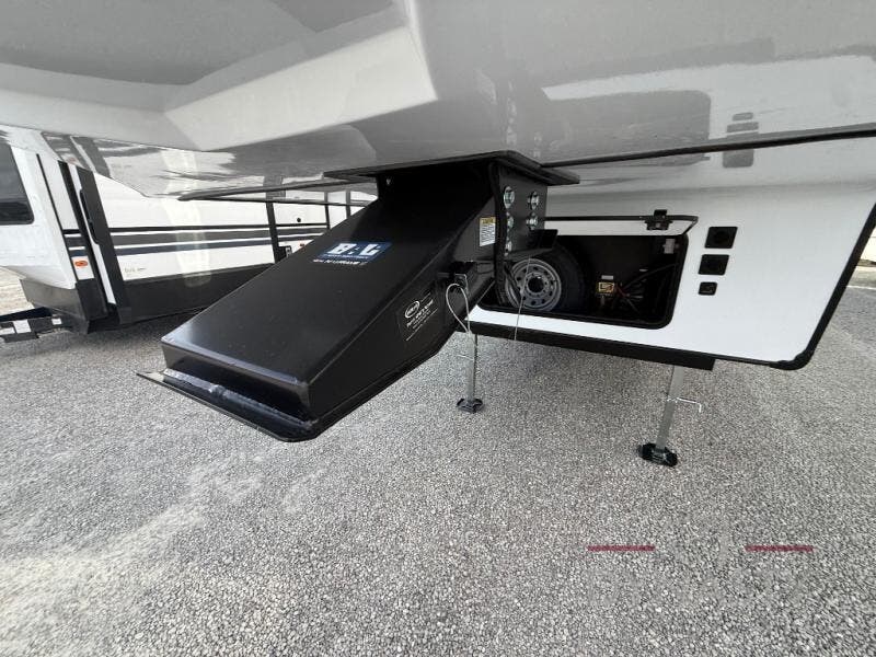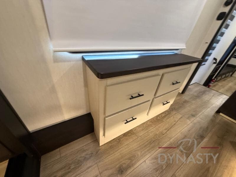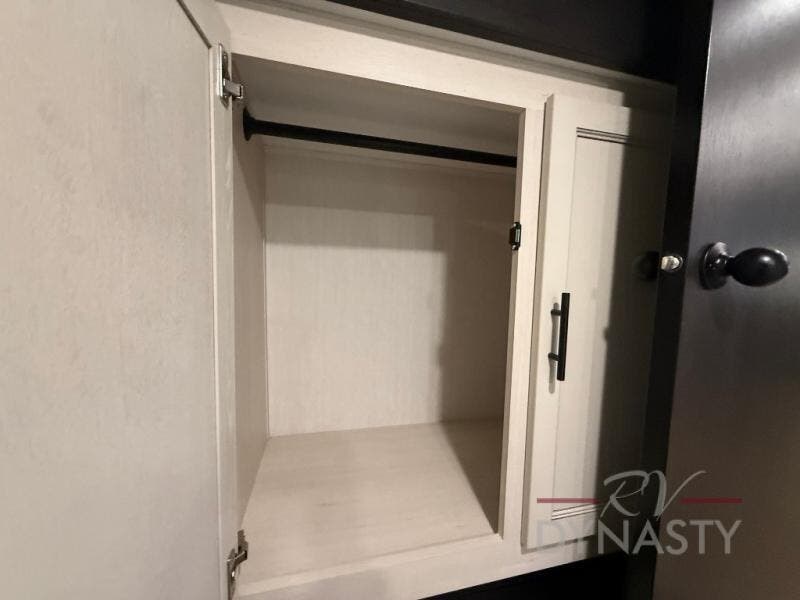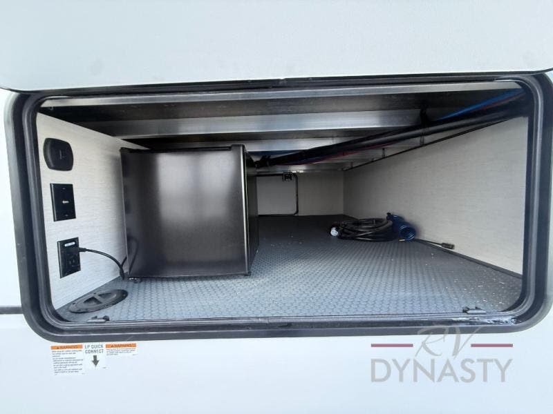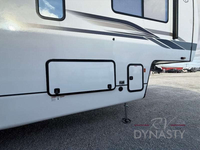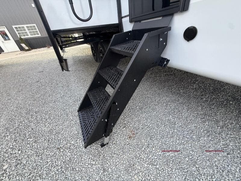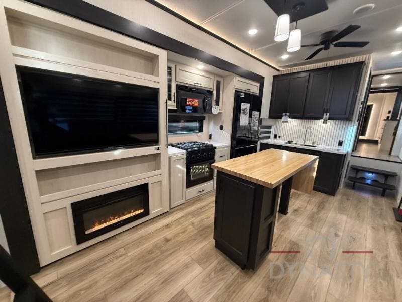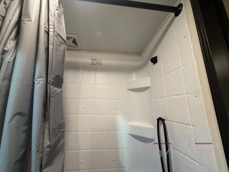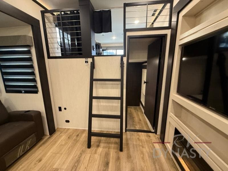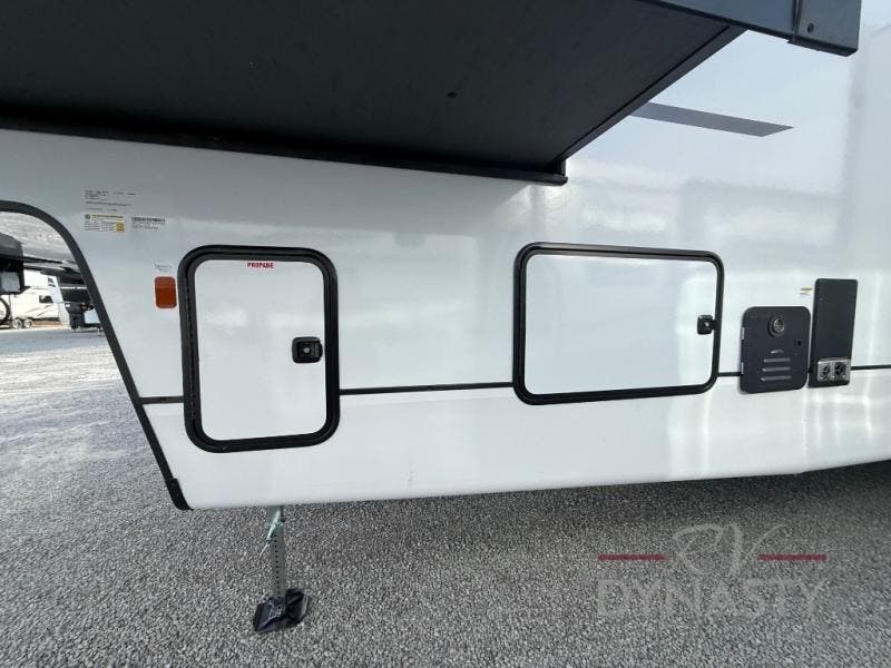 Are you looking for a fifth wheel where you can bring along your neighbor friends? You can do just that since there are two bedrooms in this unit, one of which includes a master bath with its own exterior entry door! The front bedroom is right next to the second full bath for convenience, and includes a camper king bed slide, a dresser, and front wardrobe. The rear master bedroom has a queen bed slide out across from a second slide for more floor space, and there is a loft above this room for more sleeping or storage space. Everyone can meet in the middle kitchen and living room since there are recliners, a ceiling fan, and kitchen island with four chairs. There is also storage below the island for kitchen necessities, and the hidden pantry behind the TV will be perfect for snacks, board games and more!