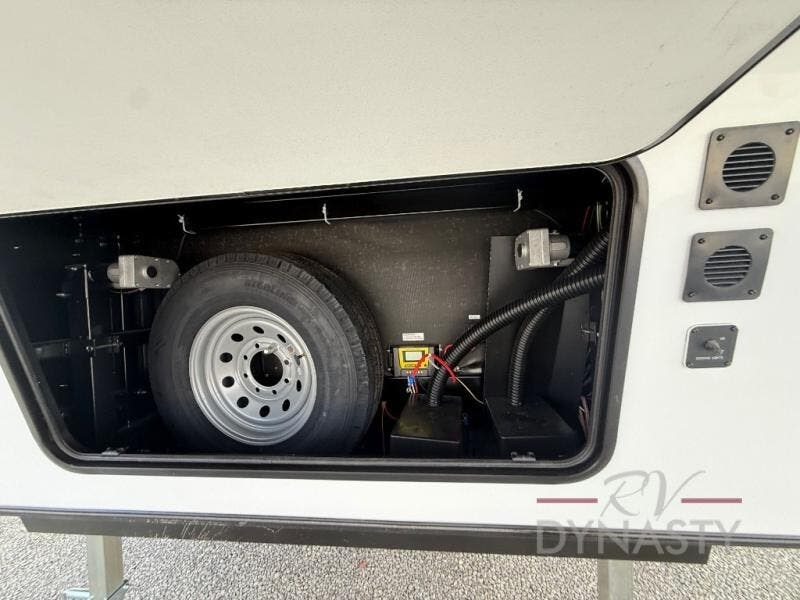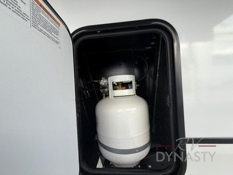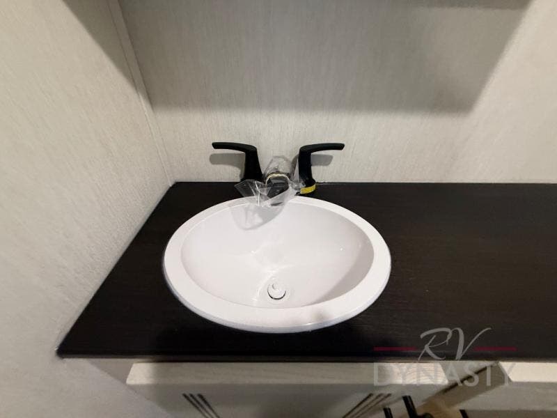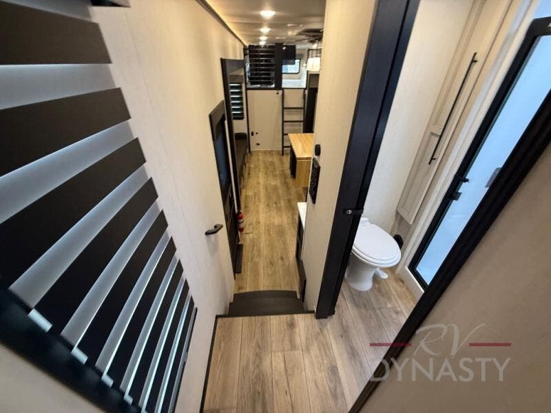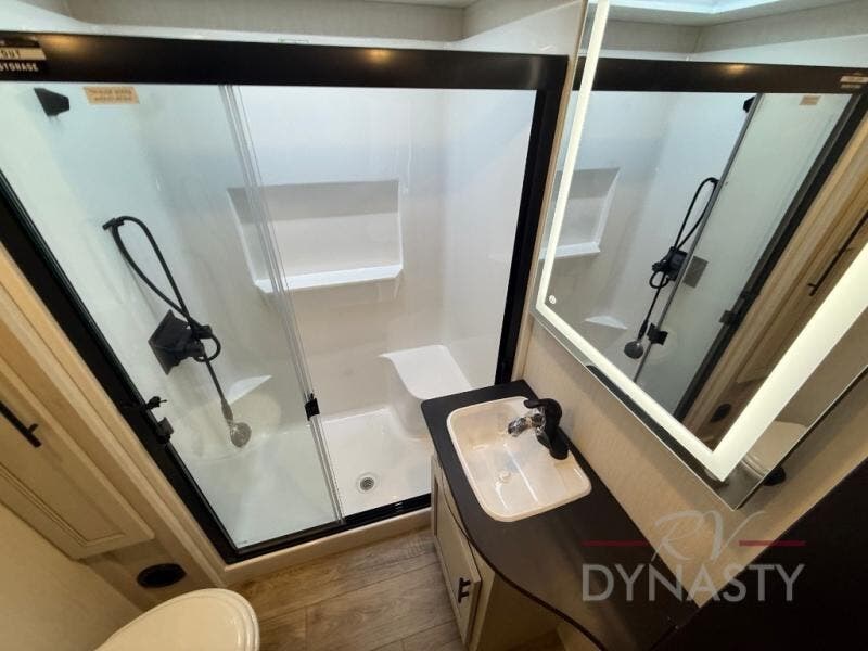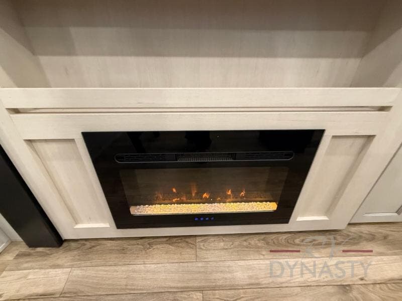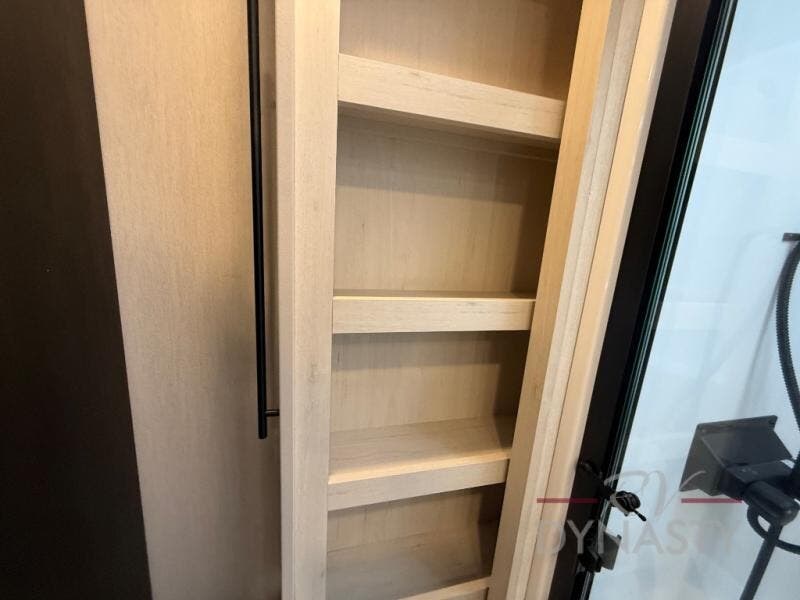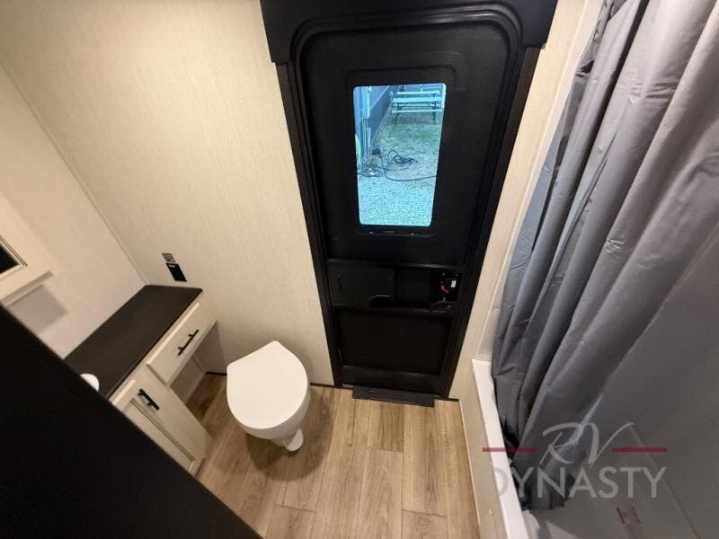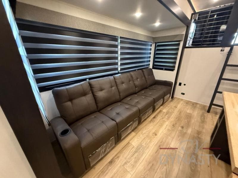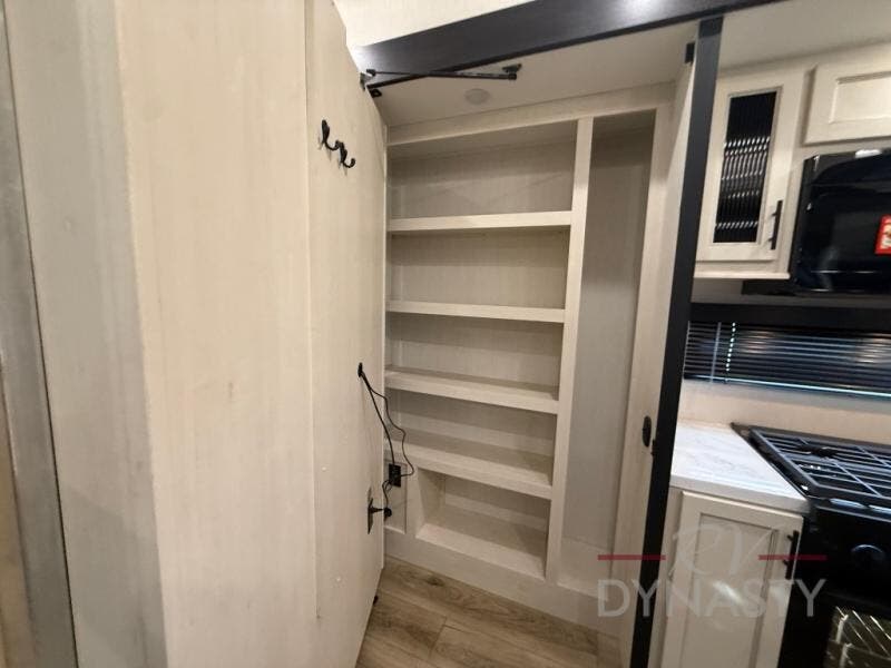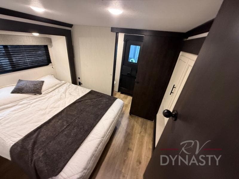 Are you looking for a fifth wheel where you can bring along your neighbor friends? You can do just that since there are two bedrooms in this unit, one of which includes a master bath with its own exterior entry door! The front bedroom is right next to the second full bath for convenience, and includes a camper king bed slide, a dresser, and front wardrobe. The rear master bedroom has a queen bed slide out across from a second slide for more floor space, and there is a loft above this room for more sleeping or storage space. Everyone can meet in the middle kitchen and living room since there are recliners, a ceiling fan, and kitchen island with four chairs. There is also storage below the island for kitchen necessities, and the hidden pantry behind the TV will be perfect for snacks, board games and more!