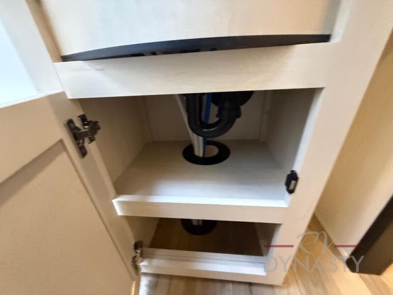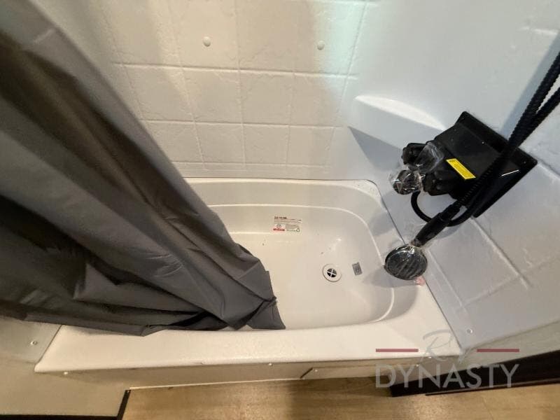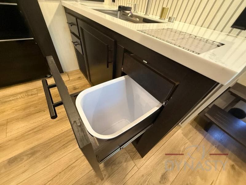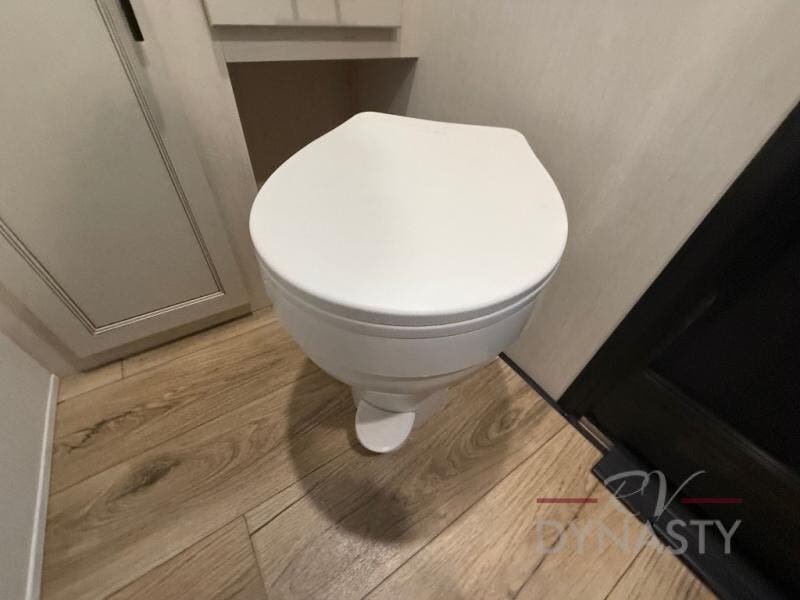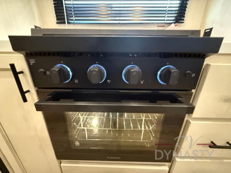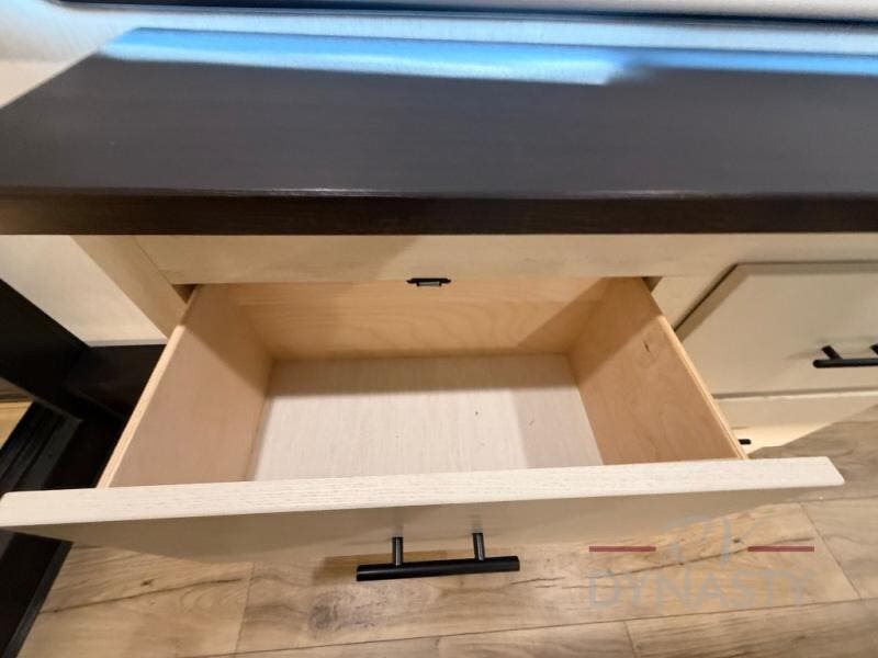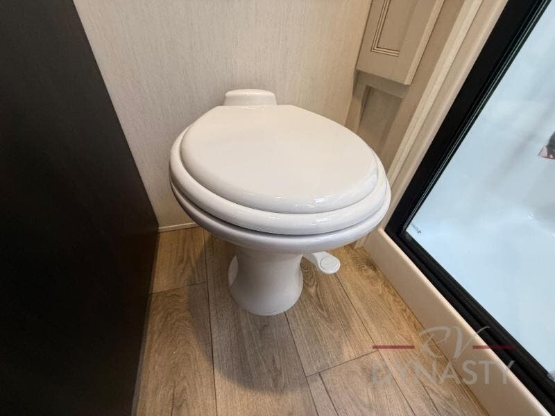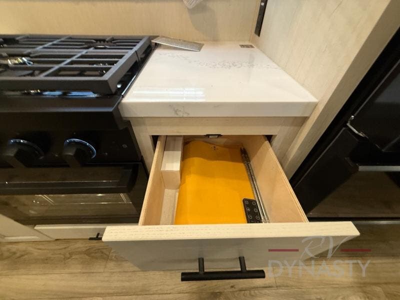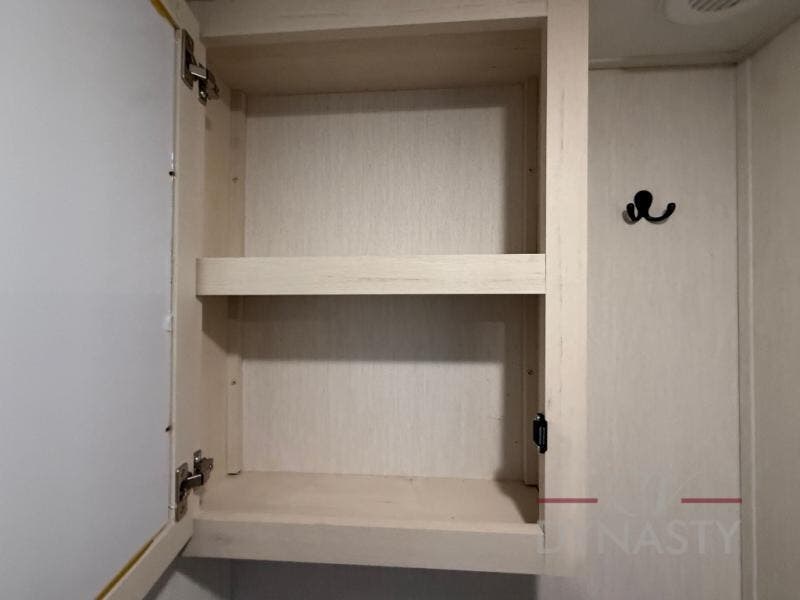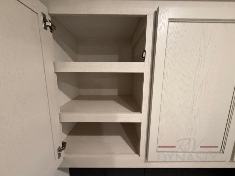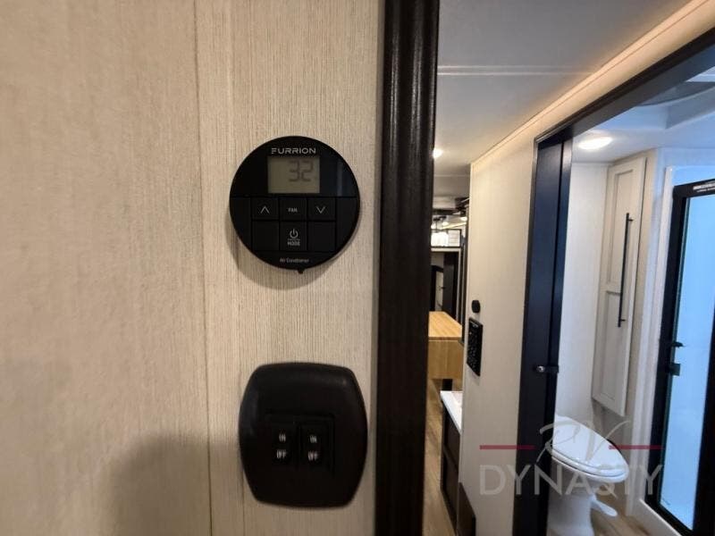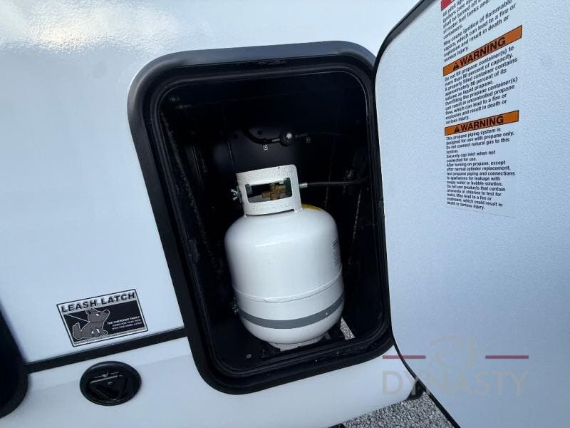 Are you looking for a fifth wheel where you can bring along your neighbor friends? You can do just that since there are two bedrooms in this unit, one of which includes a master bath with its own exterior entry door! The front bedroom is right next to the second full bath for convenience, and includes a camper king bed slide, a dresser, and front wardrobe. The rear master bedroom has a queen bed slide out across from a second slide for more floor space, and there is a loft above this room for more sleeping or storage space. Everyone can meet in the middle kitchen and living room since there are recliners, a ceiling fan, and kitchen island with four chairs. There is also storage below the island for kitchen necessities, and the hidden pantry behind the TV will be perfect for snacks, board games and more!