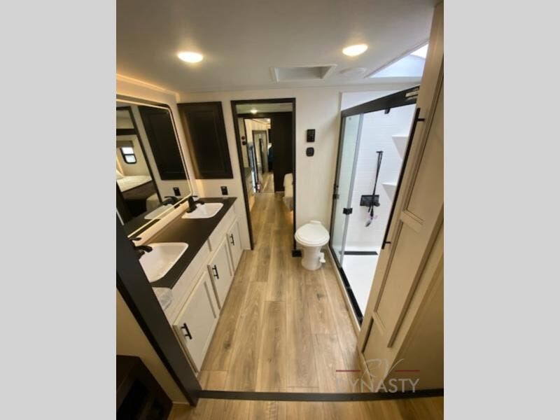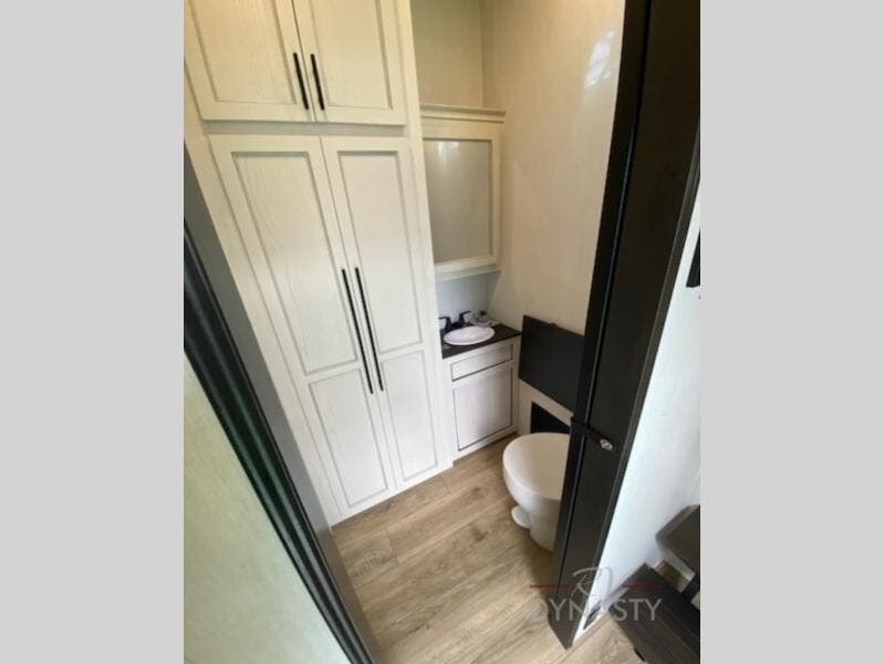 Get ready to elevate your travels to new heights with this show-stopping fifth wheel, designed for thrill-seekers. The rear kitchen is a culinary powerhouse, featuring a spacious layout, overhead cabinets, ample countertop, three-burner cooktop, microwave, oversized fridge, and pantry. In the living area section, the sectional sofa creates a warm and inviting space, perfect for socializing, relaxing, and making memories. The fireplace crackles with warmth, while the entertainment center provides endless entertainment options. Also, the dinette is a charming spot for meals, laughter, and storytelling. Unwind and recharge in style, with plenty of room to get ready for the day ahead, thanks to the full bath with dual sinks, ample dresser space, and a half-bath in the middle of this unit for added convenience. Moving to the main bedroom, the camper king bed is perfect for a restful night's sleep, and the dresser with hidden storage keeps your belongings organized, while the projector above the dresser adds a touch of magic to movie nights.