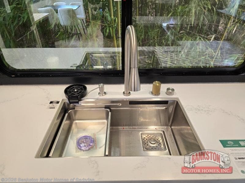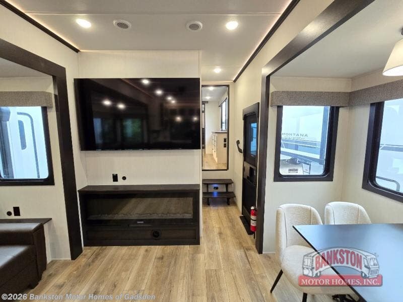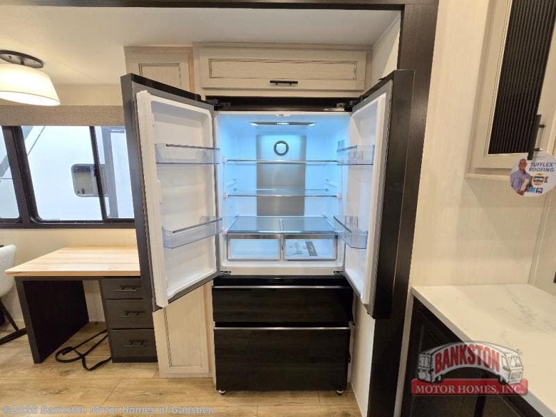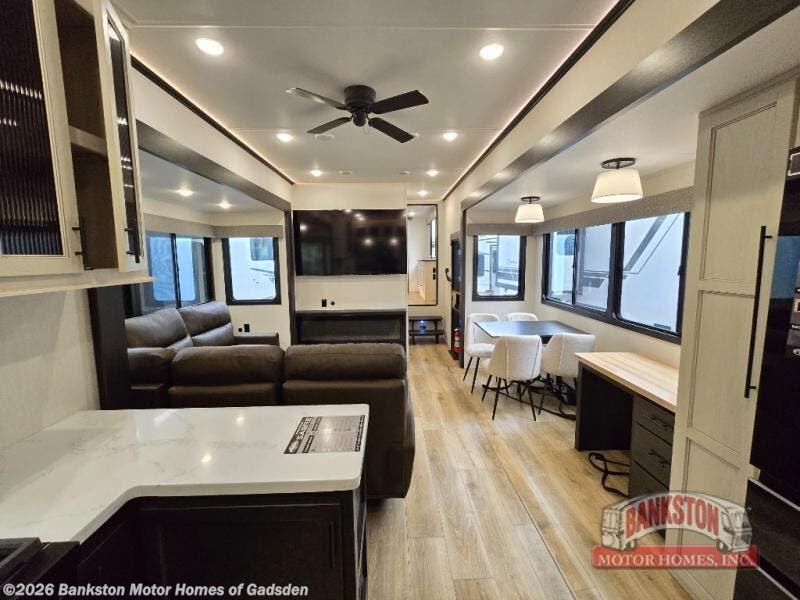 Get ready to elevate your travels to new heights with this show-stopping fifth wheel, designed for thrill-seekers. The rear kitchen is a culinary powerhouse, featuring a spacious layout, overhead cabinets, ample countertop, three-burner cooktop, microwave, oversized fridge, and pantry. In the living area section, the sectional sofa creates a warm and inviting space, perfect for socializing, relaxing, and making memories. The fireplace crackles with warmth, while the entertainment center provides endless entertainment options. Also, the dinette is a charming spot for meals, laughter, and storytelling. Unwind and recharge in style, with plenty of room to get ready for the day ahead, thanks to the full bath with dual sinks, ample dresser space, and a half-bath in the middle of this unit for added convenience. Moving to the main bedroom, the camper king bed is perfect for a restful night's sleep, and the dresser with hidden storage keeps your belongings organized, while the projector above the dresser adds a touch of magic to movie nights.