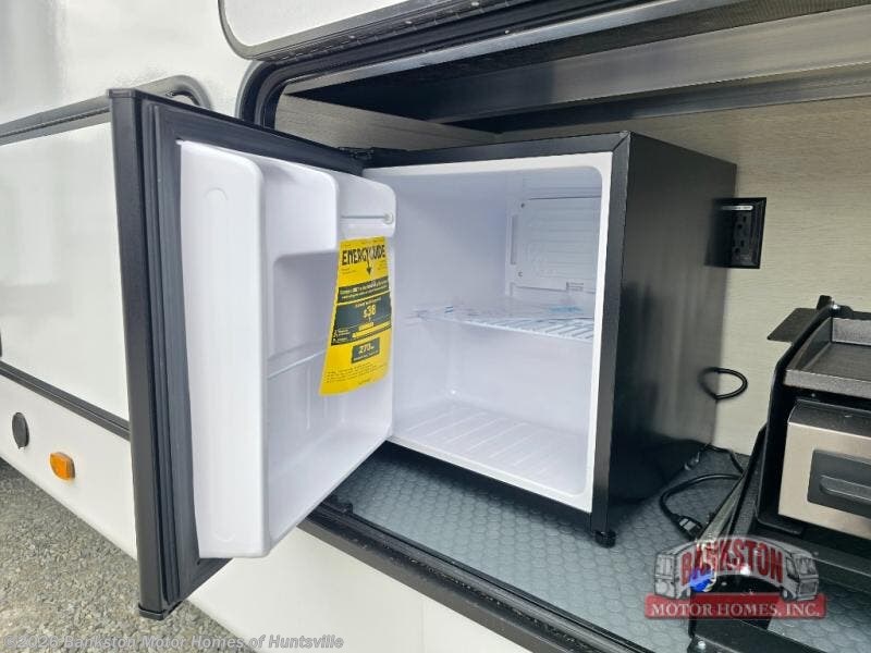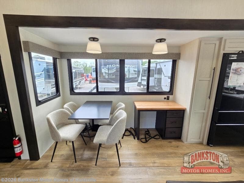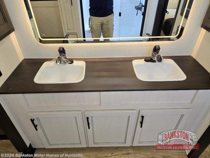 Get ready to elevate your travels to new heights with this show-stopping fifth wheel, designed for thrill-seekers. The rear kitchen is a culinary powerhouse, featuring a spacious layout, overhead cabinets, ample countertop, three-burner cooktop, microwave, oversized fridge, and pantry. In the living area section, the sectional sofa creates a warm and inviting space, perfect for socializing, relaxing, and making memories. The fireplace crackles with warmth, while the entertainment center provides endless entertainment options. Also, the dinette is a charming spot for meals, laughter, and storytelling. Unwind and recharge in style, with plenty of room to get ready for the day ahead, thanks to the full bath with dual sinks, ample dresser space, and a half-bath in the middle of this unit for added convenience. Moving to the main bedroom, the camper king bed is perfect for a restful night's sleep, and the dresser with hidden storage keeps your belongings organized, while the projector above the dresser adds a touch of magic to movie nights.