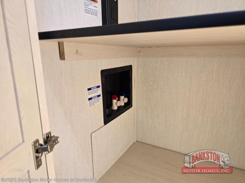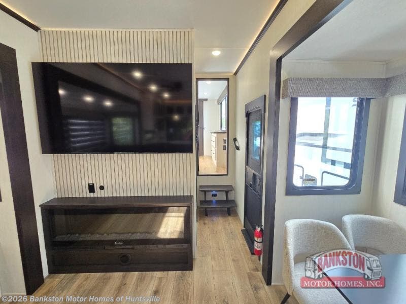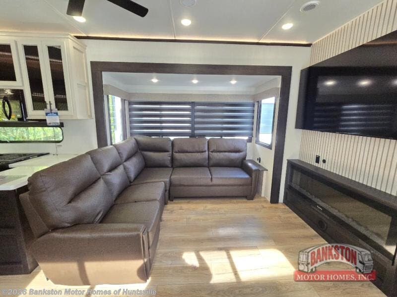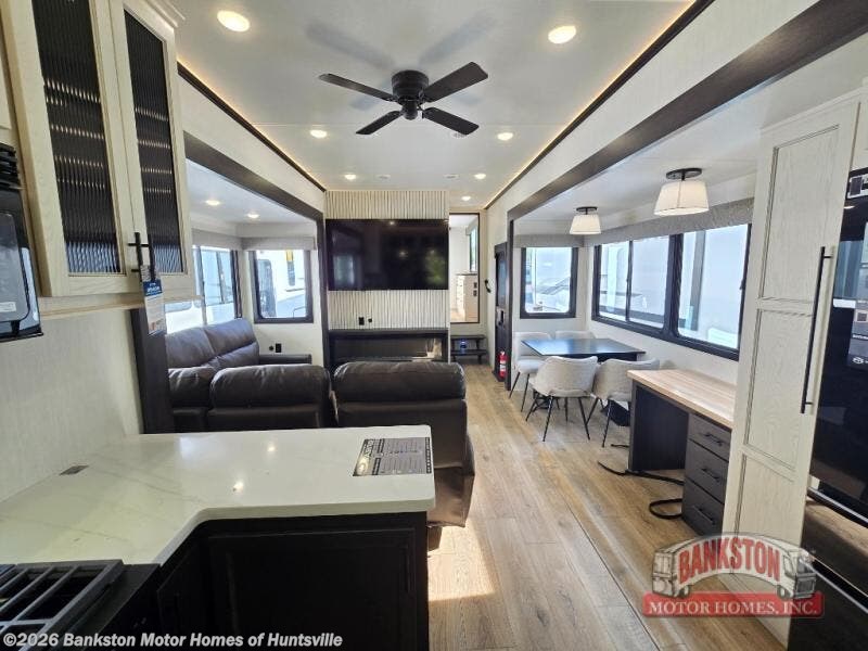 Get ready to elevate your travels to new heights with this show-stopping fifth wheel, designed for thrill-seekers. The rear kitchen is a culinary powerhouse, featuring a spacious layout, overhead cabinets, ample countertop, three-burner cooktop, microwave, oversized fridge, and pantry. In the living area section, the sectional sofa creates a warm and inviting space, perfect for socializing, relaxing, and making memories. The fireplace crackles with warmth, while the entertainment center provides endless entertainment options. Also, the dinette is a charming spot for meals, laughter, and storytelling. Unwind and recharge in style, with plenty of room to get ready for the day ahead, thanks to the full bath with dual sinks, ample dresser space, and a half-bath in the middle of this unit for added convenience. Moving to the main bedroom, the camper king bed is perfect for a restful night's sleep, and the dresser with hidden storage keeps your belongings organized, while the projector above the dresser adds a touch of magic to movie nights.