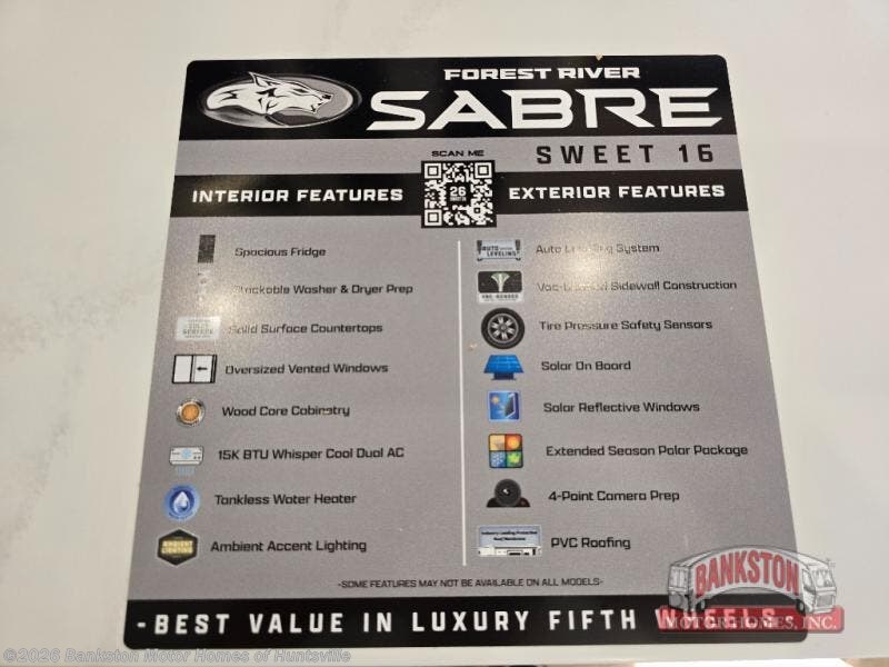 Request More Info on this 2026 Forest River Cherokee Sabre 36EST Offered for sale by Bankston Motor Homes of Huntsville