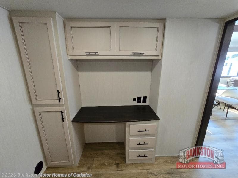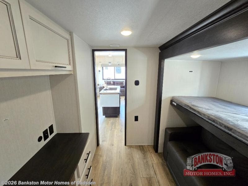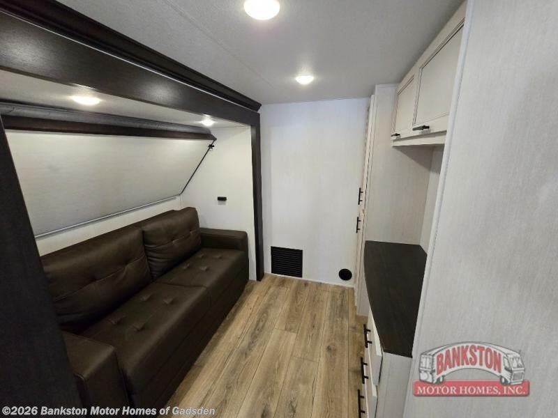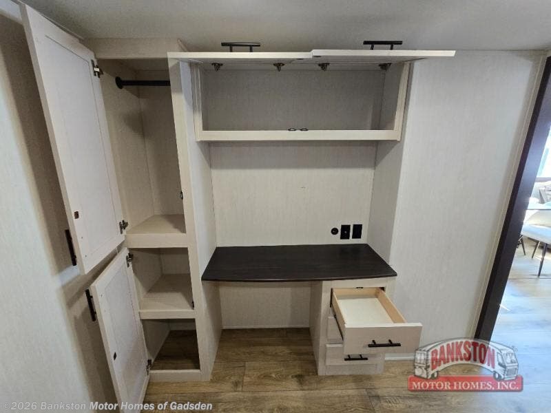 There is much to love in this fifth wheel! Starting with the second bedroom which has a slide that houses a flip-up bunk above a tri-fold sofa across from a desk with drawers, a drop zone, and a wardrobe, plus above all of that is a storage/bunk loft. The rear living area includes a tri-fold sofa, a TV with a hidden pantry behind, and theater seating for two making this space another area at night for guests. In the morning, you can prepare breakfast on the kitchen island, then dine together at the versatile dinette/desk. The full bath will allow you to stay clean throughout your trip, and you'll feel right at home in the front private bedroom with a camper king bed, a dresser, and front wardrobe. Outside, a kitchen and two power awnings create an inviting space!