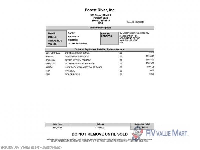 Request More Info on this 2026 Forest River Cherokee Sabre 36FLX Offered for sale by RV Value Mart - Behtlehem